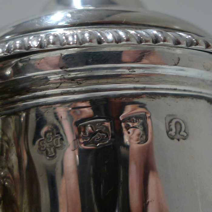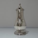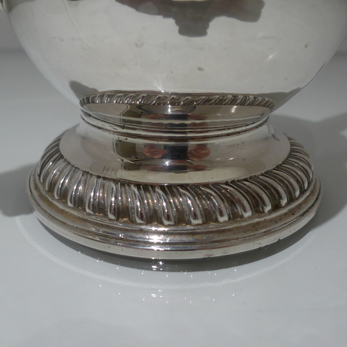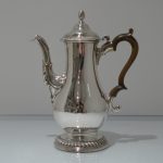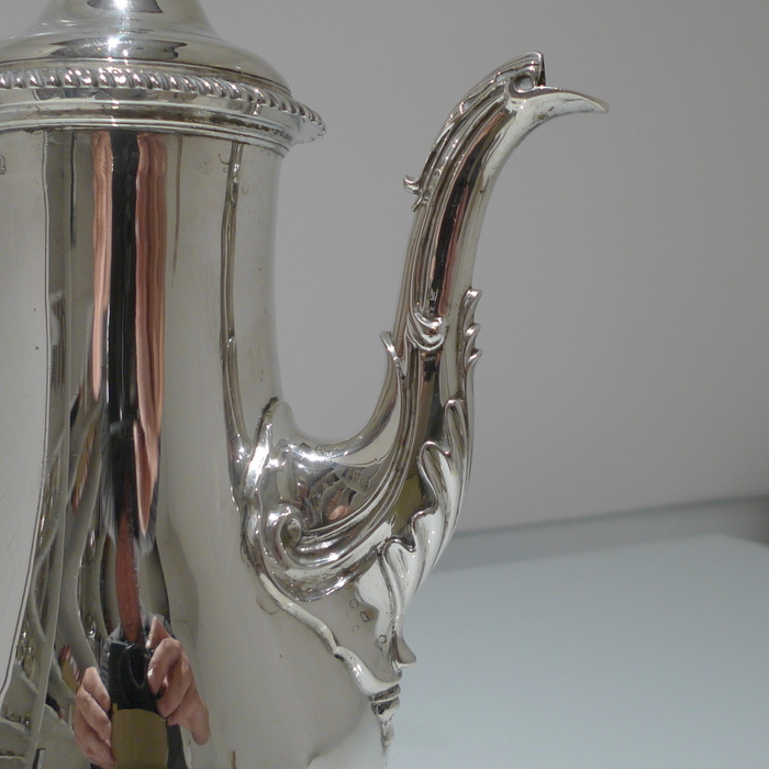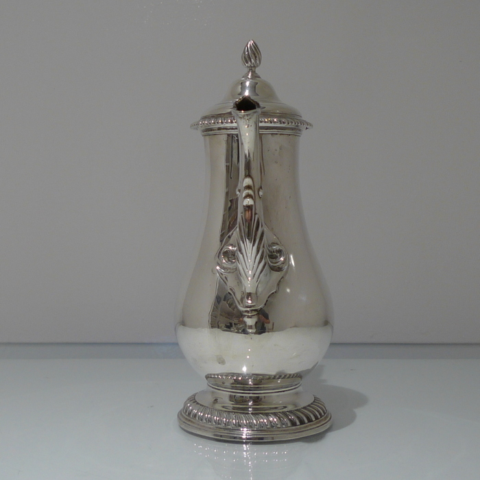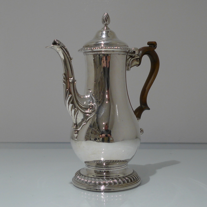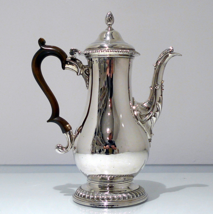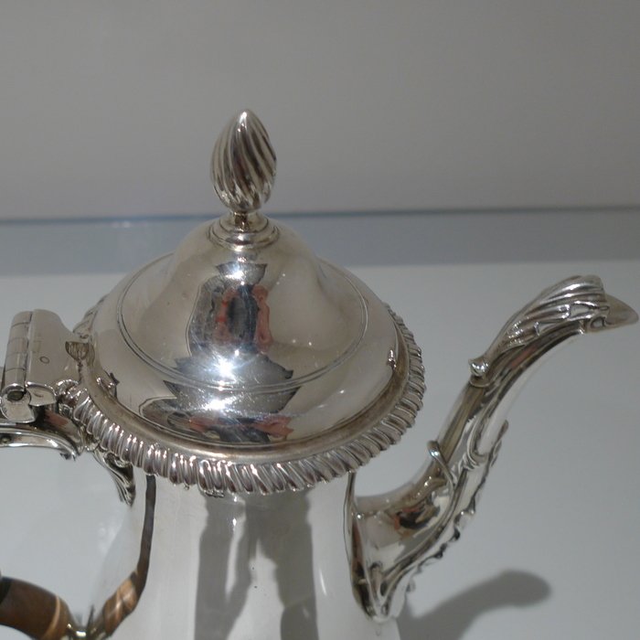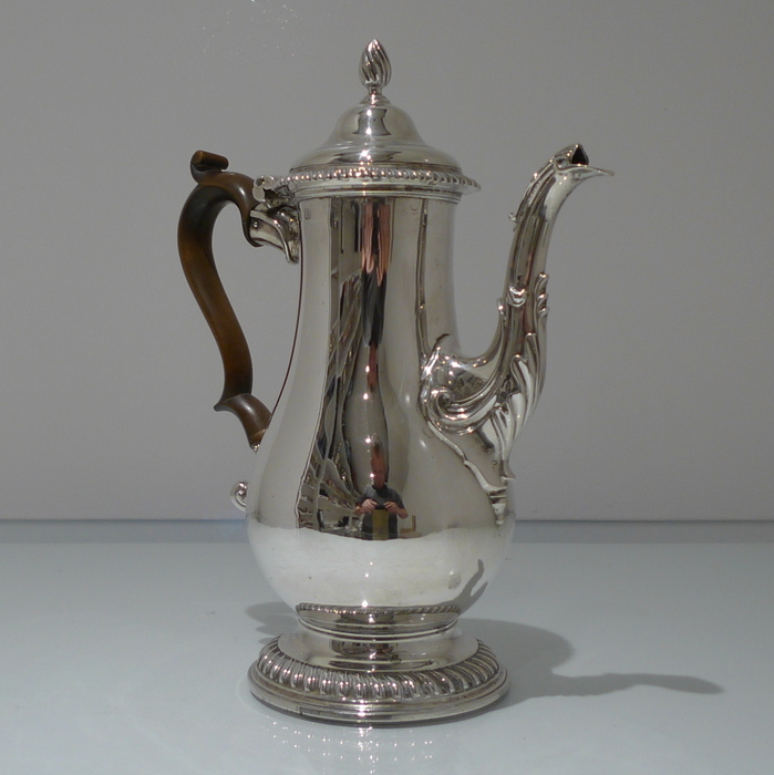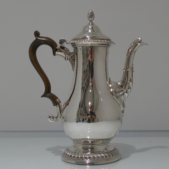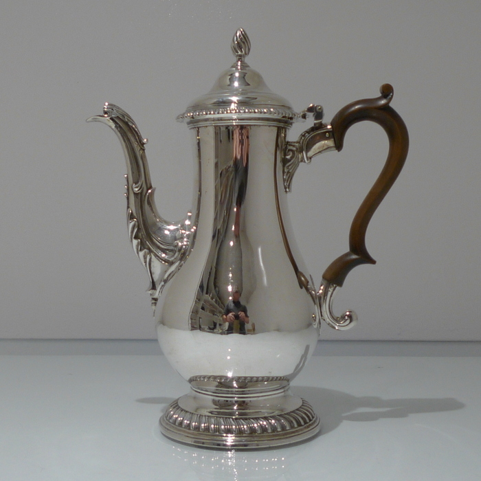 A beautiful pear shaped coffee pot decorated with elegant gadrooned mouldings around the lid and foot. Â The domed lid is hinged and is crowned with an ornate finial.