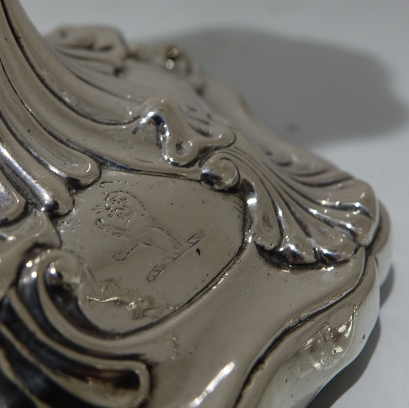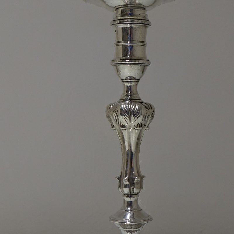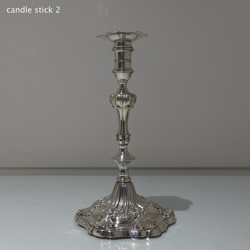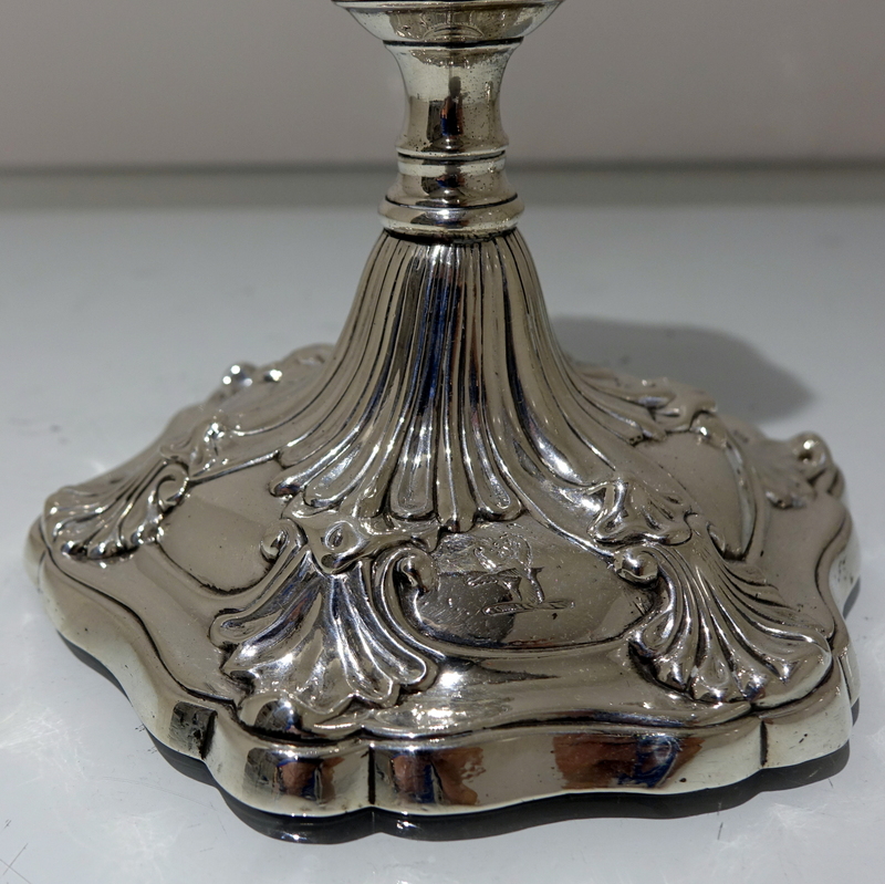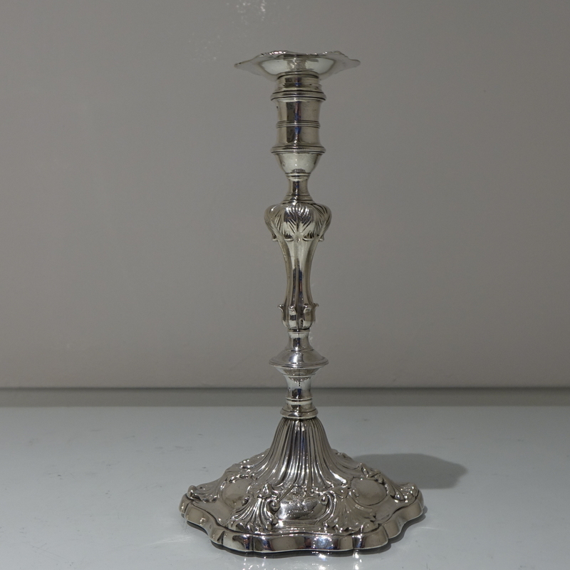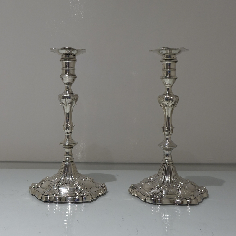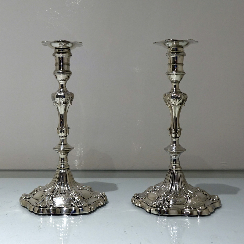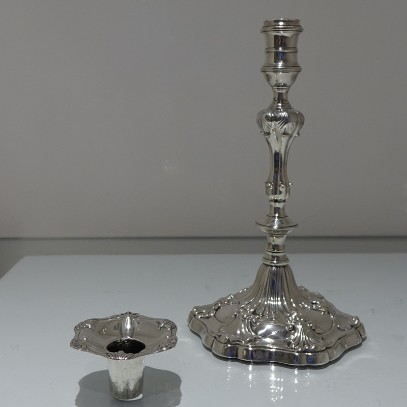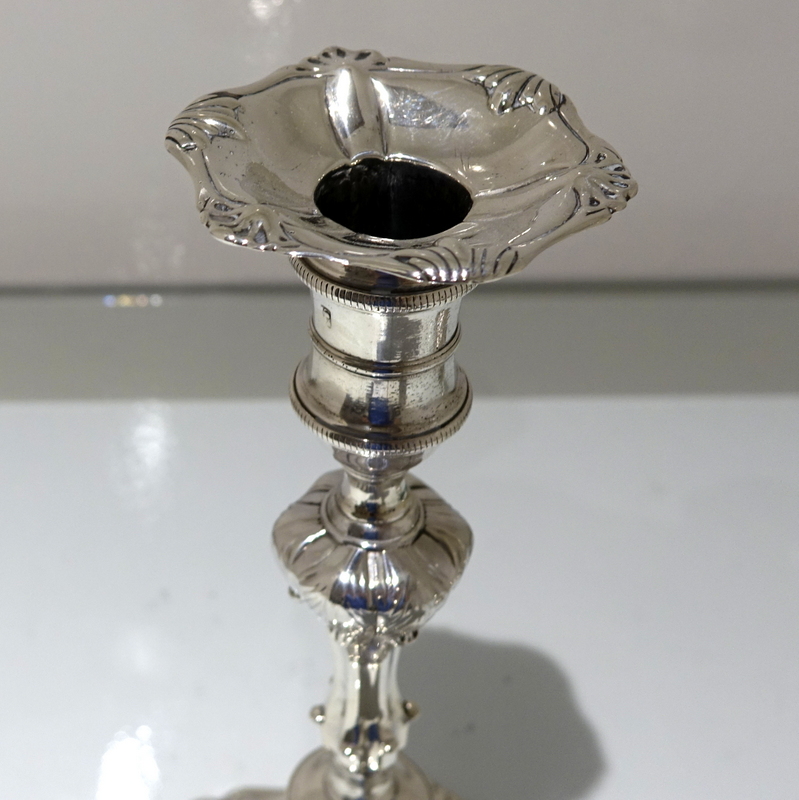 A stunning pair of early George III cast candlesticks with shaped circular ornate bases and stylish floral cushioned stems. Â The nozzles are detachable.