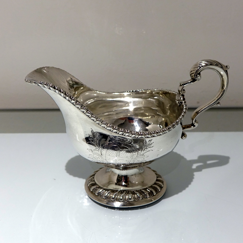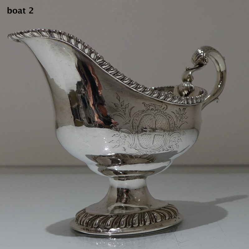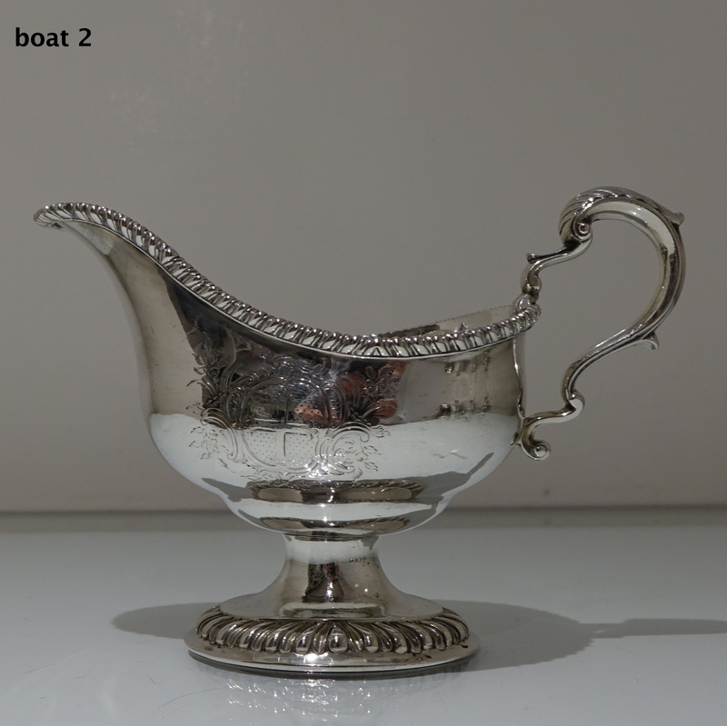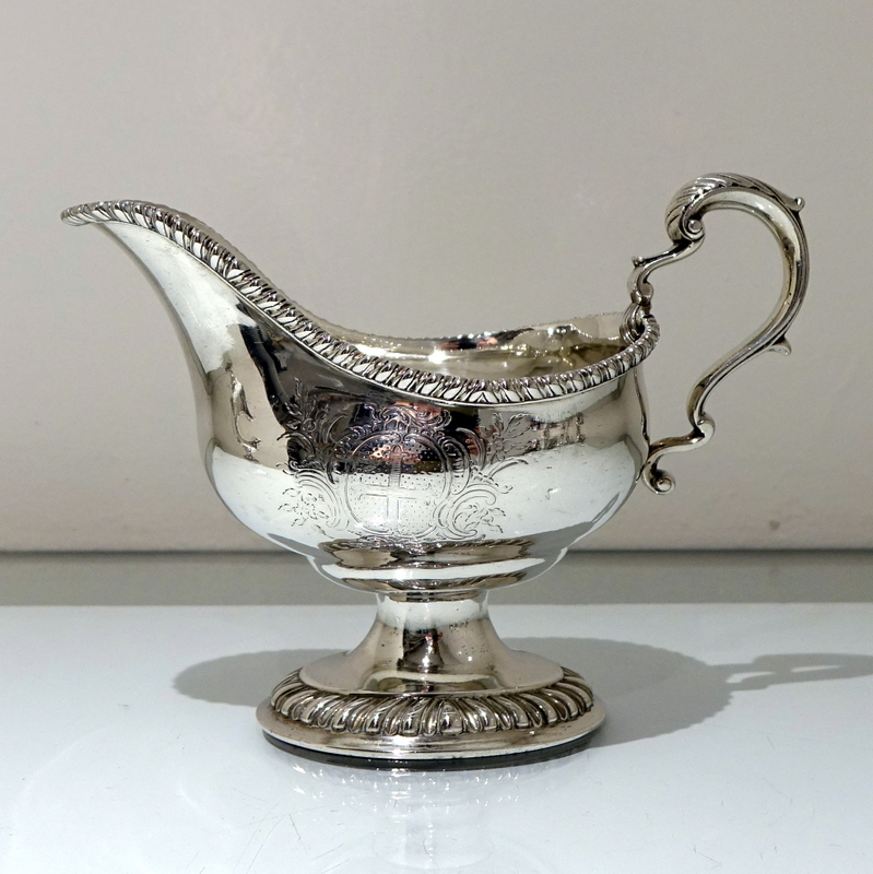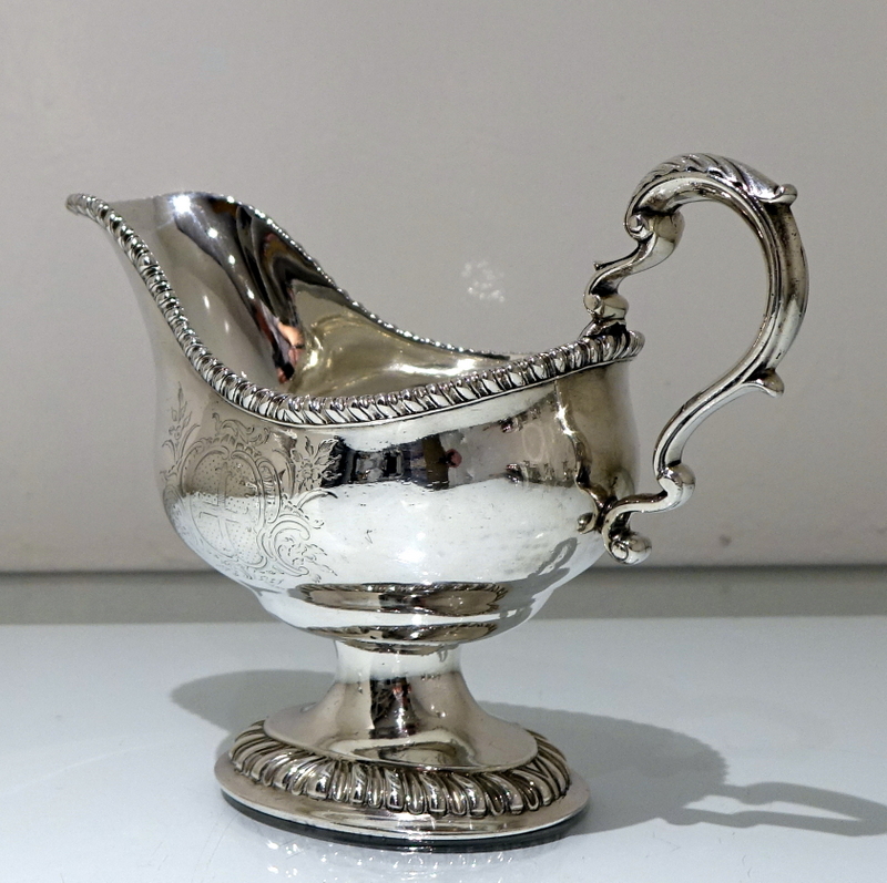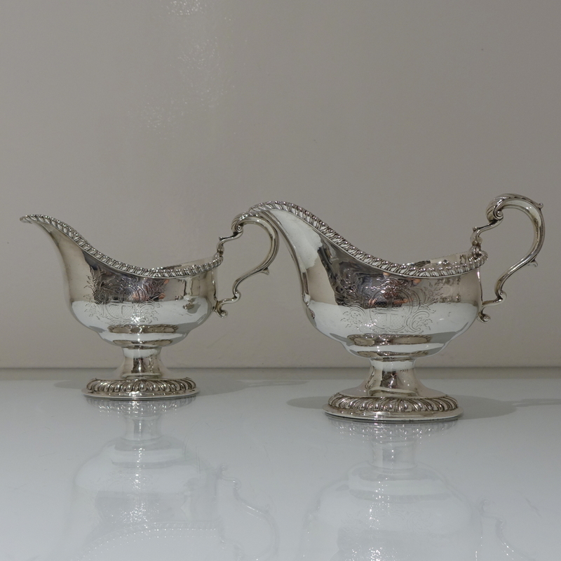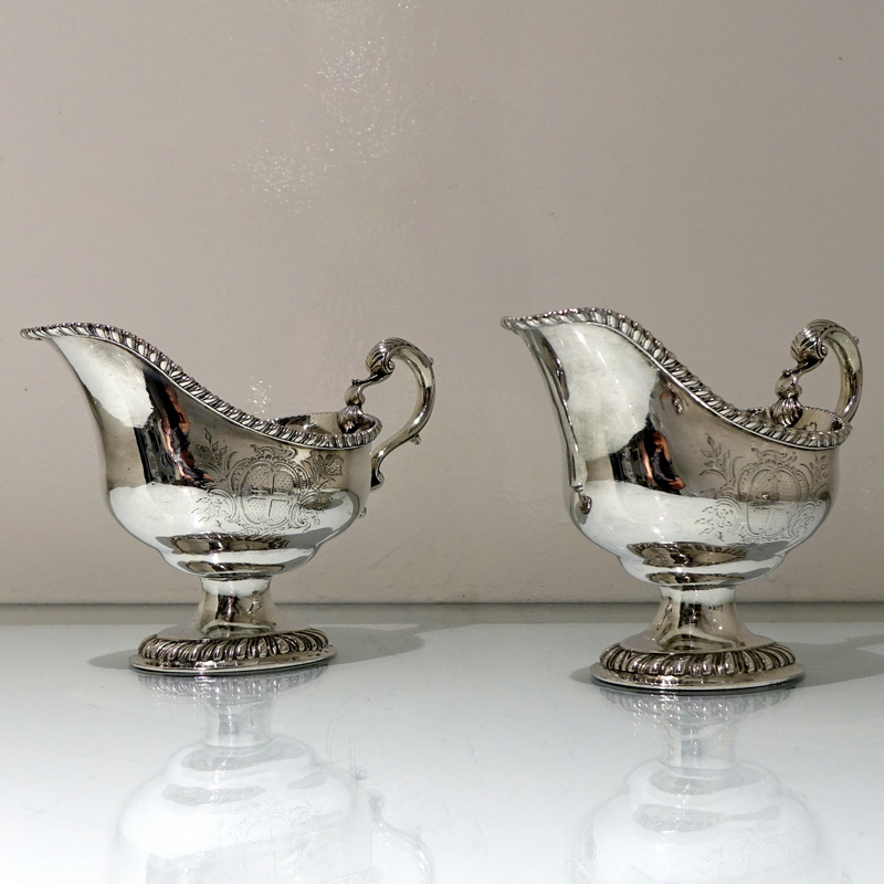 A stunning pair of mid 18th century oval designed silver sauceboats decorated with upper and lower gadroon borders. Â Both sauceboats have elegant contemporary engraved armorials for importance and sit on oval shaped “collet” feet.