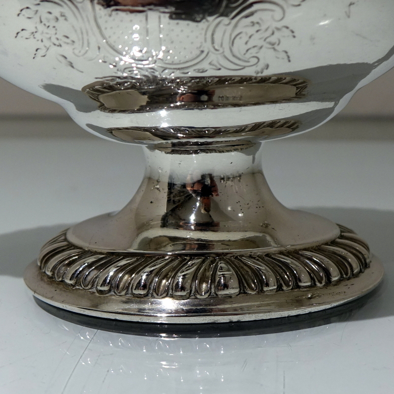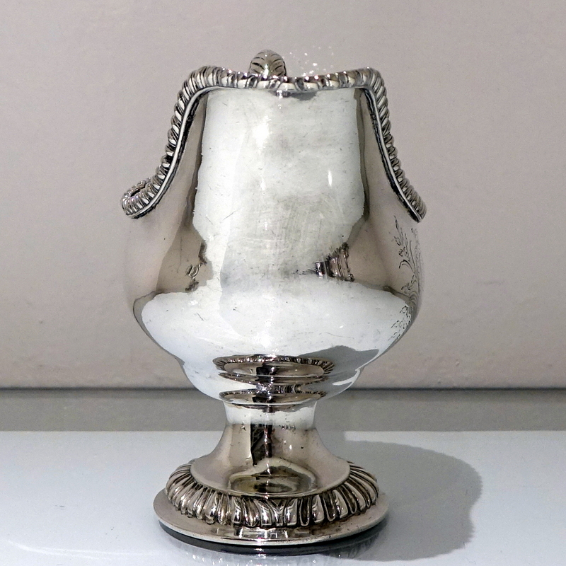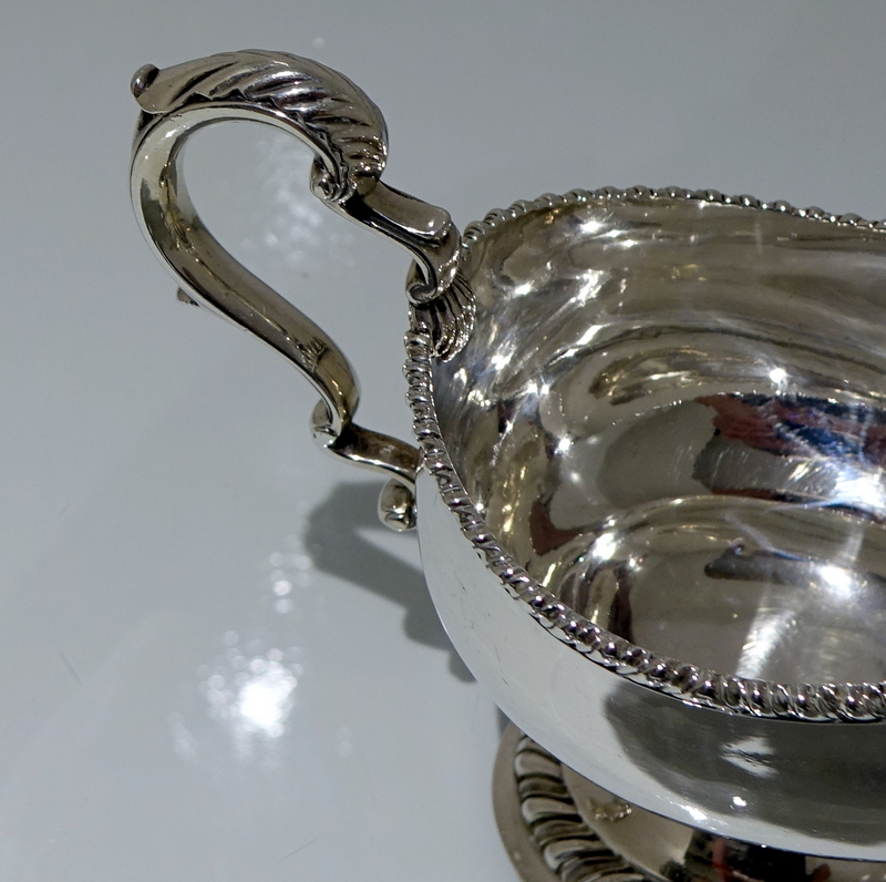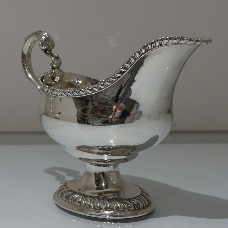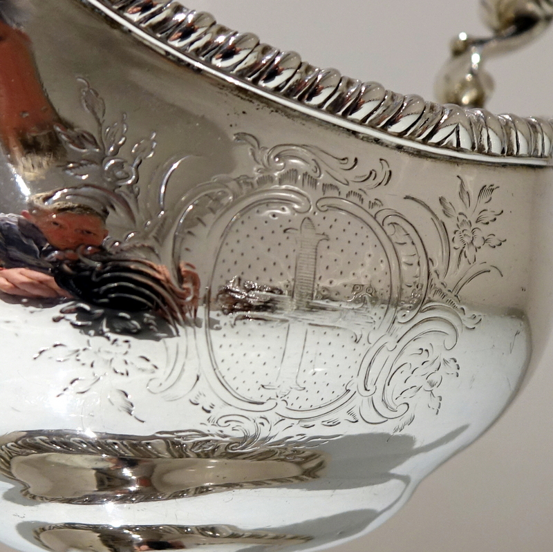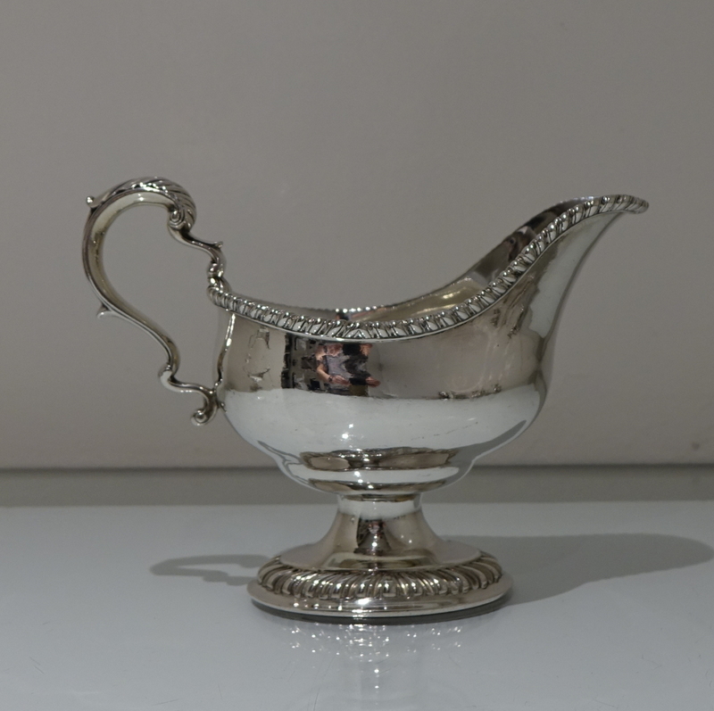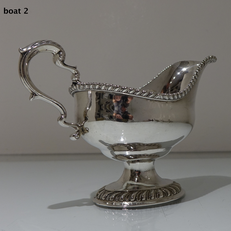 A stunning pair of mid 18th century oval designed silver sauceboats decorated with upper and lower gadroon borders. Â Both sauceboats have elegant contemporary engraved armorials for importance and sit on oval shaped “collet” feet.