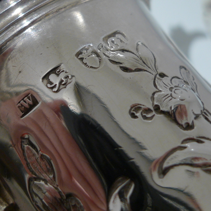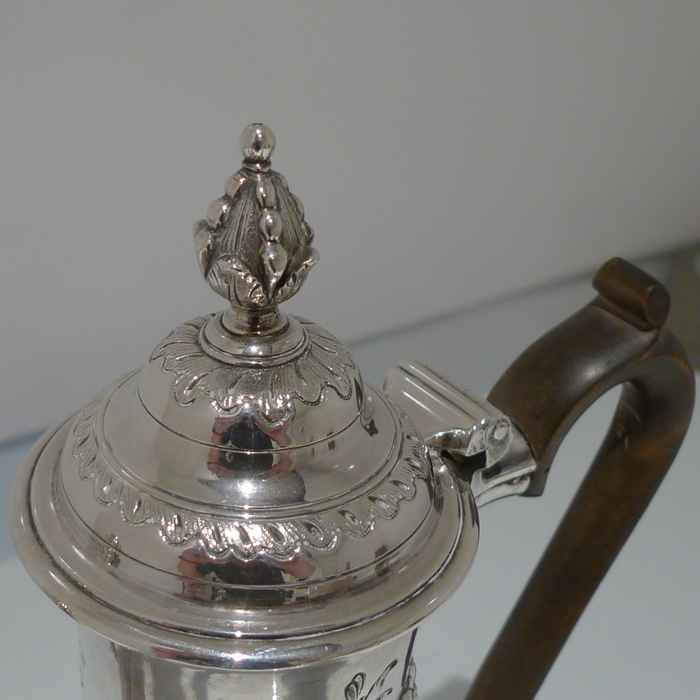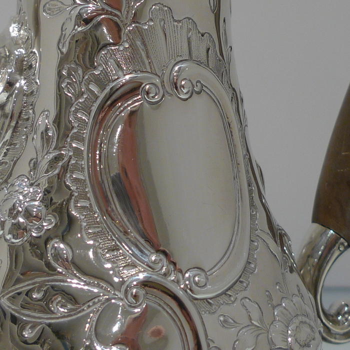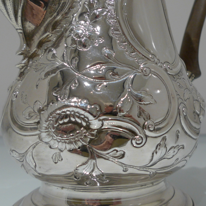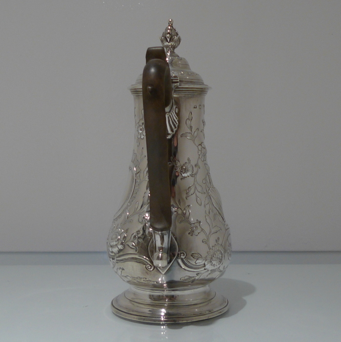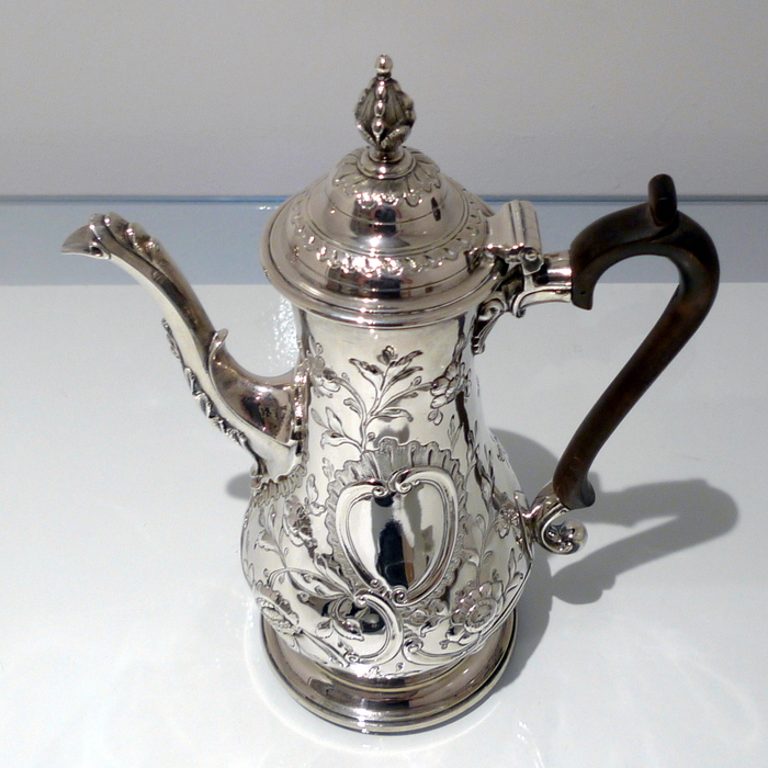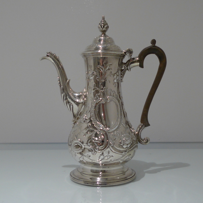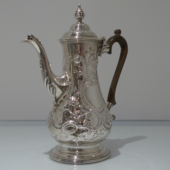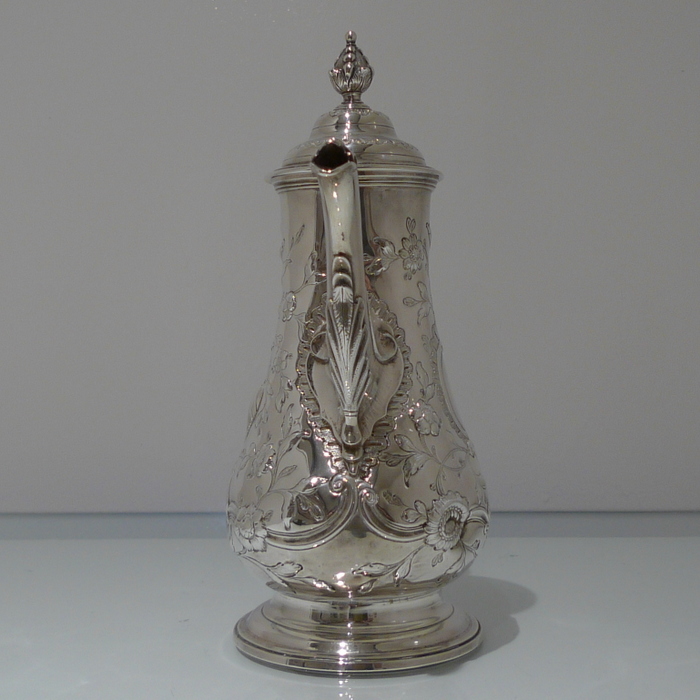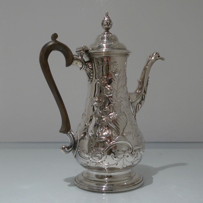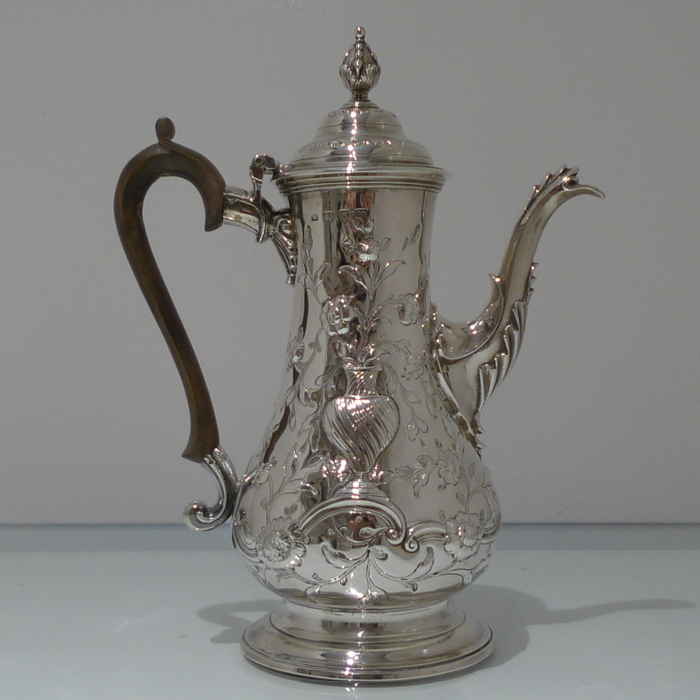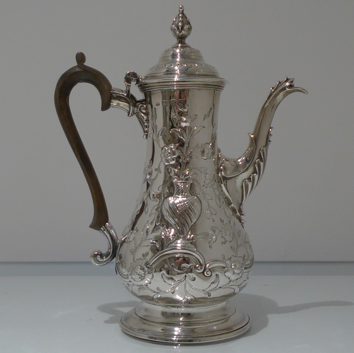 A stylish and very elegant “rococo” period baluster coffee pot beautifully hand chased with floral and vase motifs. Â The lid is hinged and crowned with an ornate finial.