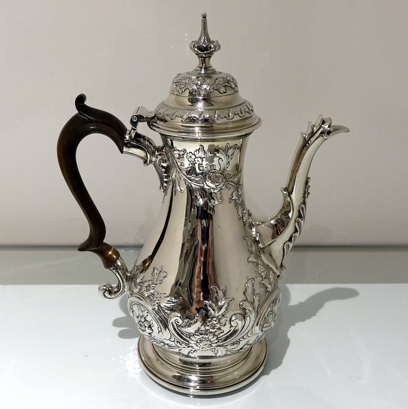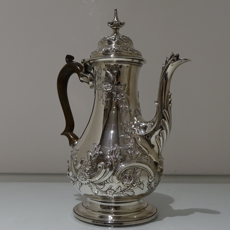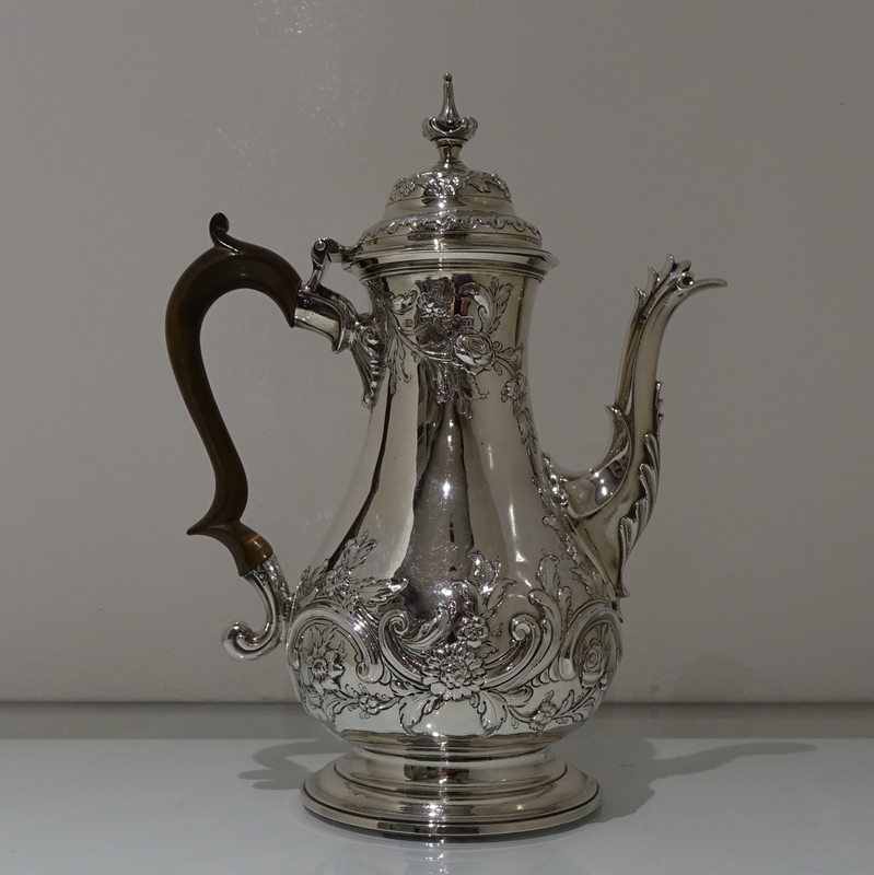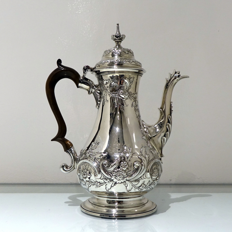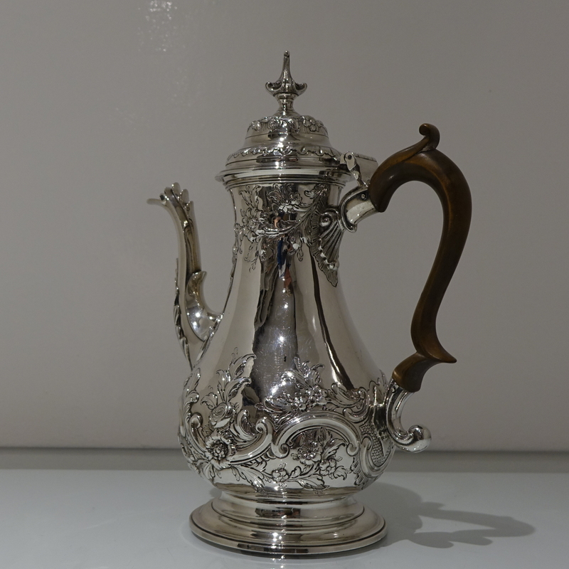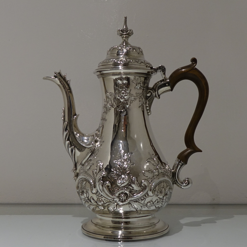 A stunningly beautiful mid 18th century baluster shaped rococo coffee pot decorated with elegant floral hand chasing.  The lid  is hinged and is crowned with an ornate finial and the double scroll handle is made out of fruitwood.