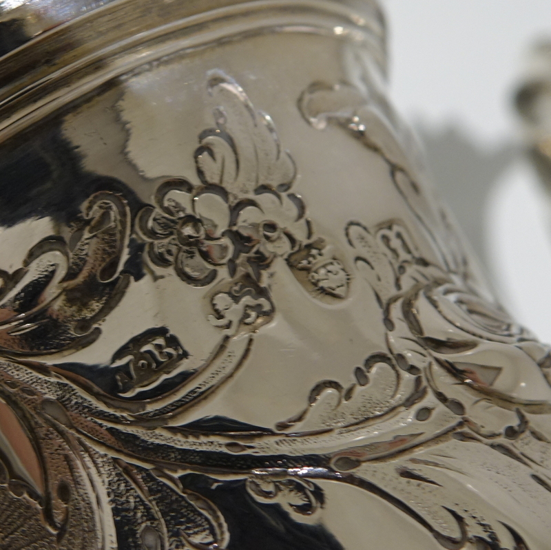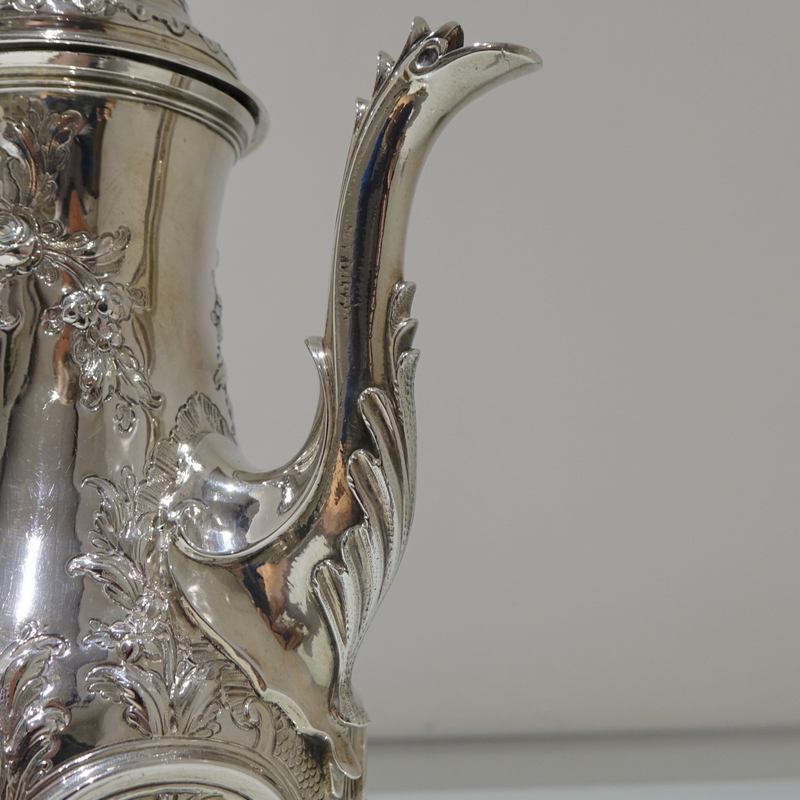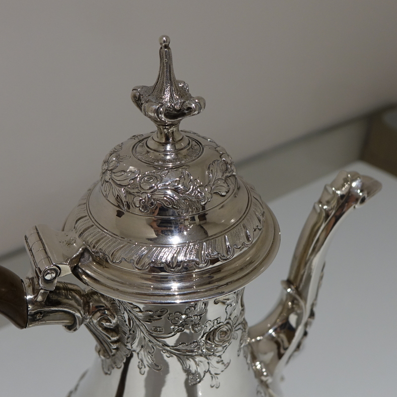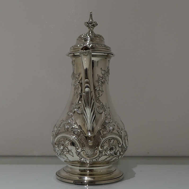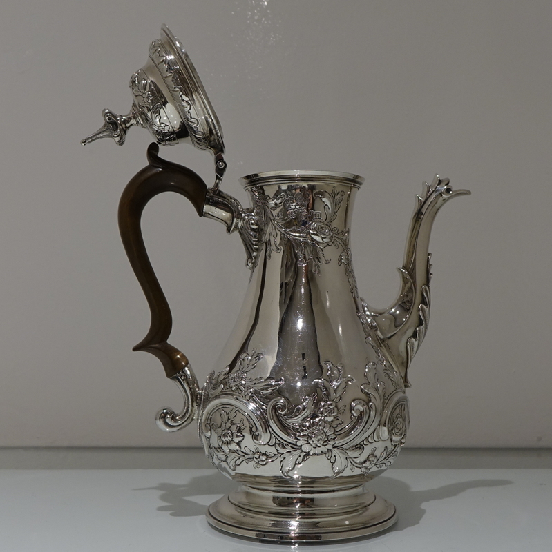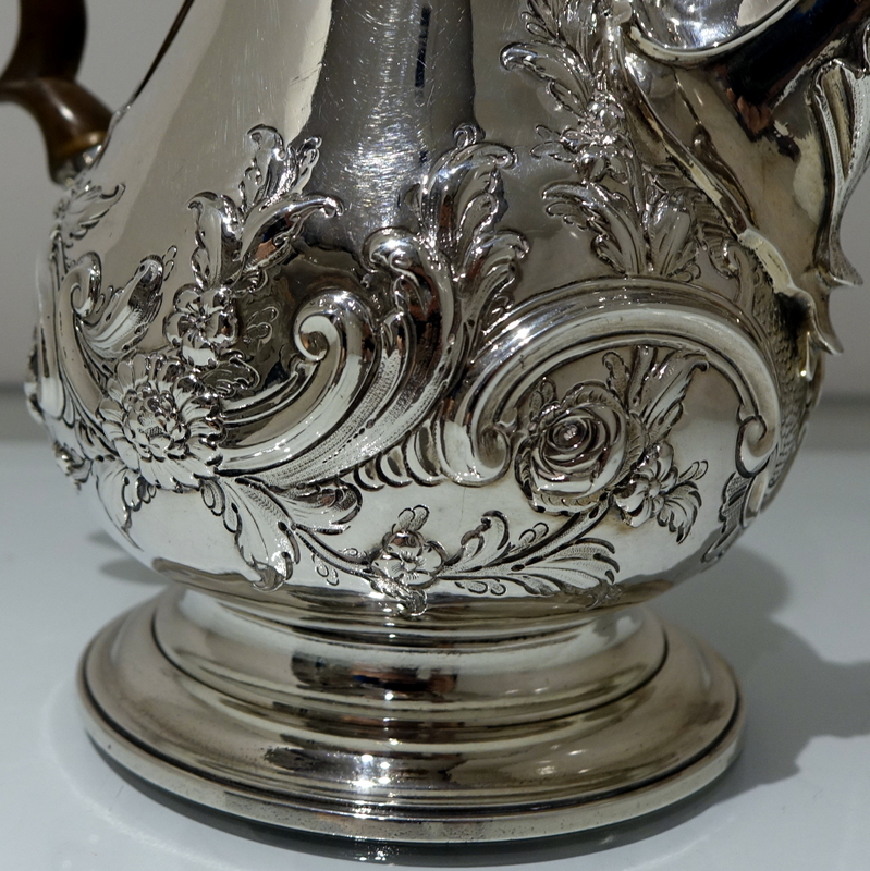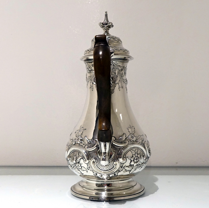 A stunningly beautiful mid 18th century baluster shaped rococo coffee pot decorated with elegant floral hand chasing.  The lid  is hinged and is crowned with an ornate finial and the double scroll handle is made out of fruitwood.