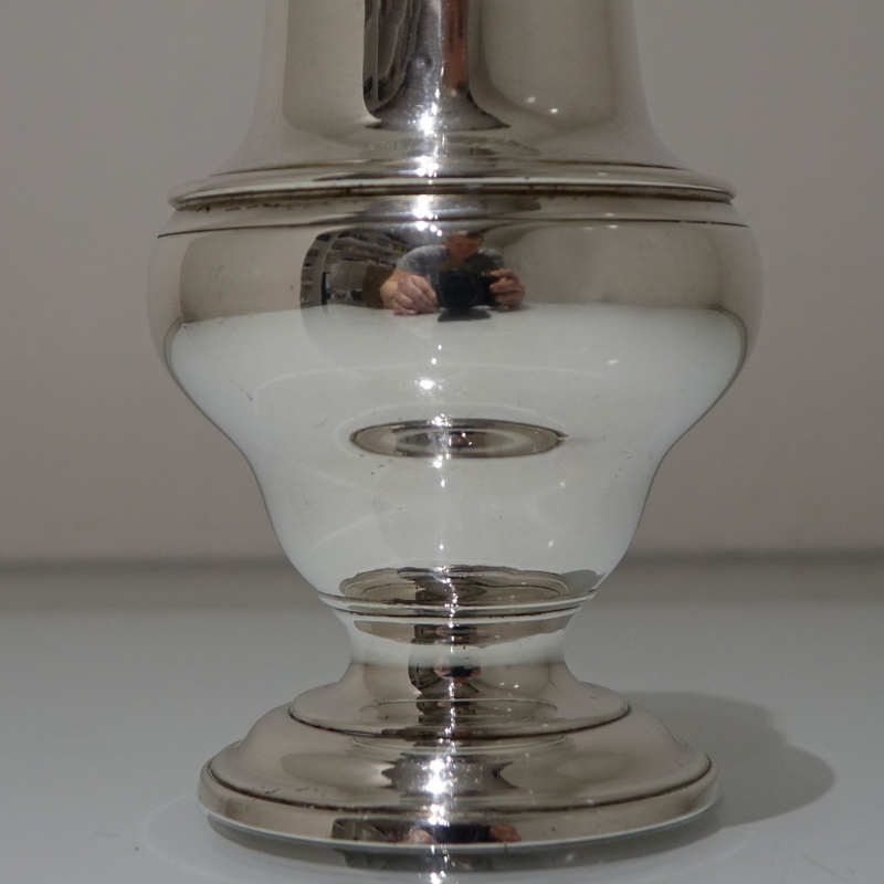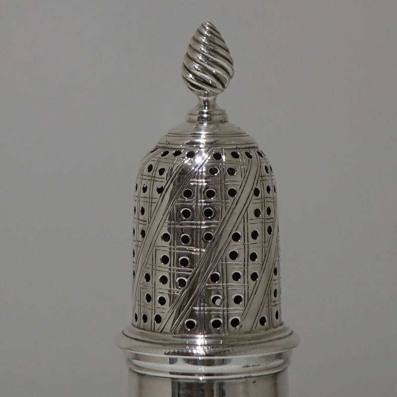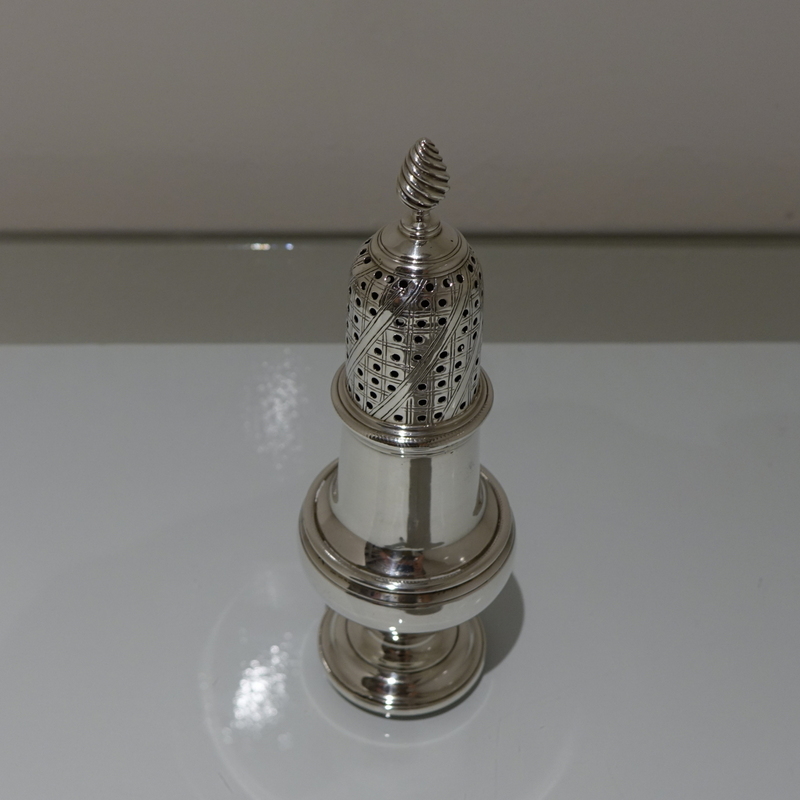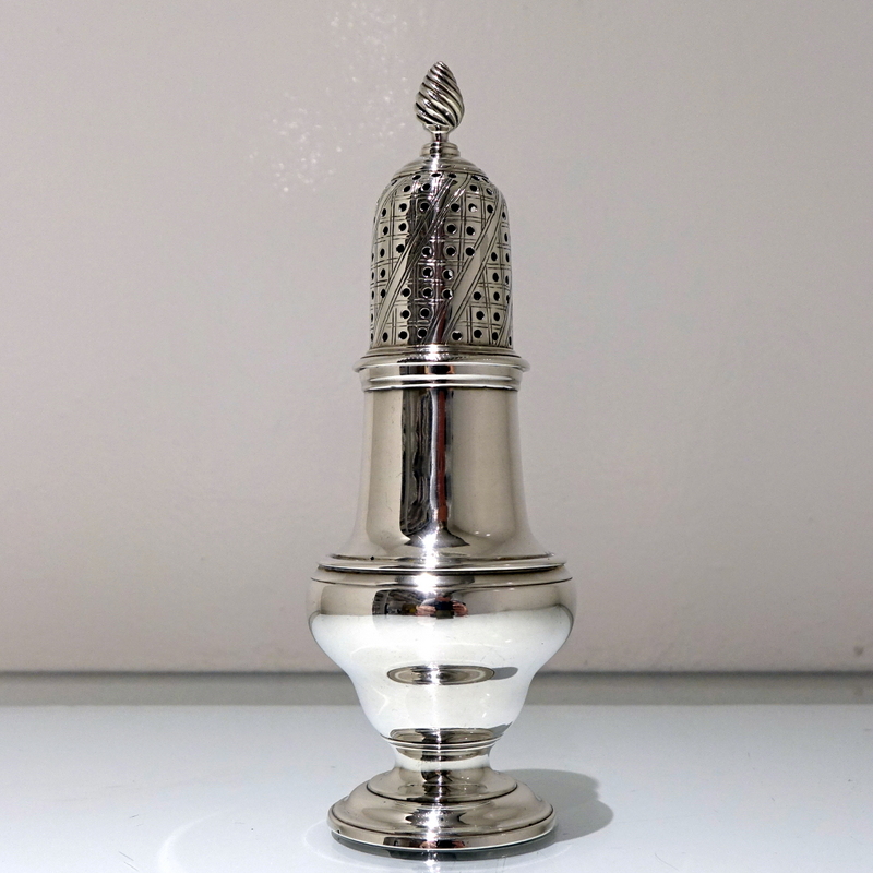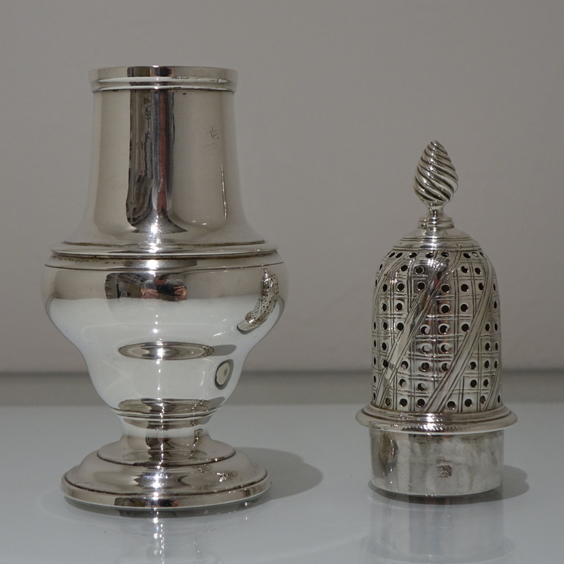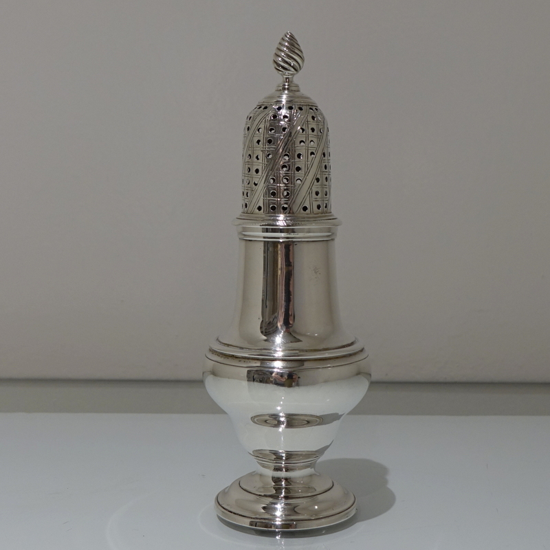 A very fine baluster formed sugar caster beautifully contrasting in design with a plain formed body and a stylish engraved detachable pierced lid.