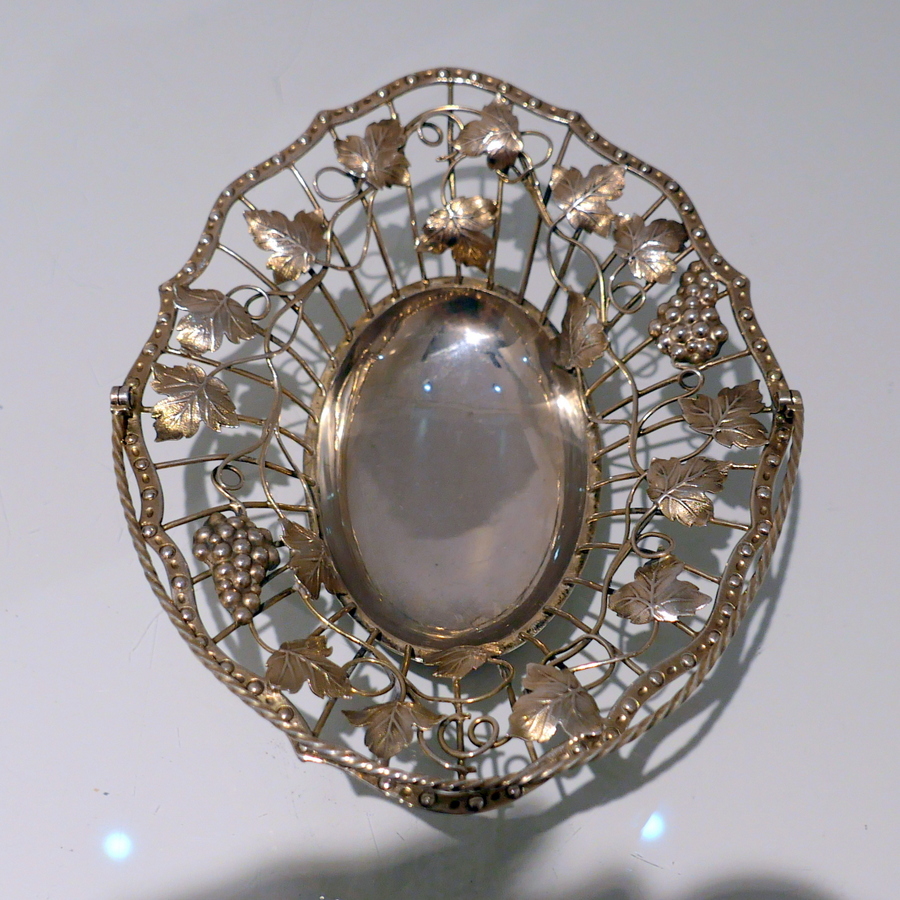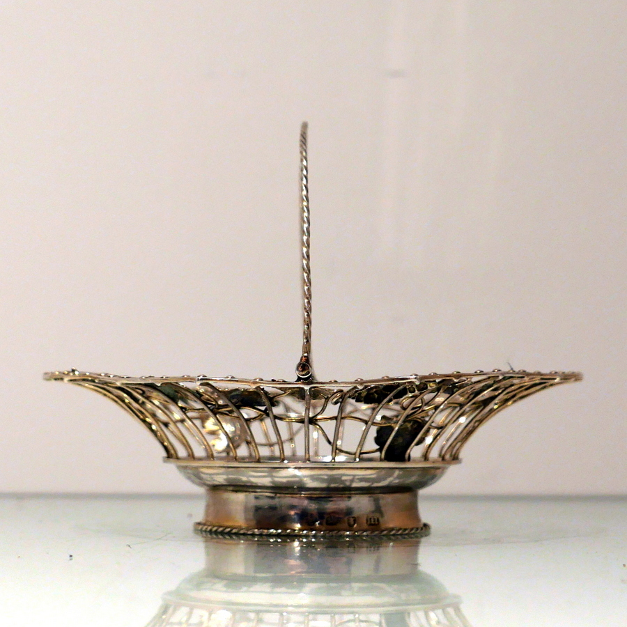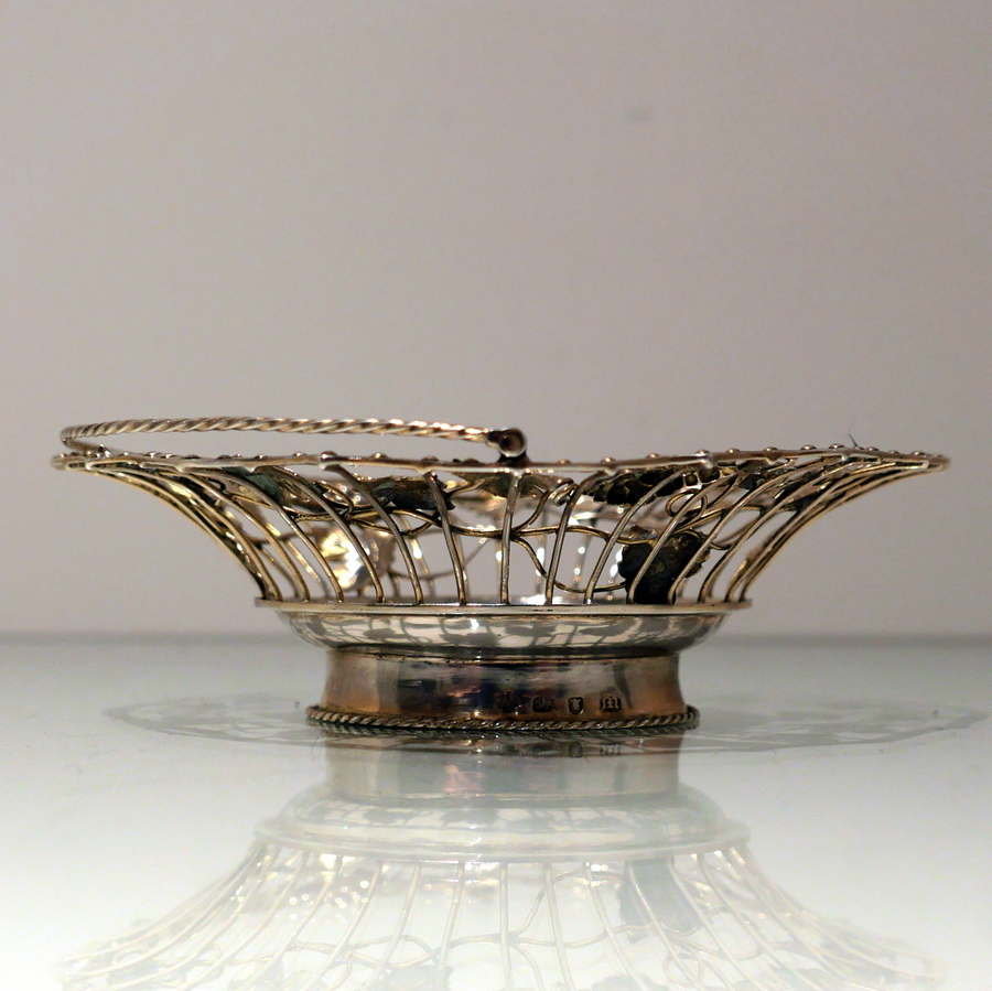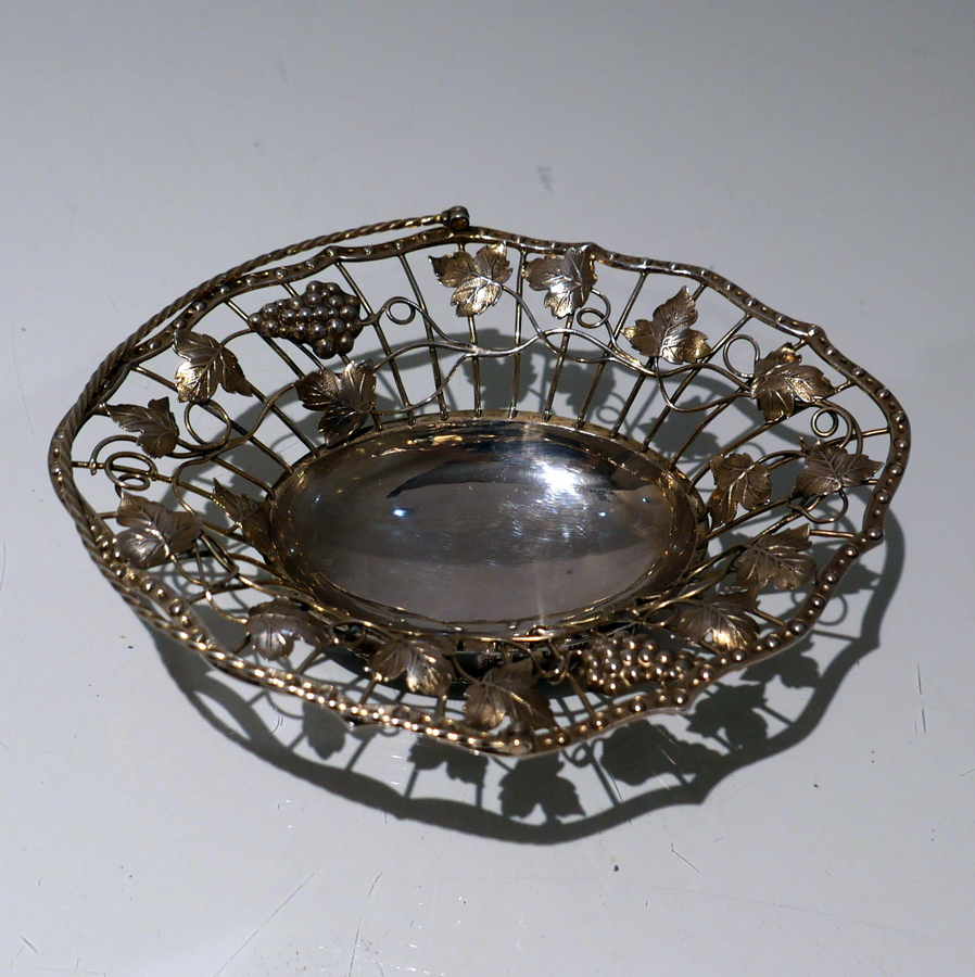 A beautiful mid 18th century shaped oval swing handled sweet meat basket decorated with a stylish wire work frame and elegant cast grape and vine motifs. The border has innovative rivets which doubles as a spaced bead decoration.