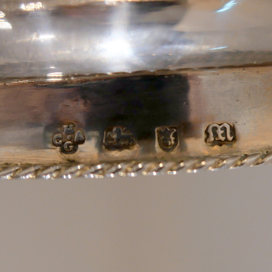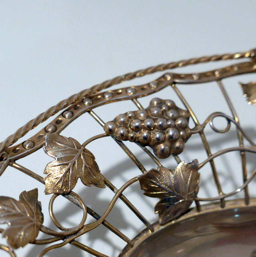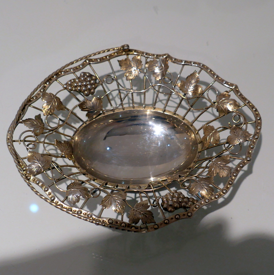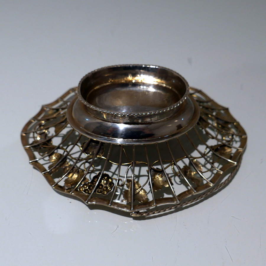 A beautiful mid 18th century shaped oval swing handled sweet meat basket decorated with a stylish wire work frame and elegant cast grape and vine motifs. The border has innovative rivets which doubles as a spaced bead decoration.
