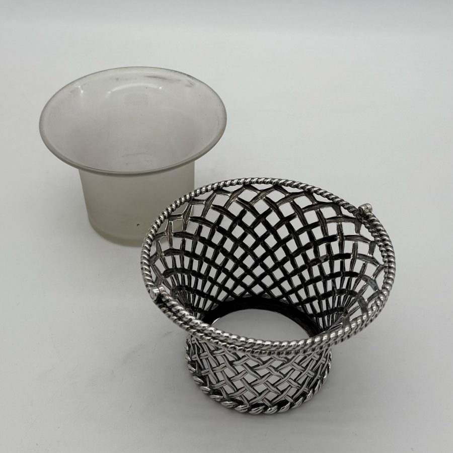 Beautiful and incredibly unusual Victorian circular tapeirng woven lattice themed swing handled sugar basket decorated with rope border highlights and detachable original inner white liner insert for decorative contrast.
