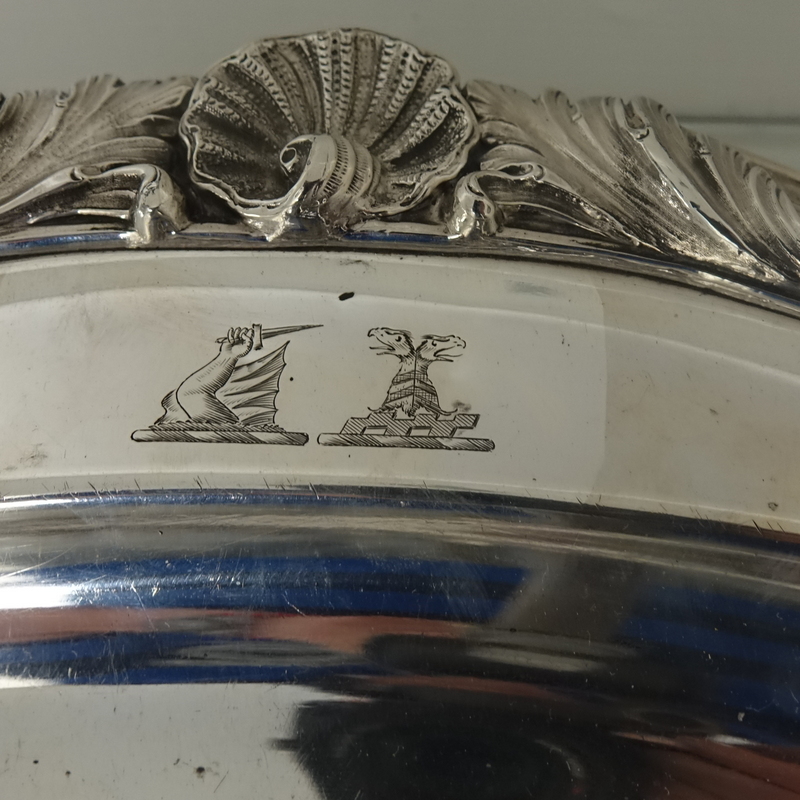 An incredibly rare and highly collectable piece of craftsmanship by the premiere Old Sheffield manufactures Matthew Boulton. The meat dome has a inlaid silver shields with a double contemporary coat of arms and is oval shaped in design with a single band of decorative floral and shell for highlights. The handle is acanthus leaf in design. The meat dish mirrors the dome cover in decoration and has a hot water compartment.
