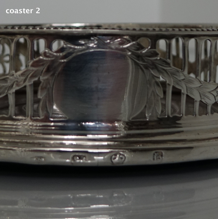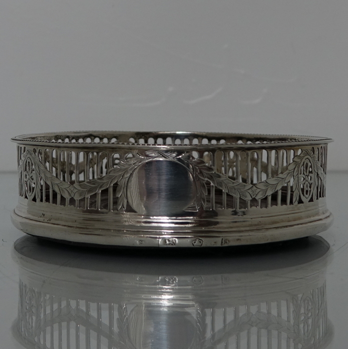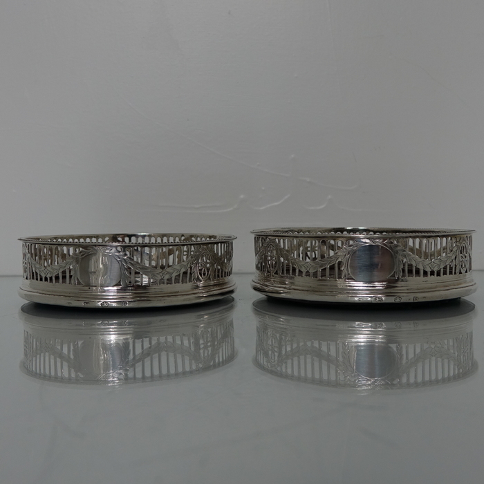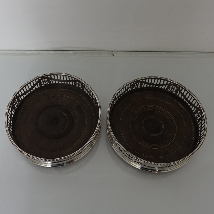 A very elegant pair of George III bead border bright cut engraved silver coasters. Â The coasters are stylishly hand pierced with a central floral engraved band of hand engraving entwining around the gallery. Â The coasters have an oval cartouche for importance.