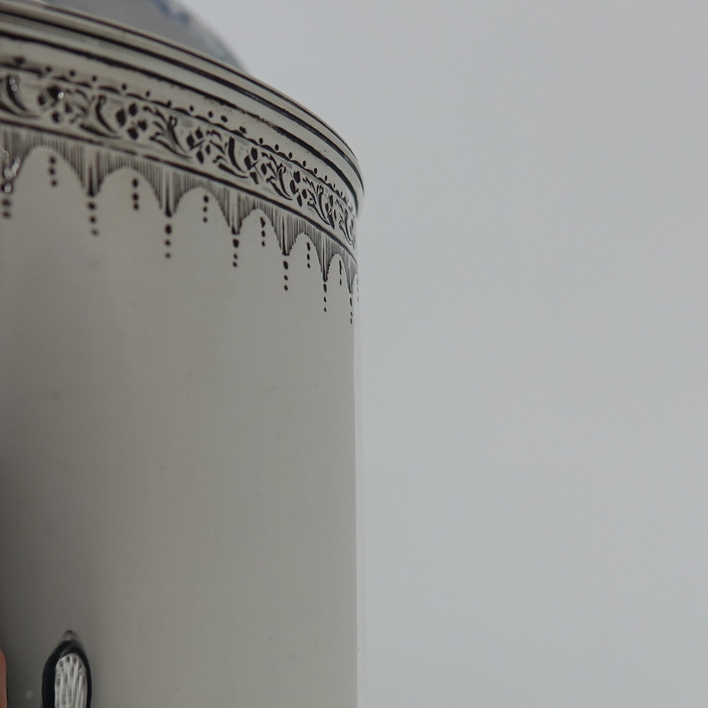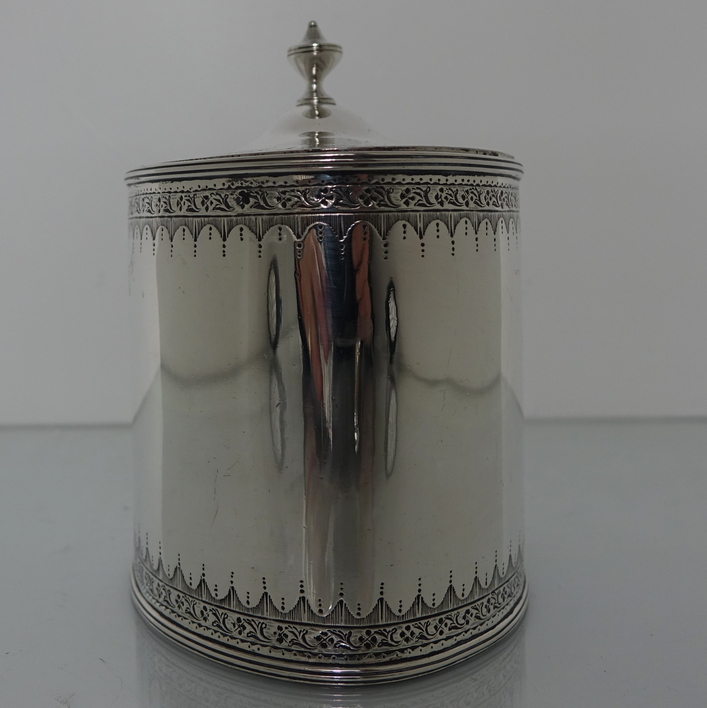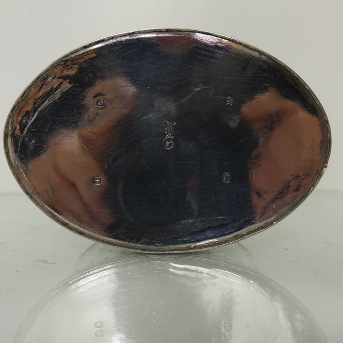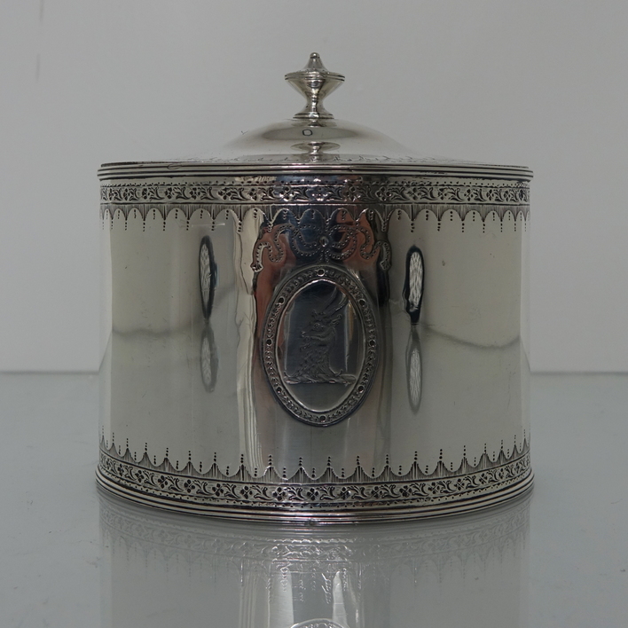 A very large and elegant 18th century oval bright cut engraved tea caddy with hinged lid. The body of the tea caddy has an upper and lower band of intricate bright cut hand engraving. The front of the caddy has a lock under which sits a cartouche baring a coat of arms. There is also a cartouche on the opposite side with a crest. The lid of the caddy is has an outer band of intricate hand bright cut engraving with finial also bright cut engraved.