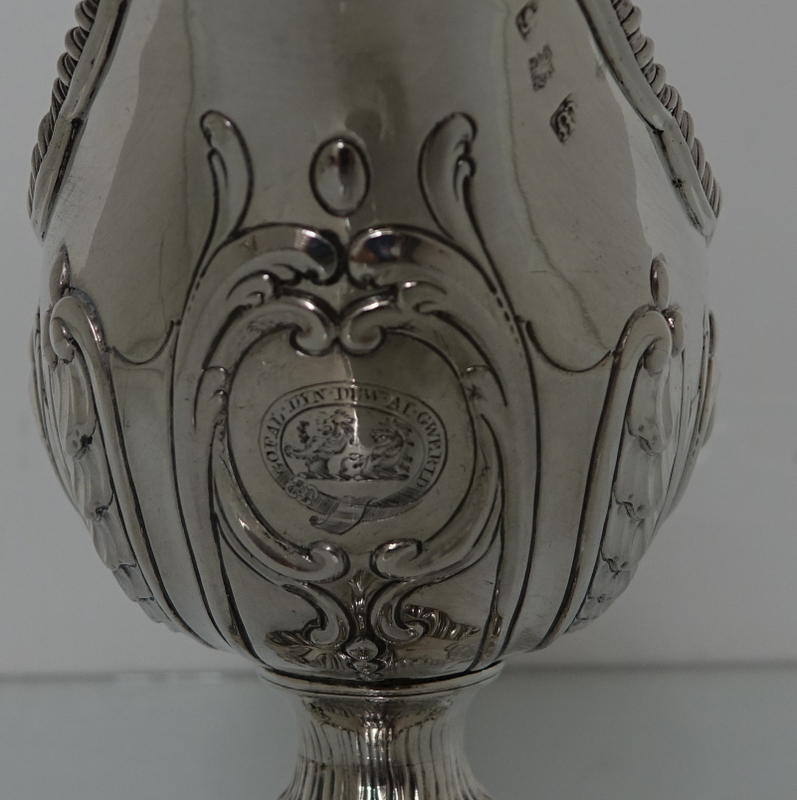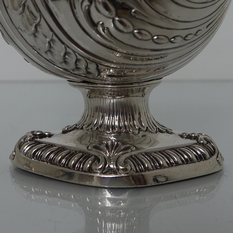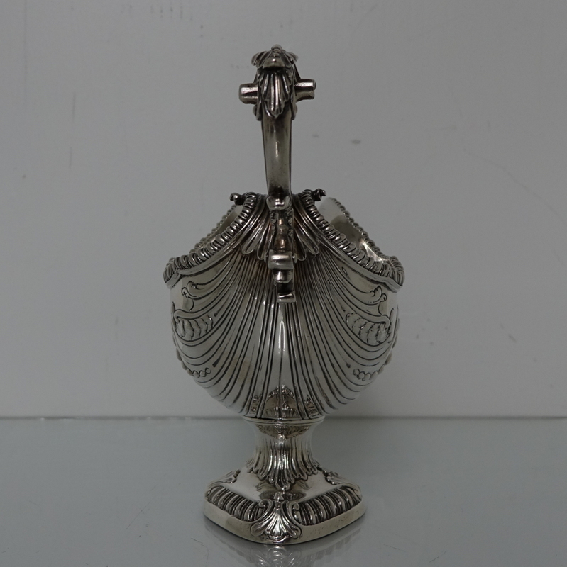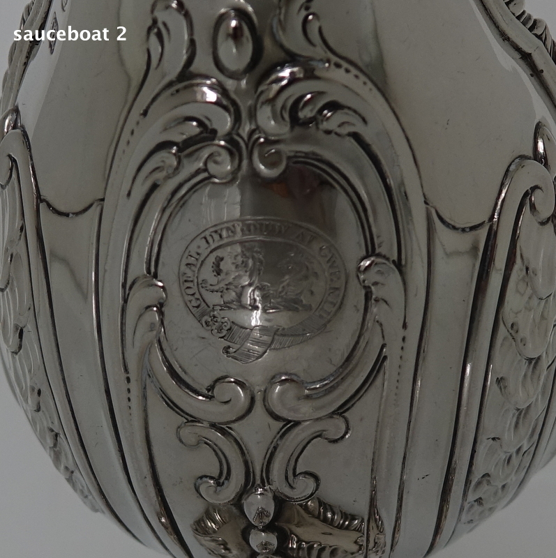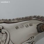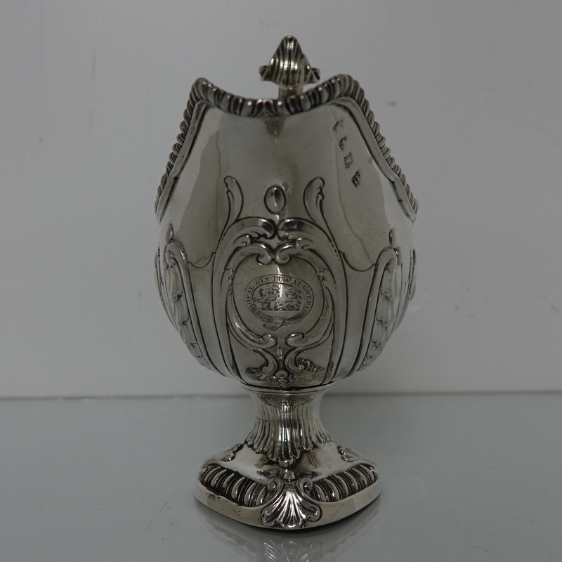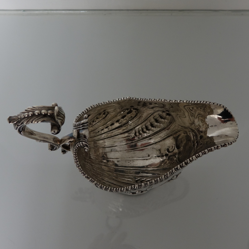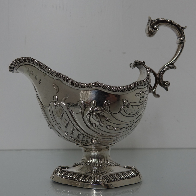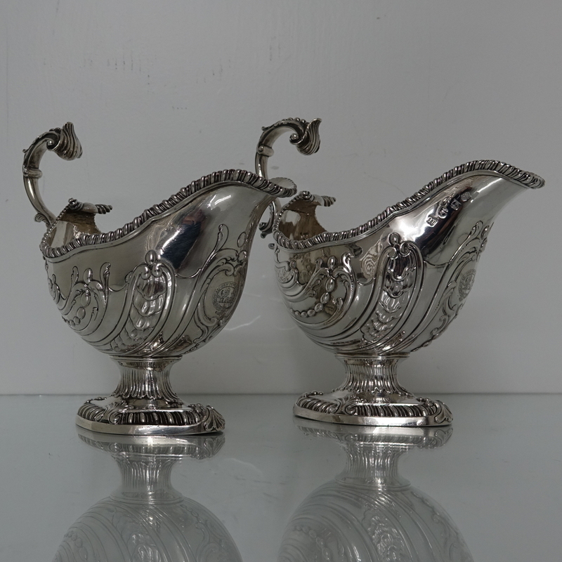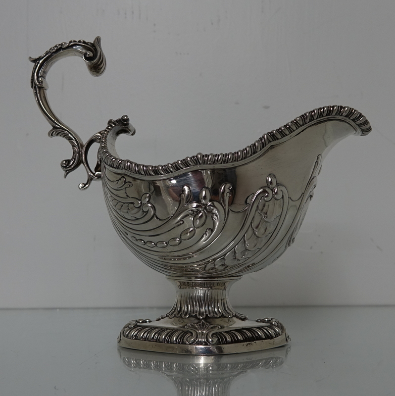 A very delightful pair of George III gadroon sauceboats designed with post rococo workmanship throughout. The foot of the sauceboat is oval and the handle is raised scroll design with acanthus leaf decoration for additional highlights.