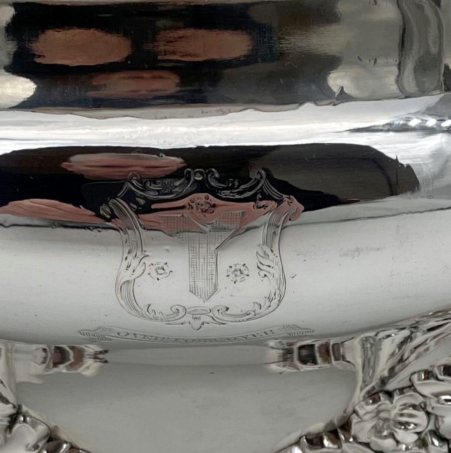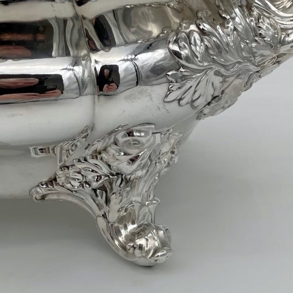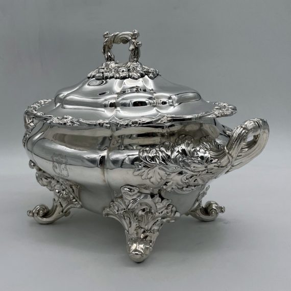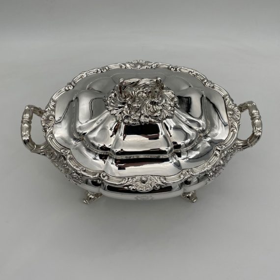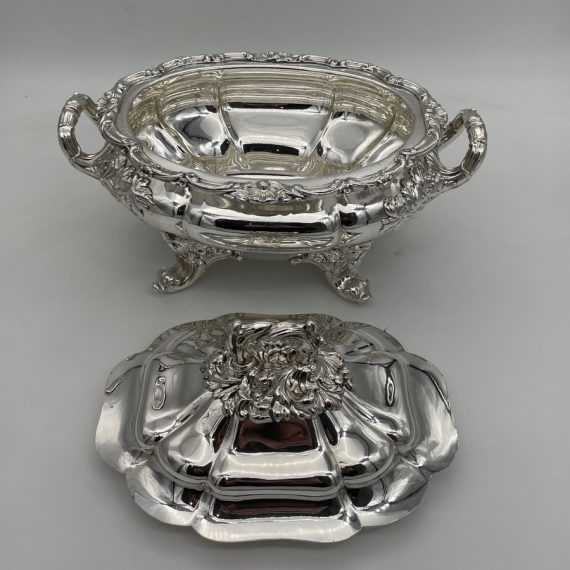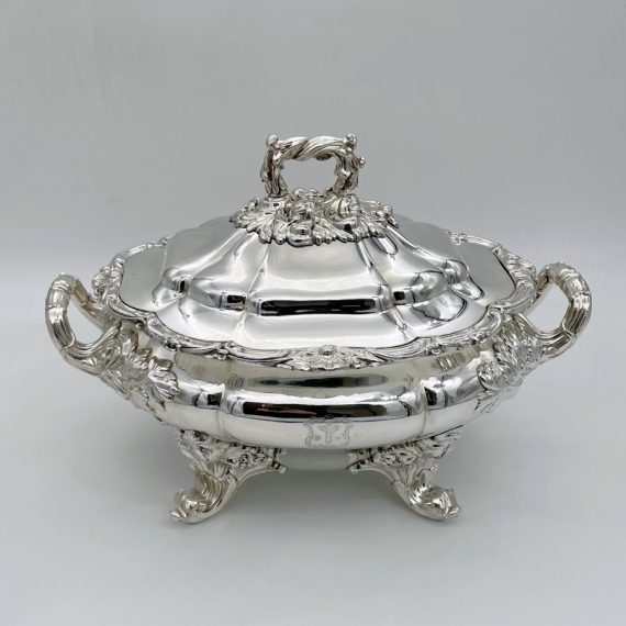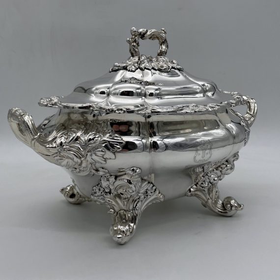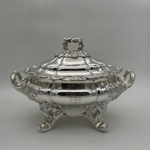 A shaped oblong two handled Old Sheffield soup tureen decorated with handsome applied foliate mounts and a double contemporary hand engraved armorial for importance.