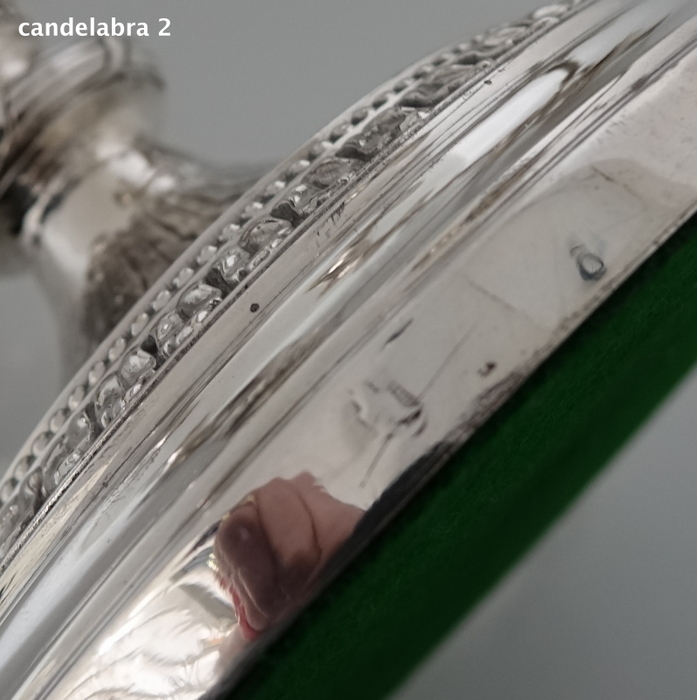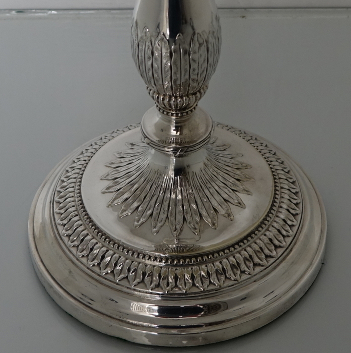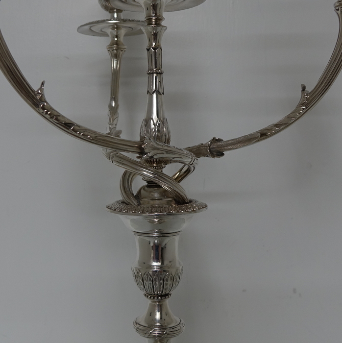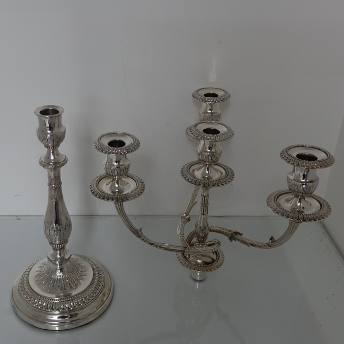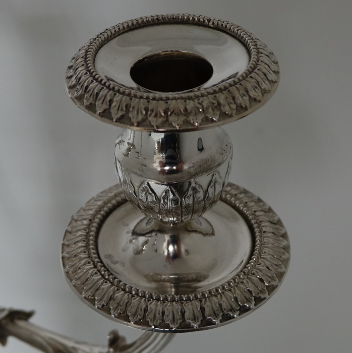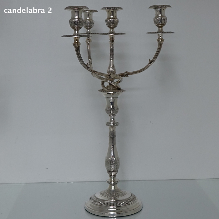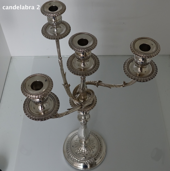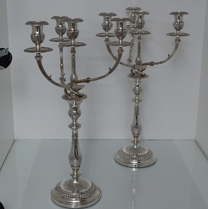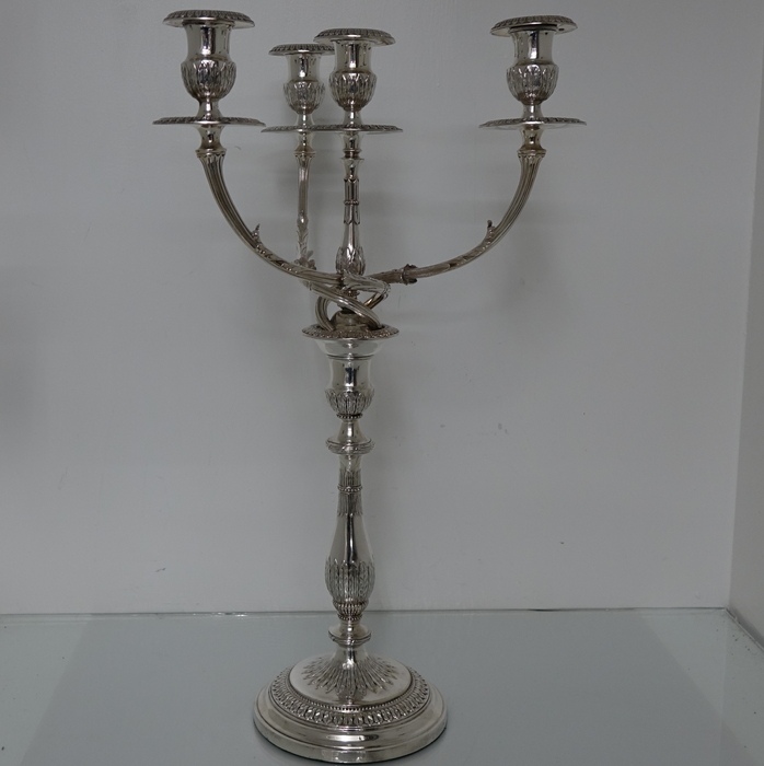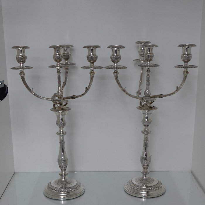 A truly magnificent pair of Old Sheffield four light table candelabras. Â The bases of the candlesticks are beautiful decorated with a bead gallery for lowlights. Â The branches are detachable with ornate matching drip pans and nozzles.