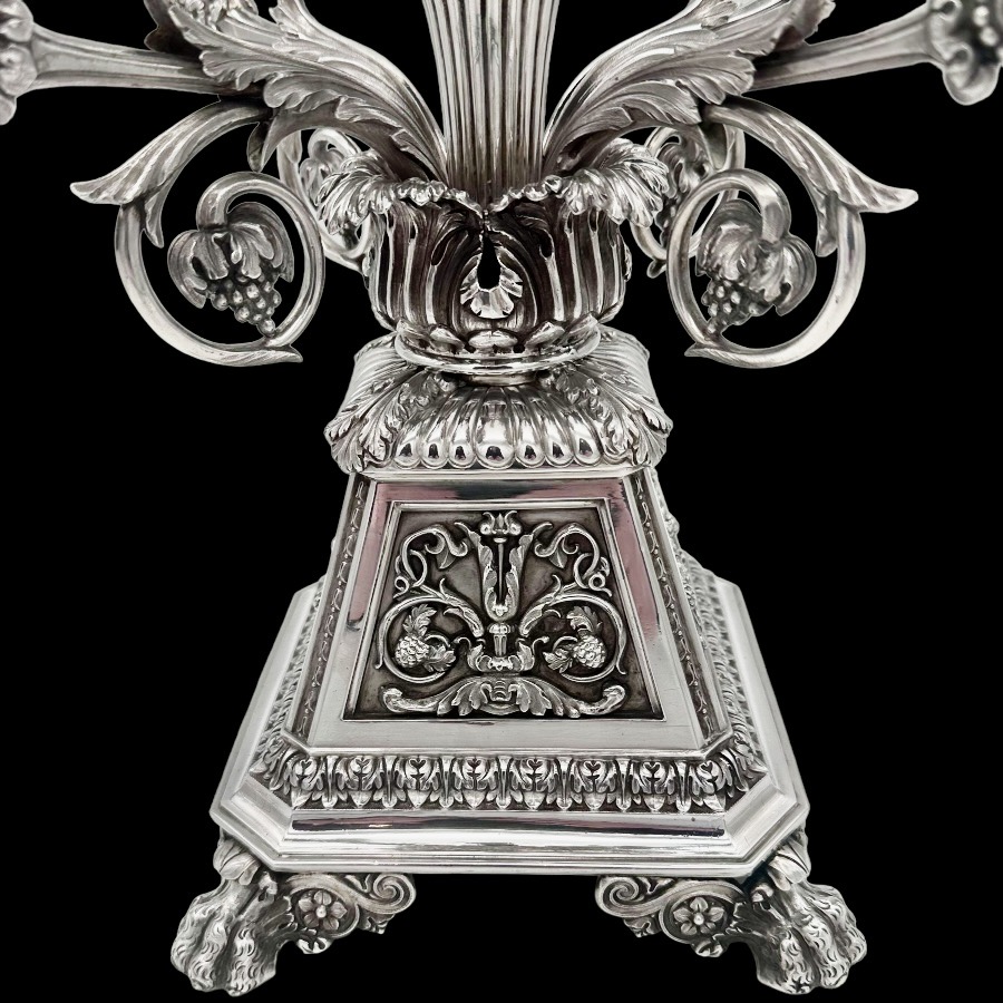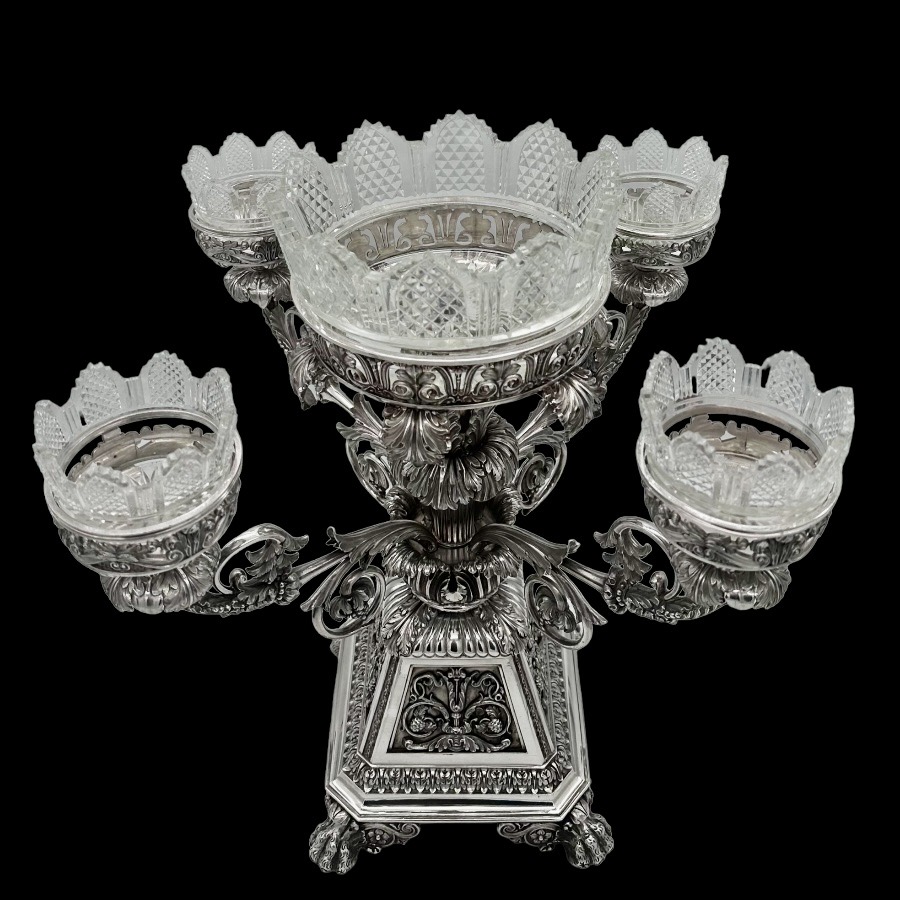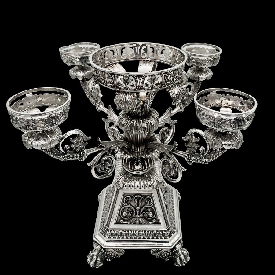 Impressive Georgian silver five basket table centrepiece designed with a large central basket and four outer baskets all held by fabulous scrolling floral branches. The stunning tapering base of the epergne has gorgeous decorative themes for lowlights.