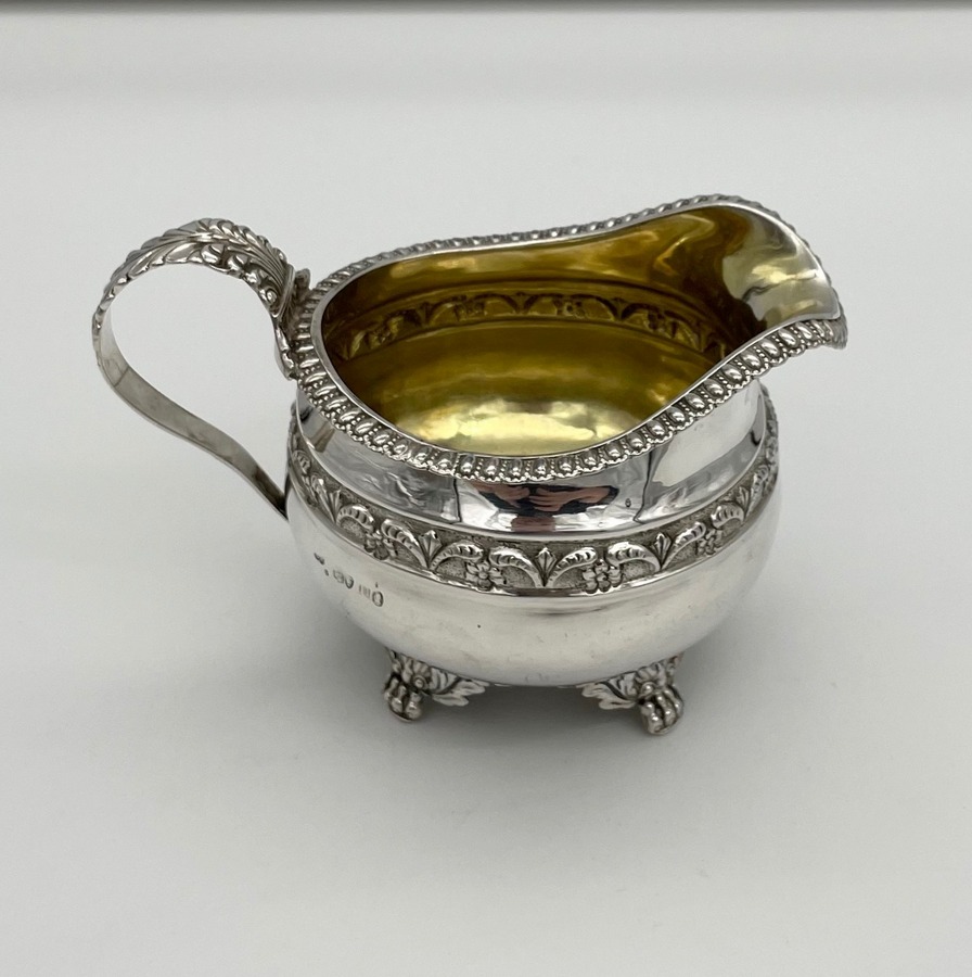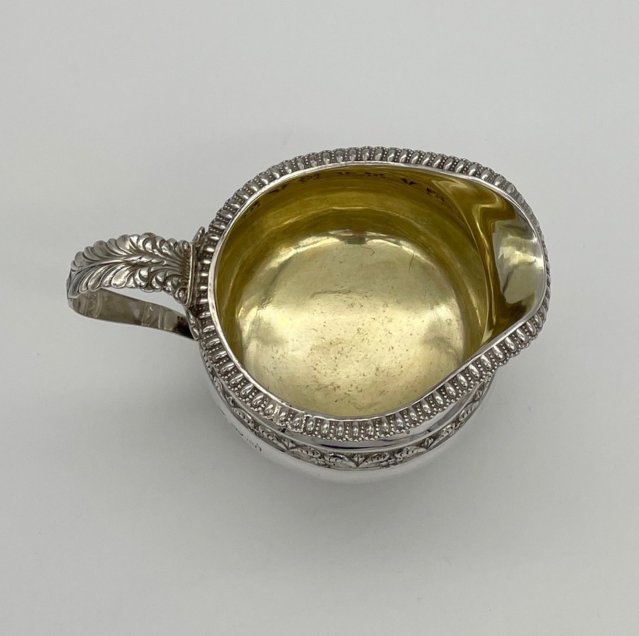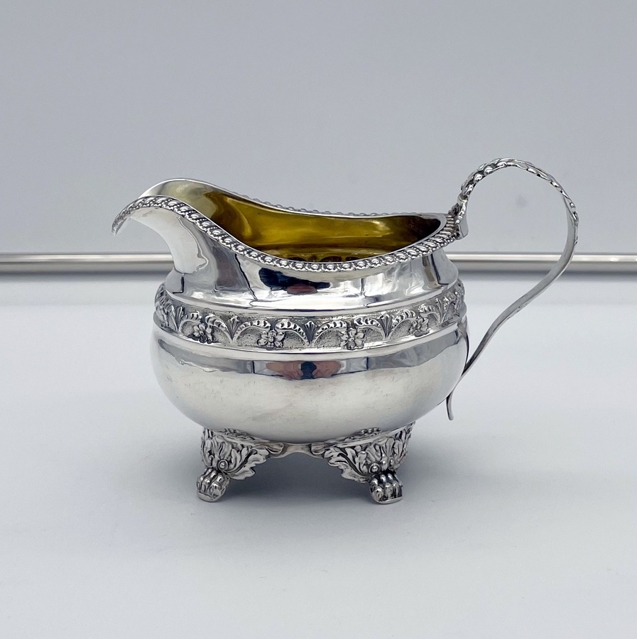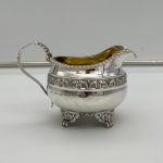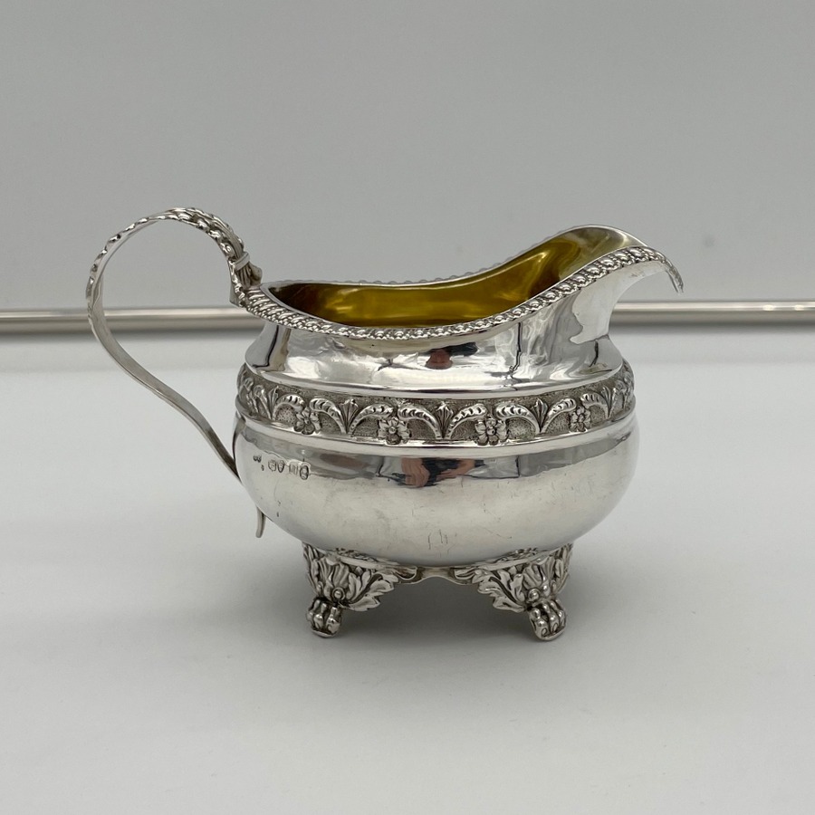 A fine early 19th century Georgian silver cream jug designed with an elegantly shaped baluster body and decorated with a truly fabulous hand embellished floral galleried border. The upper rim (lip) of the cream jug has a fabulous tongue style border and the handle has been beautiful floral decorated.