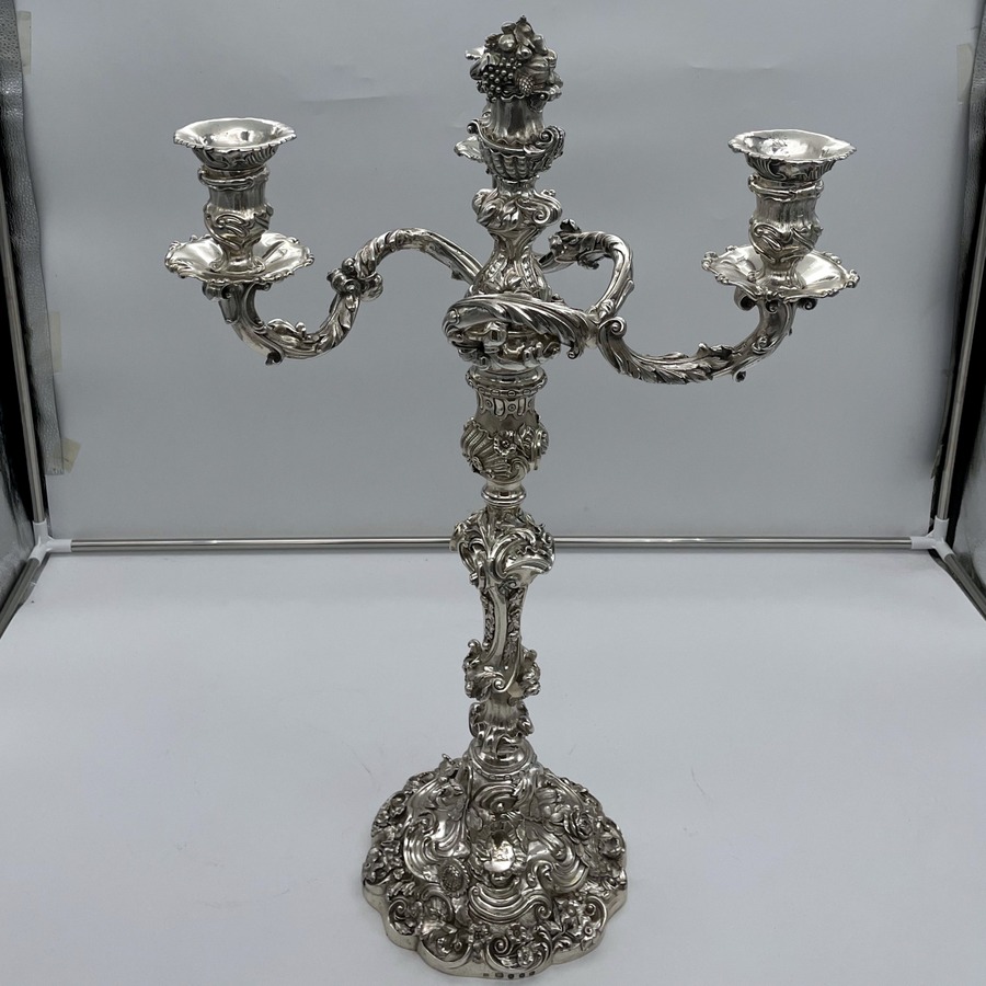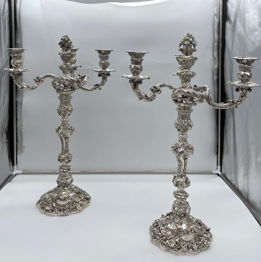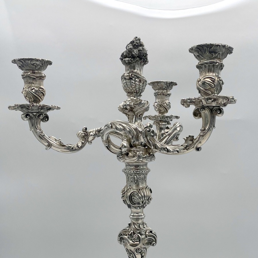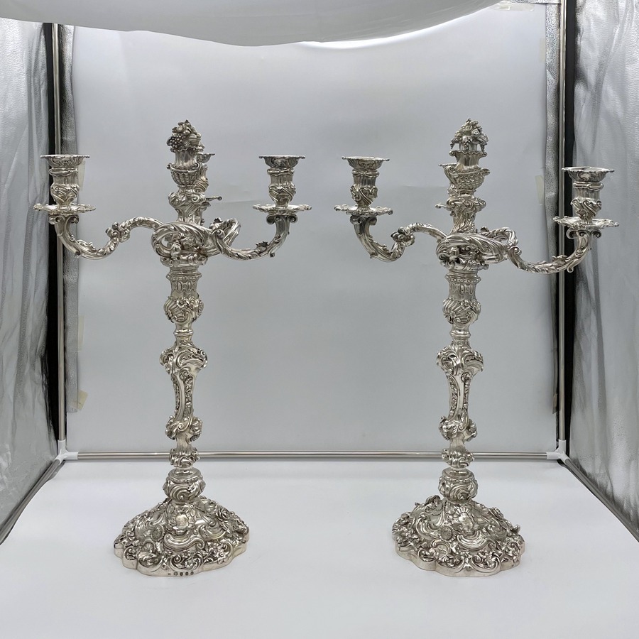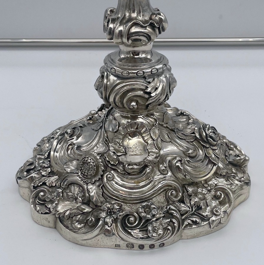 A truly fine and incredibly large pair of four light cast sterling silver candelabra decorated with exquisite floral and scrolling motifs. The branches have additional floral castings and a sumptous scalloped edged central capitial with a detachable extinguisher insert. There are stylish contemporary hand engraved crests and the nozzles (sconces) are removable.