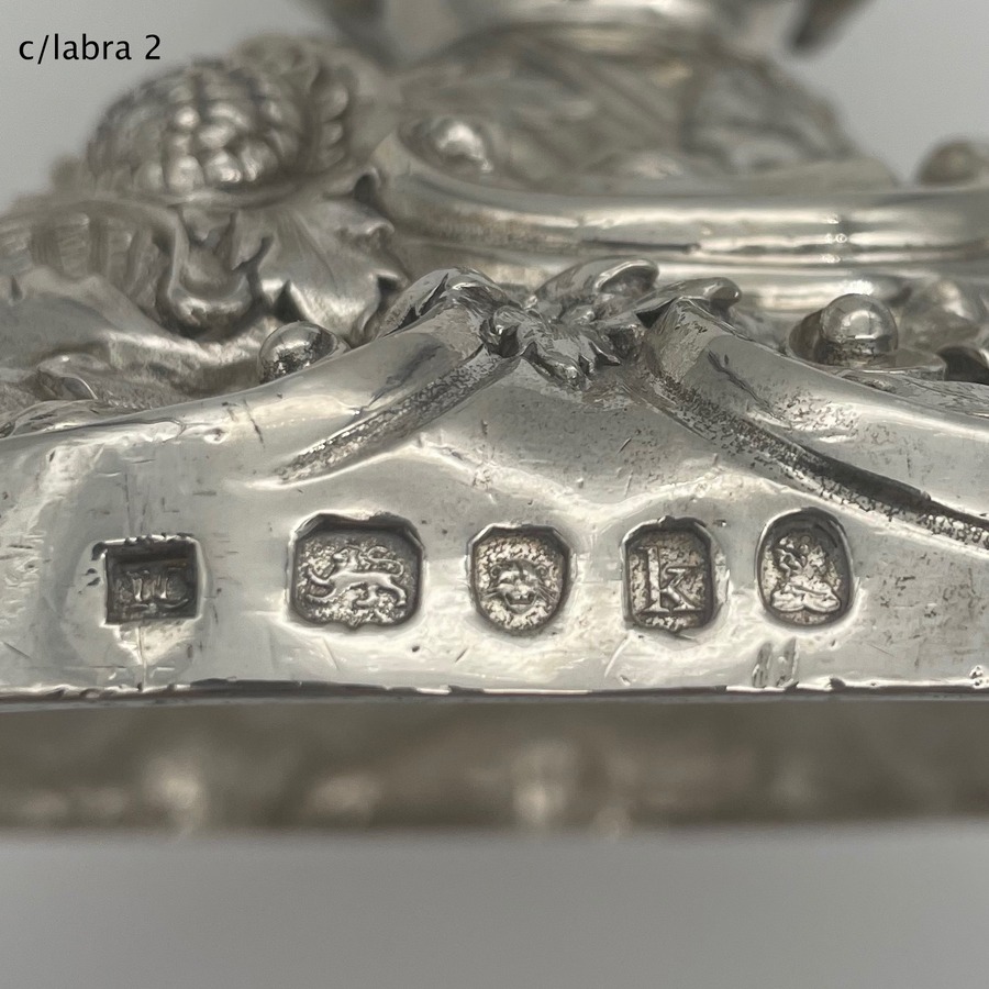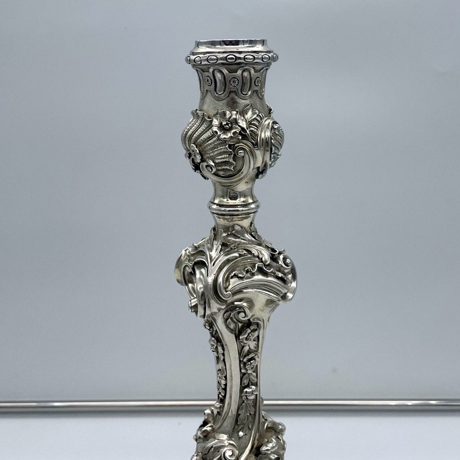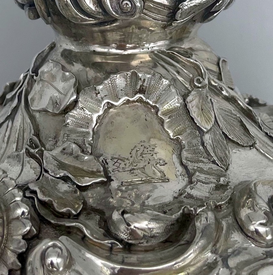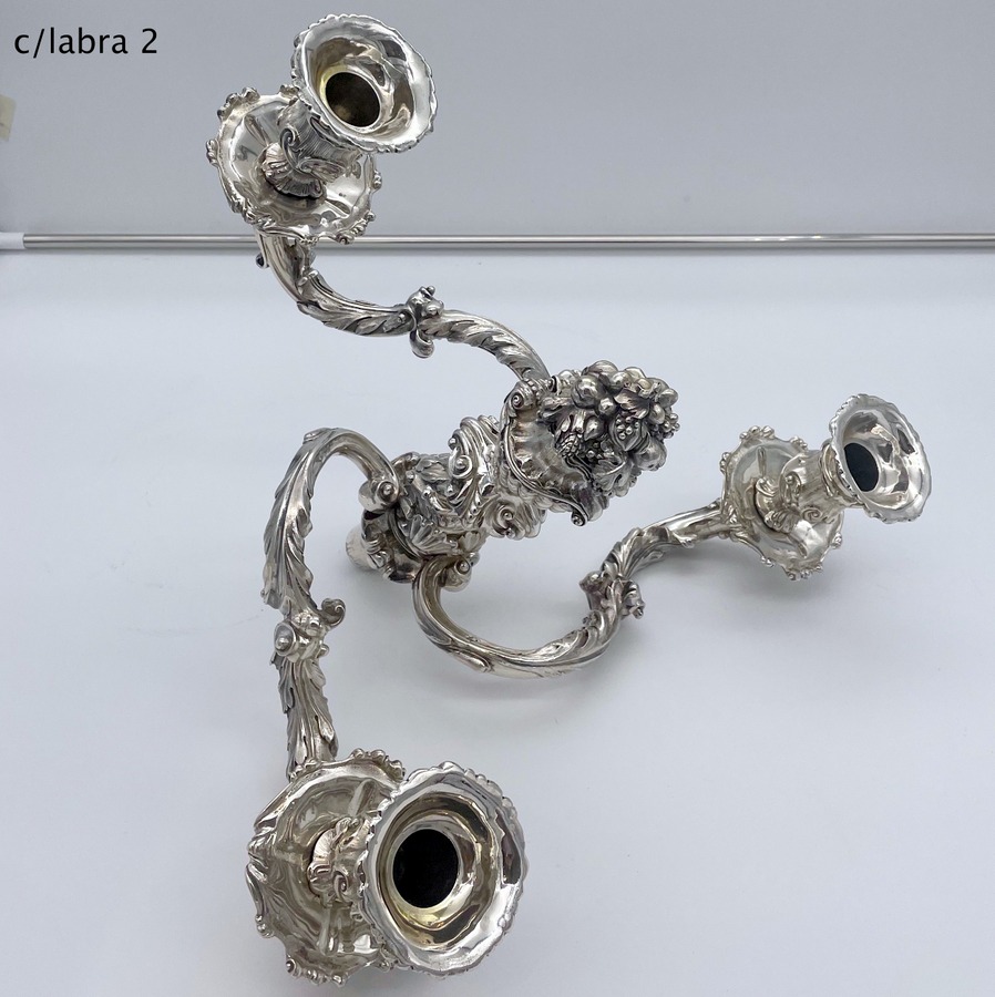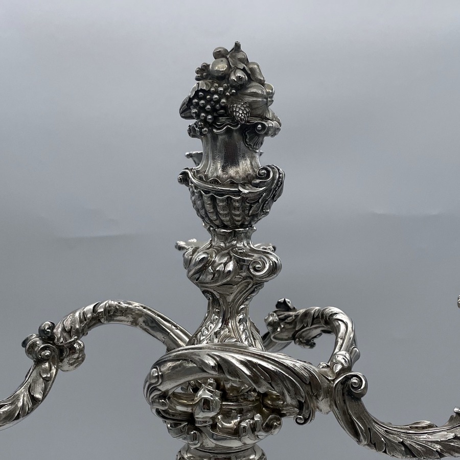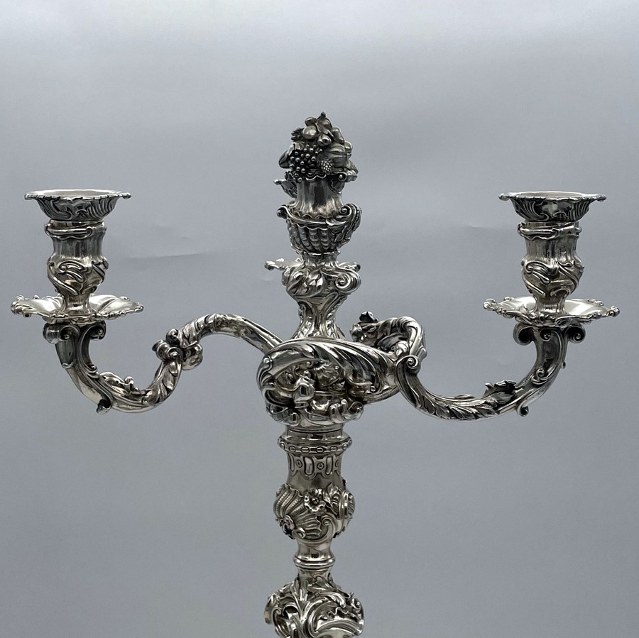 A truly fine and incredibly large pair of four light cast sterling silver candelabra decorated with exquisite floral and scrolling motifs. The branches have additional floral castings and a sumptous scalloped edged central capitial with a detachable extinguisher insert. There are stylish contemporary hand engraved crests and the nozzles (sconces) are removable.