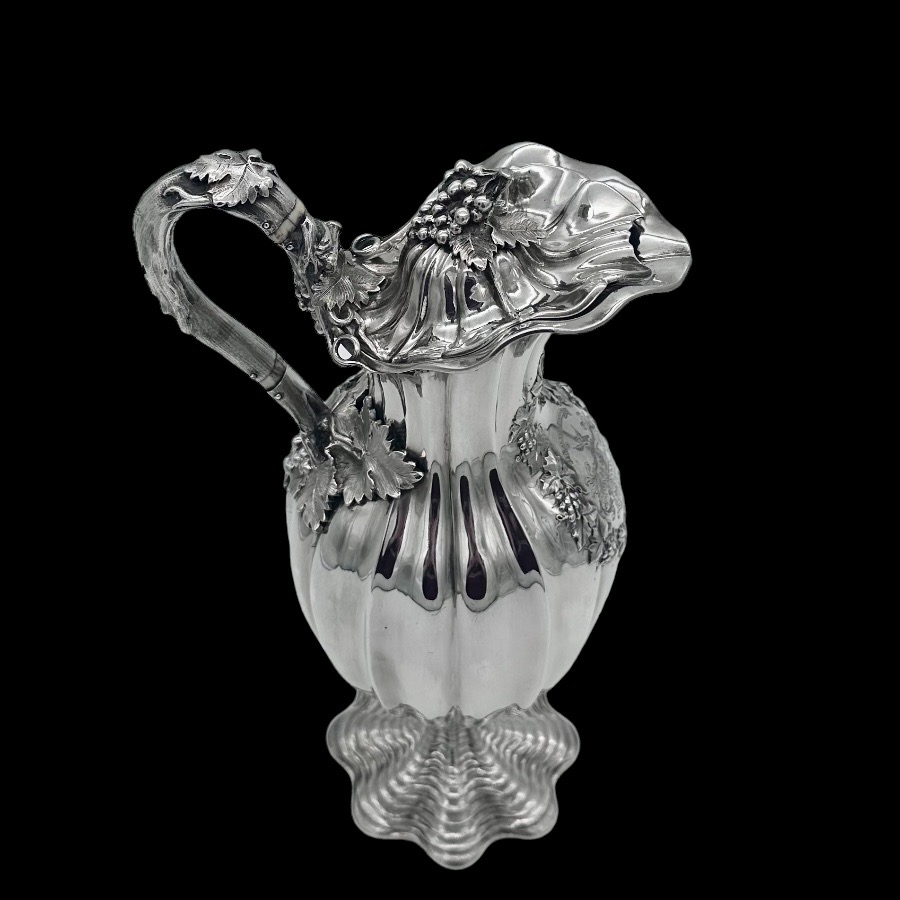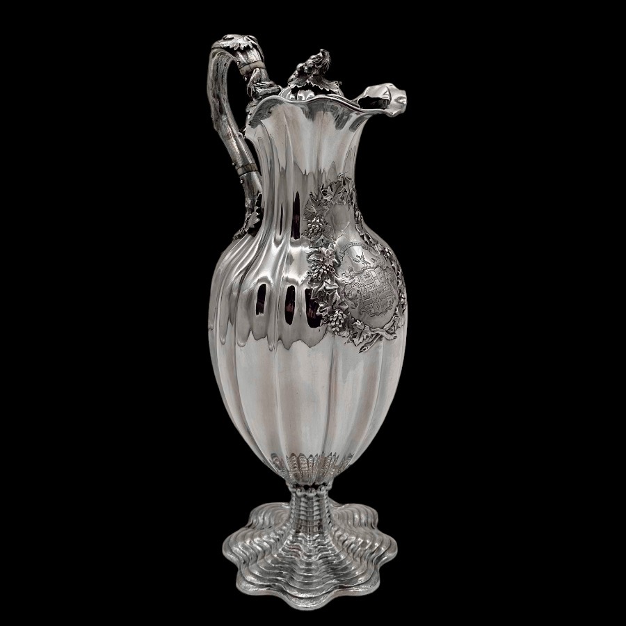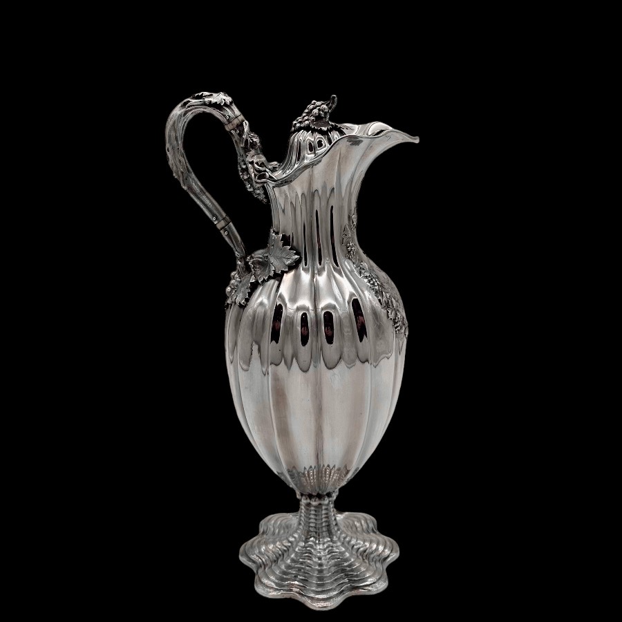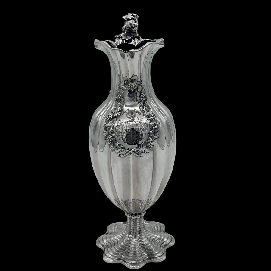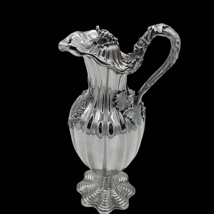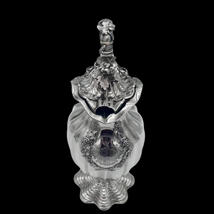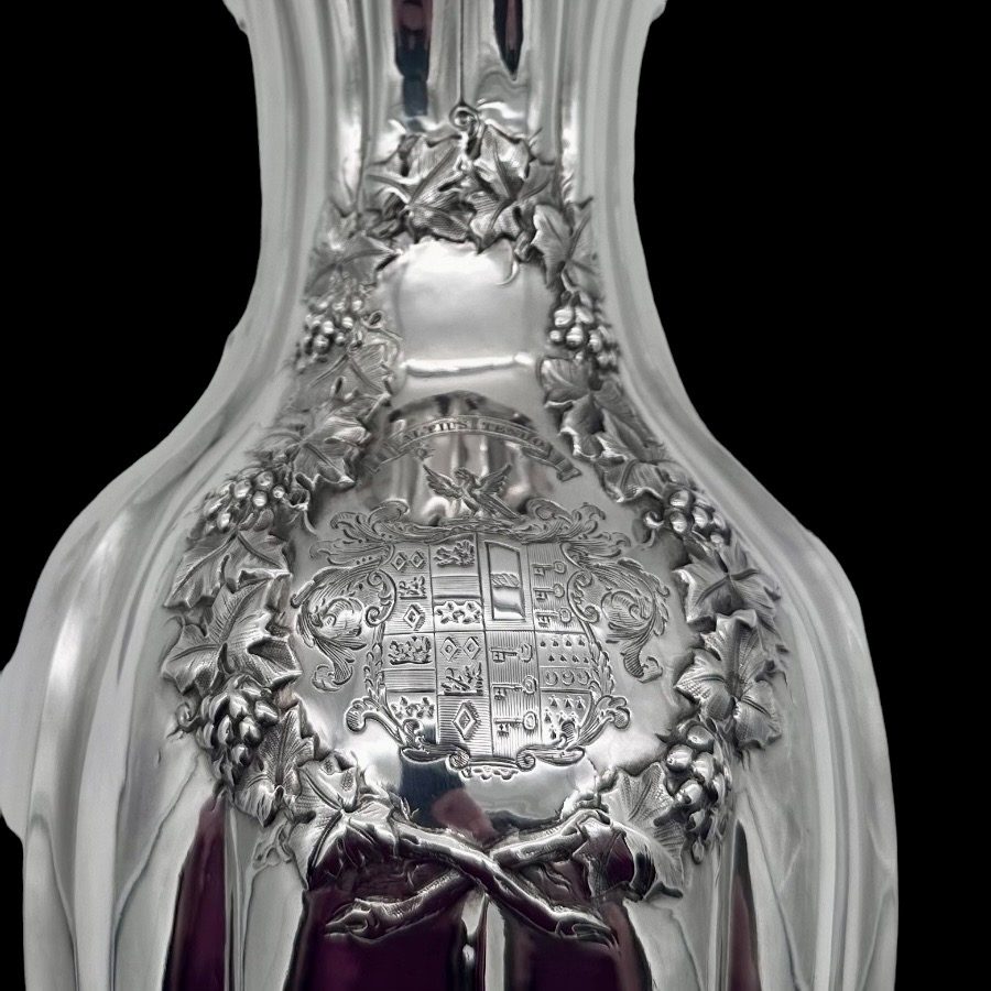 Fabulous early 19th century sterling silver wine jug decorated with stunning grape and vine applied castings and shaped with a stylish ribbed body. The ornate lid is hinged and the jug sits on a marvellous cast scalloped foot. The centre front has a beautiful wreath style cartouche in which sits an original armorial for importance.