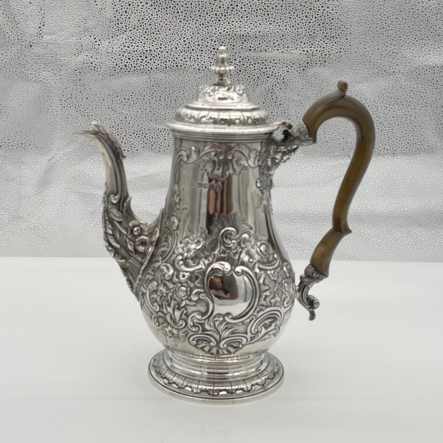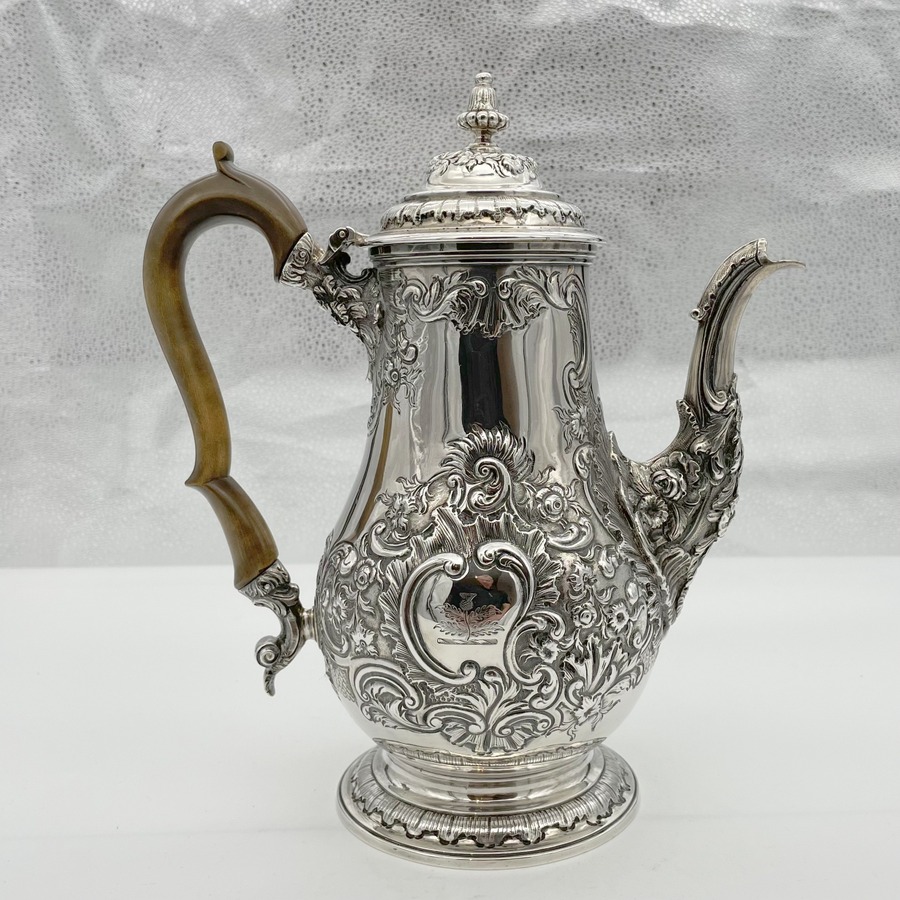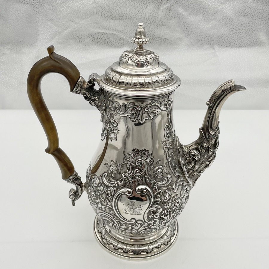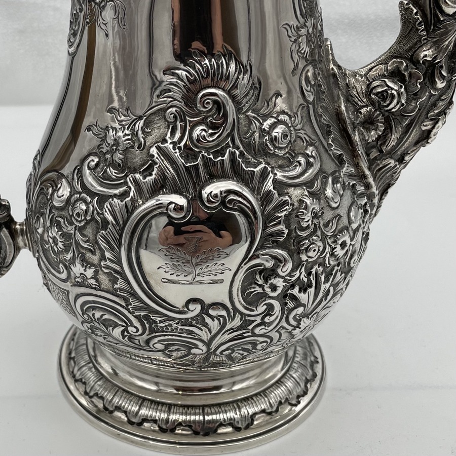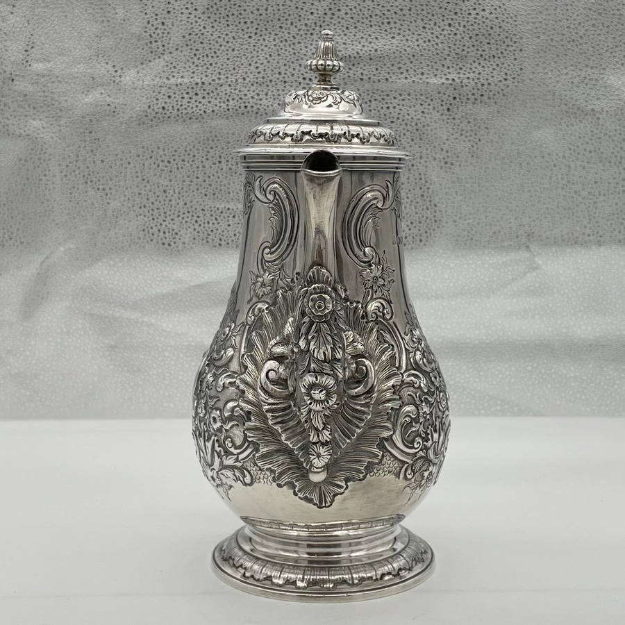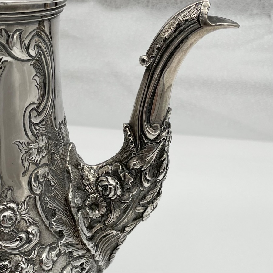 A very fine 19th century Rococo style sterling silver coffee pot decorated with fabulous floral embossing and beautiful framed cartouches. Â The impressively designed cast spout has sumptuous floral motifs for lowlights. Â There is an elegant contemporary hand engraved crest for importance.