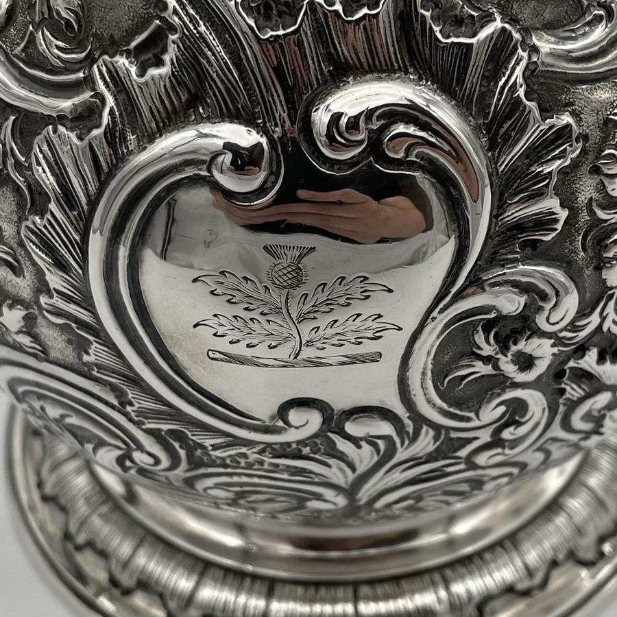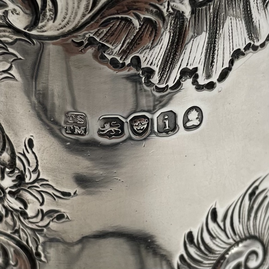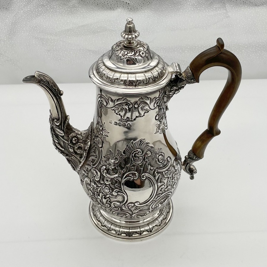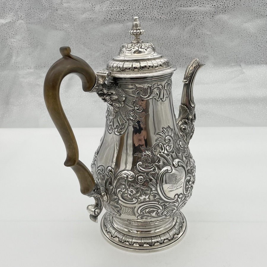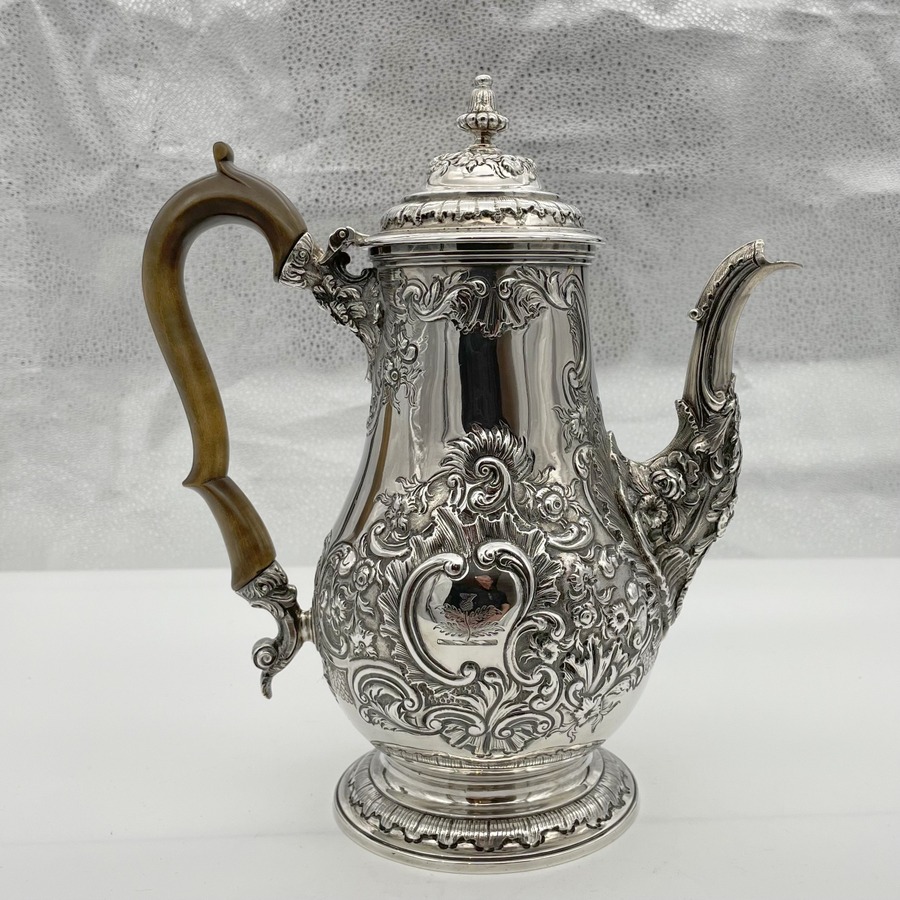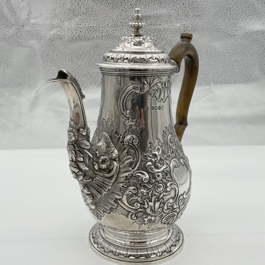 A very fine 19th century Rococo style sterling silver coffee pot decorated with fabulous floral embossing and beautiful framed cartouches. Â The impressively designed cast spout has sumptuous floral motifs for lowlights. Â There is an elegant contemporary hand engraved crest for importance.