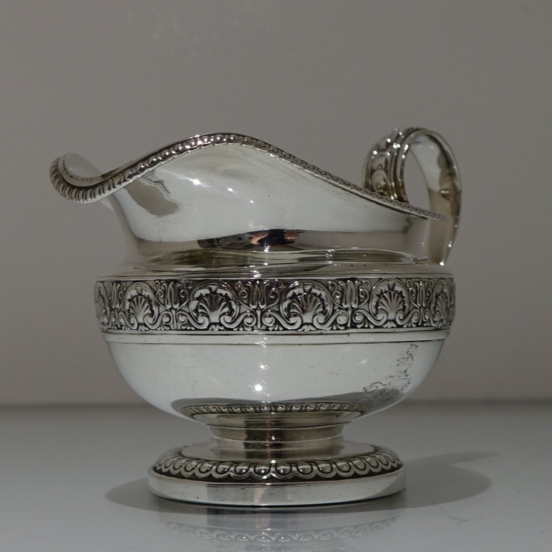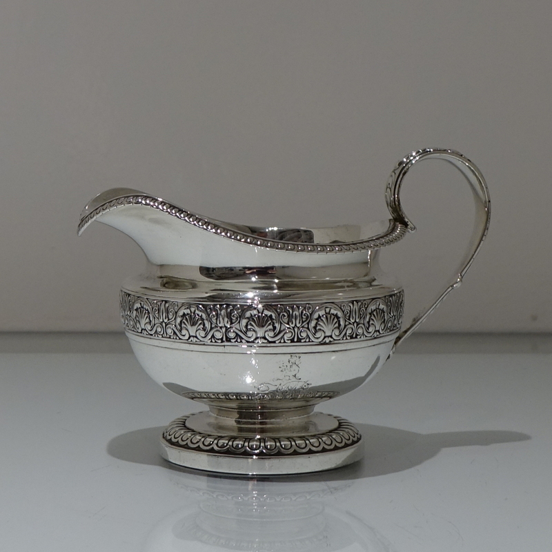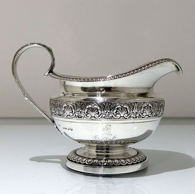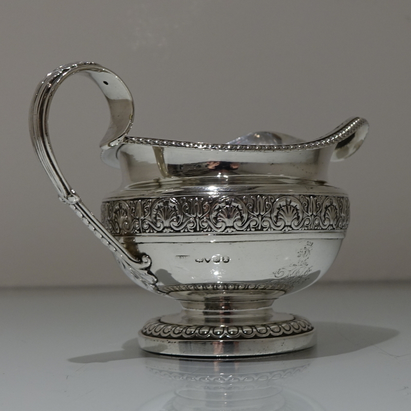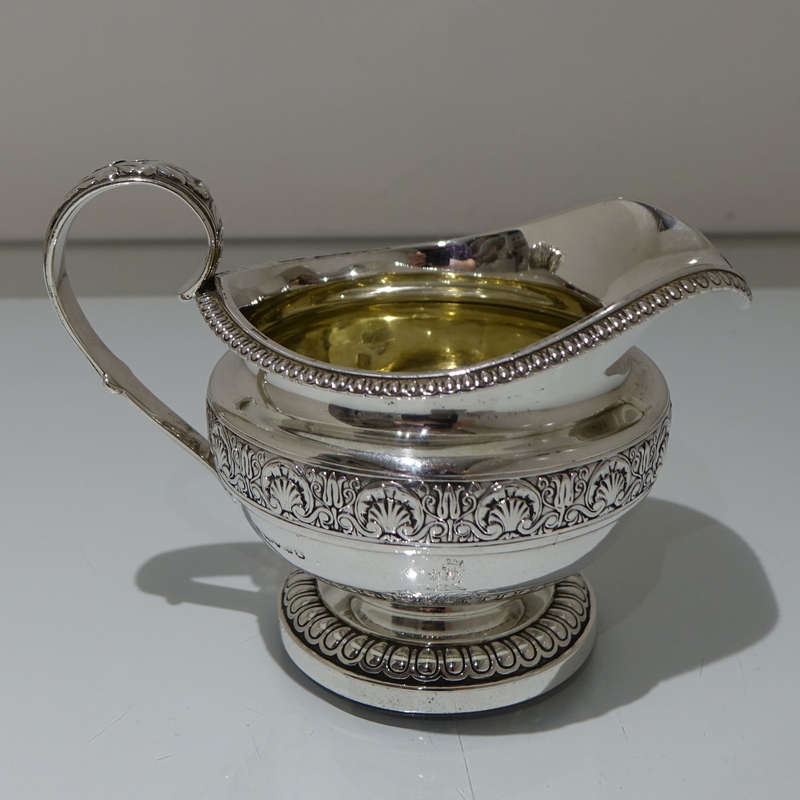 A very fine and incredibly collectable “Phillip Rundell” shaped circular cream jug. Â The body is decorated with an ornate shell galleried band below which sits a double contemporary crest and entwined initials. Â The inside of the bowl has been elegantly silver-gilt and the handle is decorative scroll design.