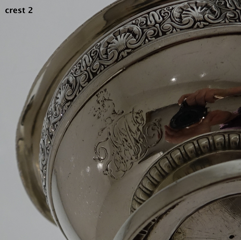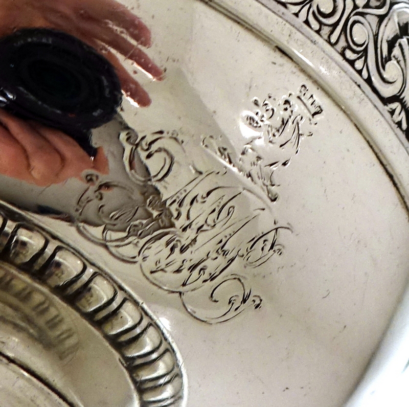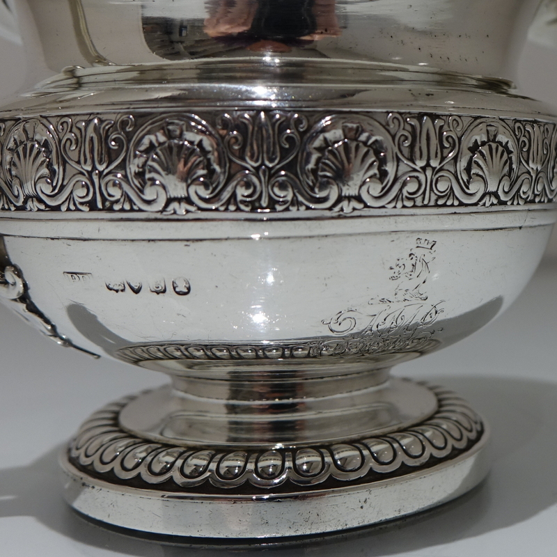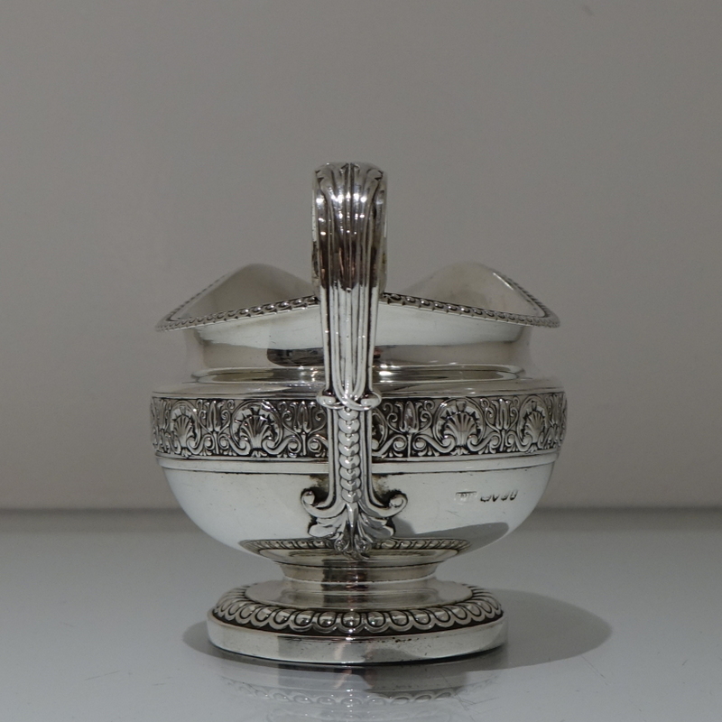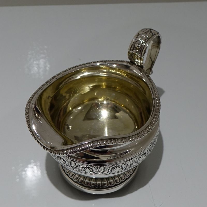 A very fine and incredibly collectable “Phillip Rundell” shaped circular cream jug. Â The body is decorated with an ornate shell galleried band below which sits a double contemporary crest and entwined initials. Â The inside of the bowl has been elegantly silver-gilt and the handle is decorative scroll design.