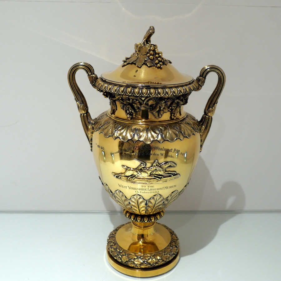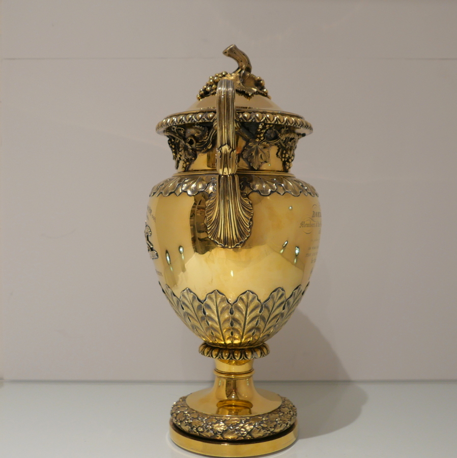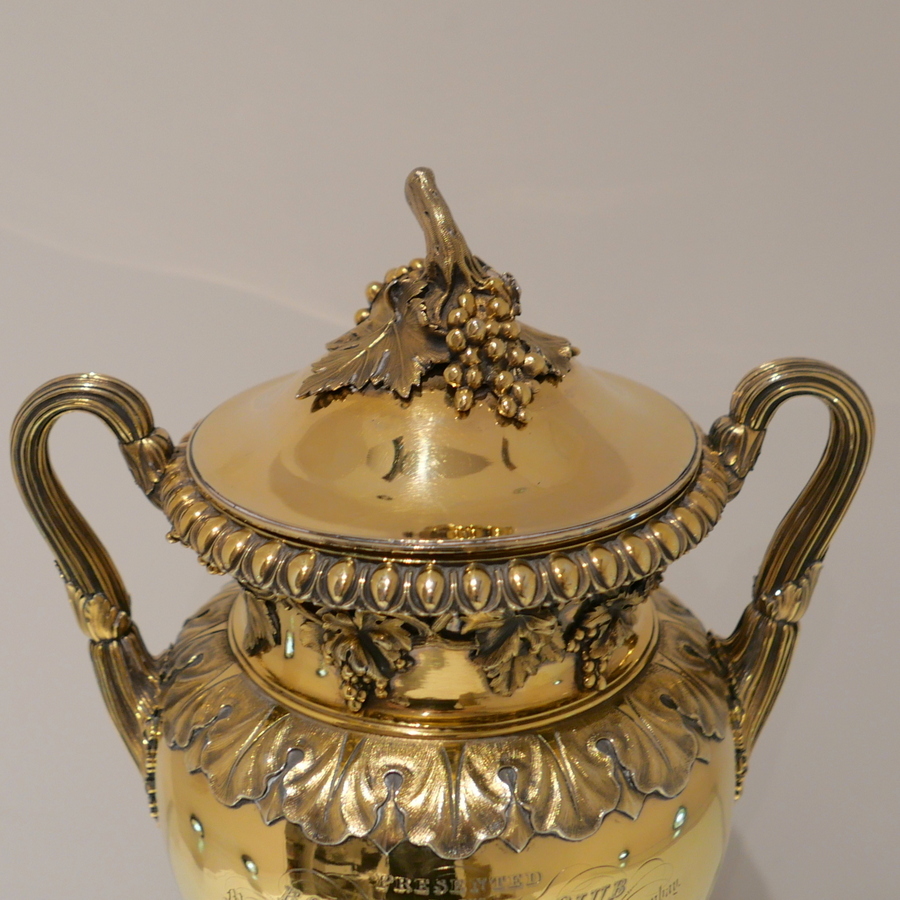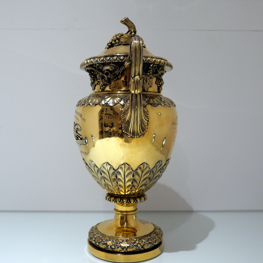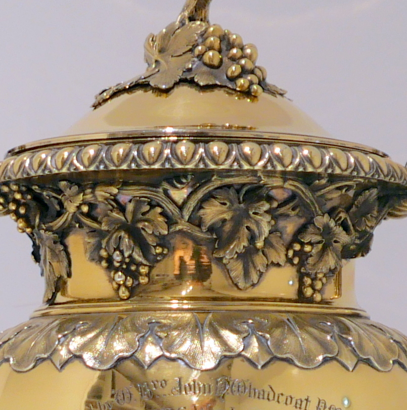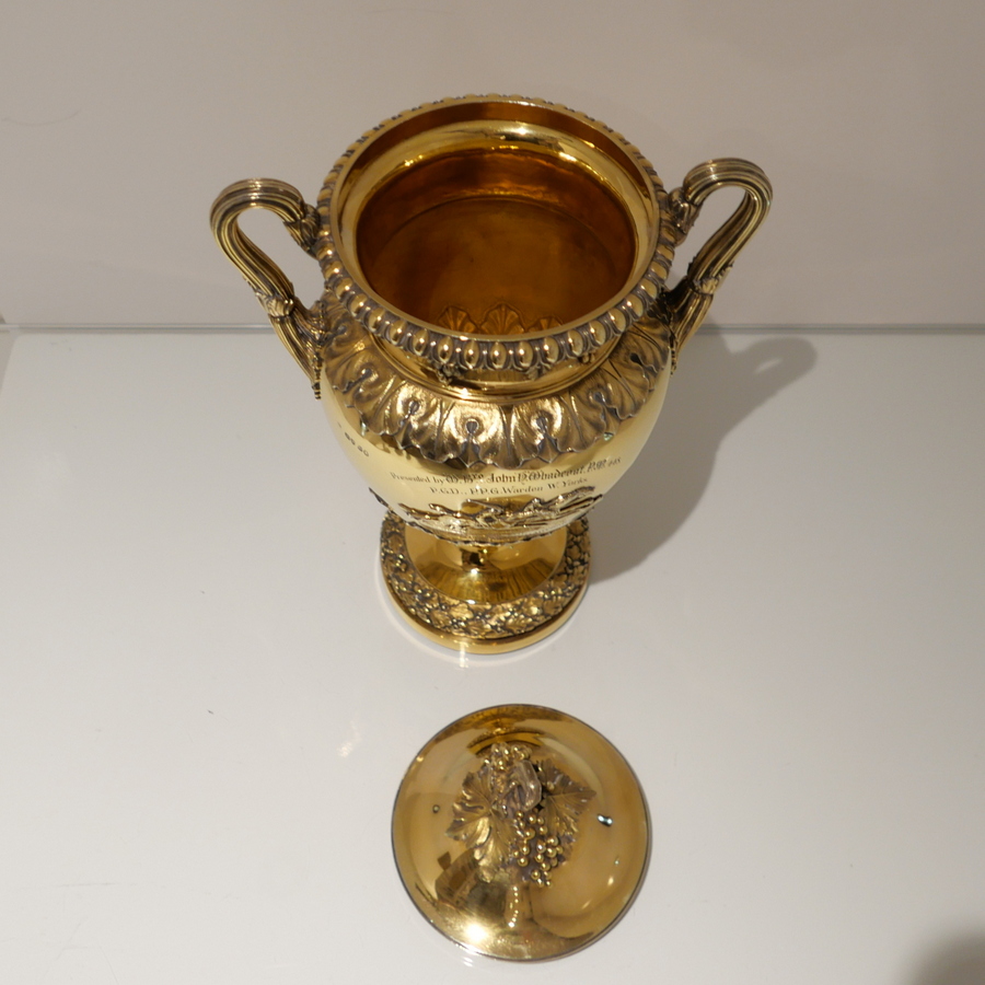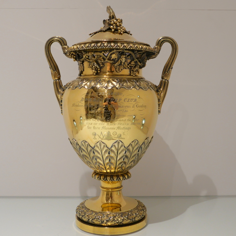 A truly magnificent and highly collectable silver gilt cup and cover made by the highly renowned silversmith Benjamin Smith.  The  body is finely decorated with lower ‘stiff leafage’ embellishments and applied upper grape and vine castings for highlights.  The centre front has stylish ‘horse racing’ scene’s which is surrounded with elegant presentation engraving.  The centre back has additional presentation engravings of the highly collectable ‘masonic’ connotations.
