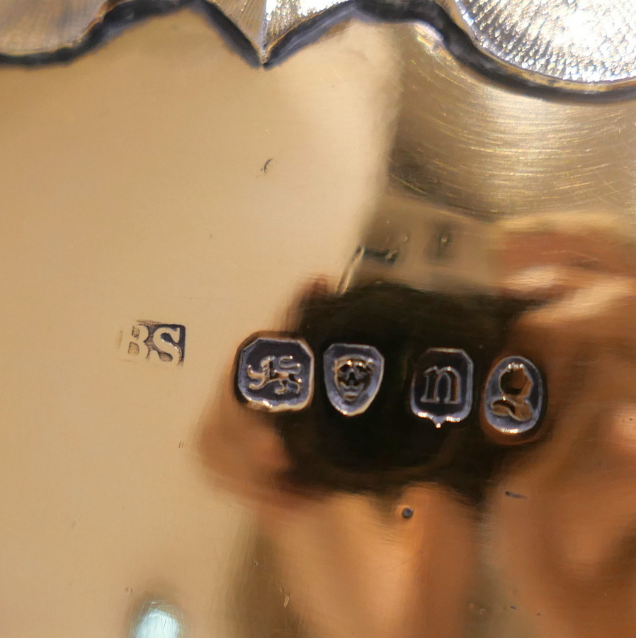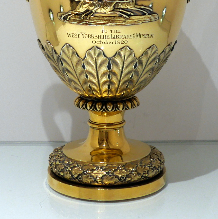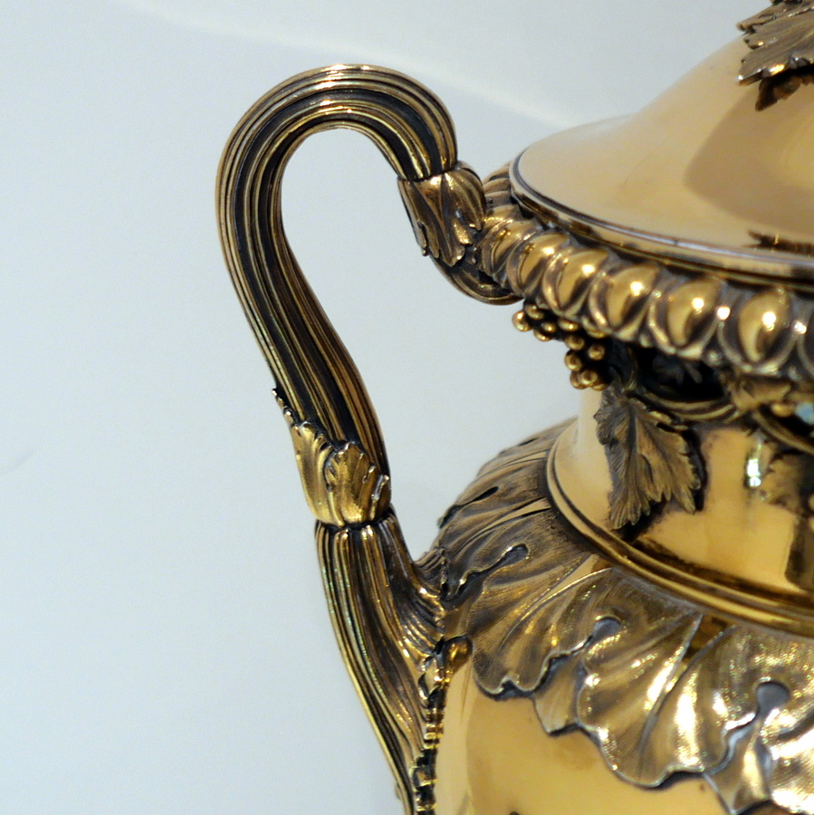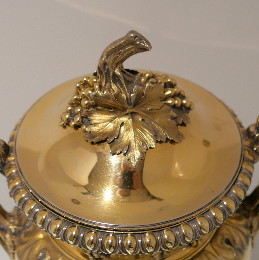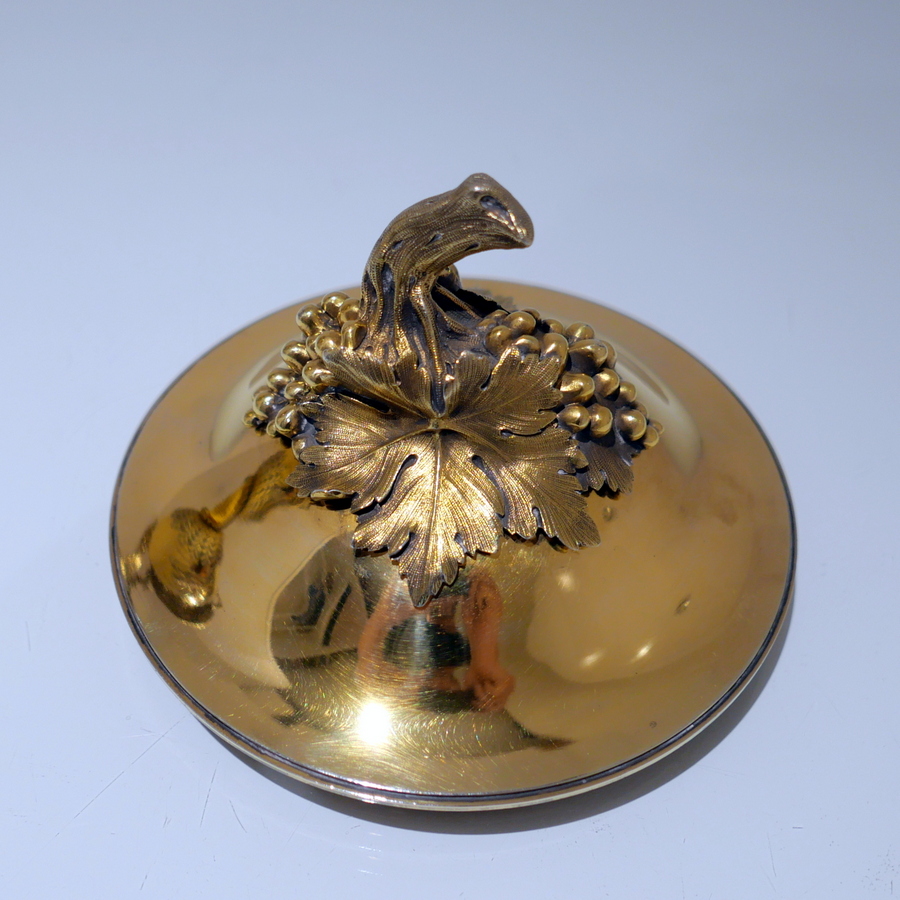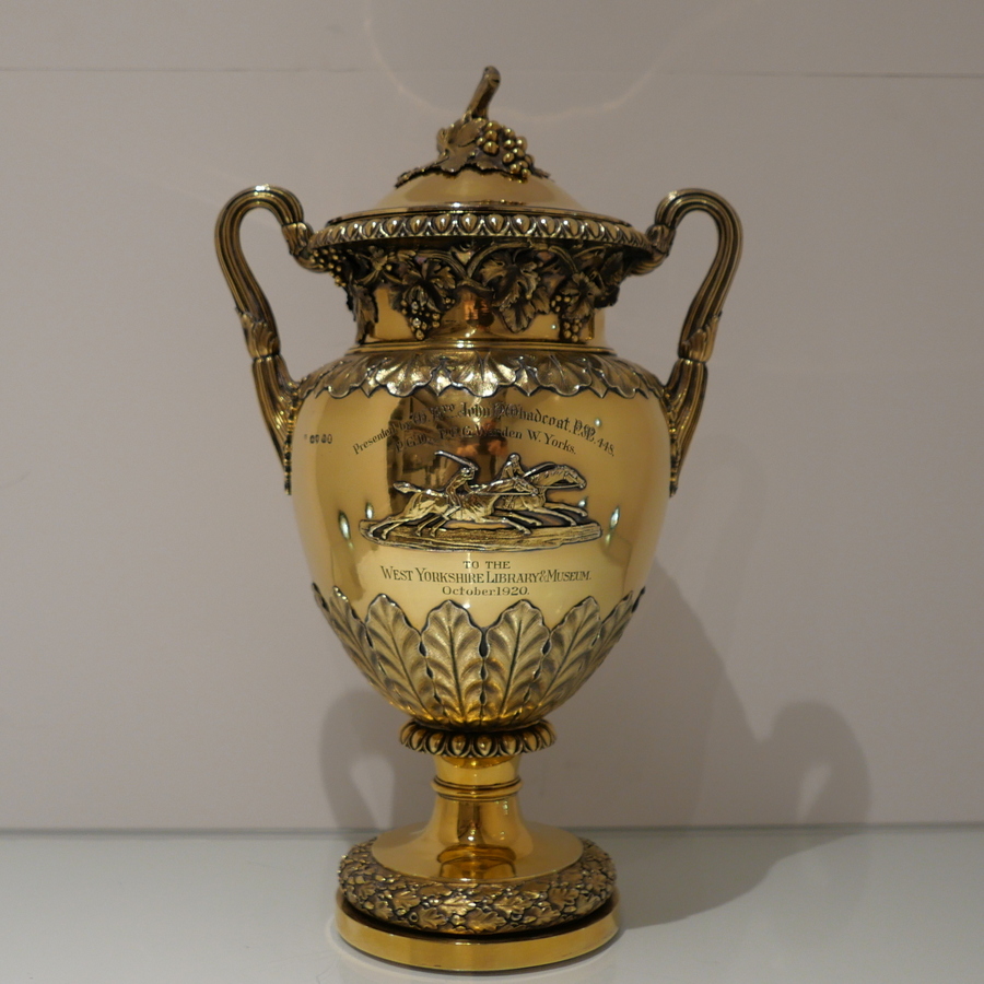 A truly magnificent and highly collectable silver gilt cup and cover made by the highly renowned silversmith Benjamin Smith.  The  body is finely decorated with lower ‘stiff leafage’ embellishments and applied upper grape and vine castings for highlights.  The centre front has stylish ‘horse racing’ scene’s which is surrounded with elegant presentation engraving.  The centre back has additional presentation engravings of the highly collectable ‘masonic’ connotations.