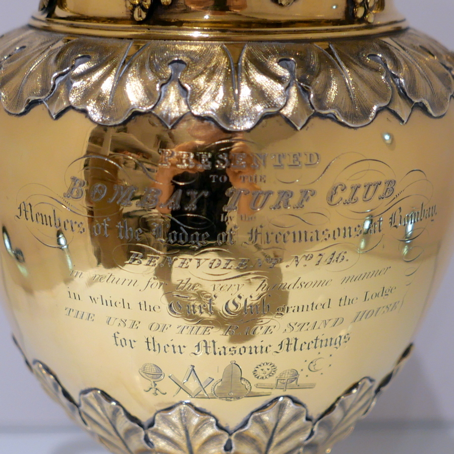 Note: Â The inscriptions read as follows “Presented to the Bombay Turf Club Members of the lodge of Freemasons Bombay Benevolent No 746 in return for the very handsome manner in which the Turf Club granted the Lodge The Use of The Race Stand House for their Masonic Meetings”