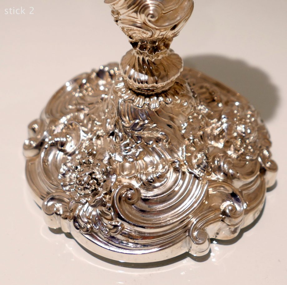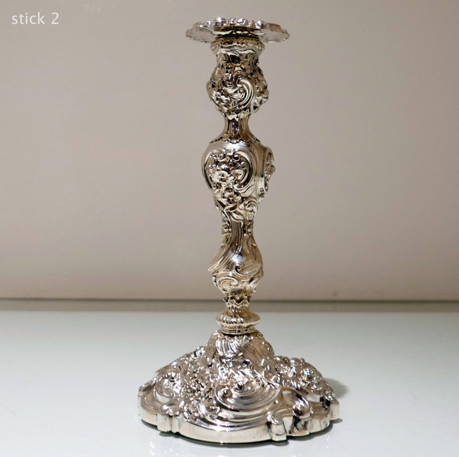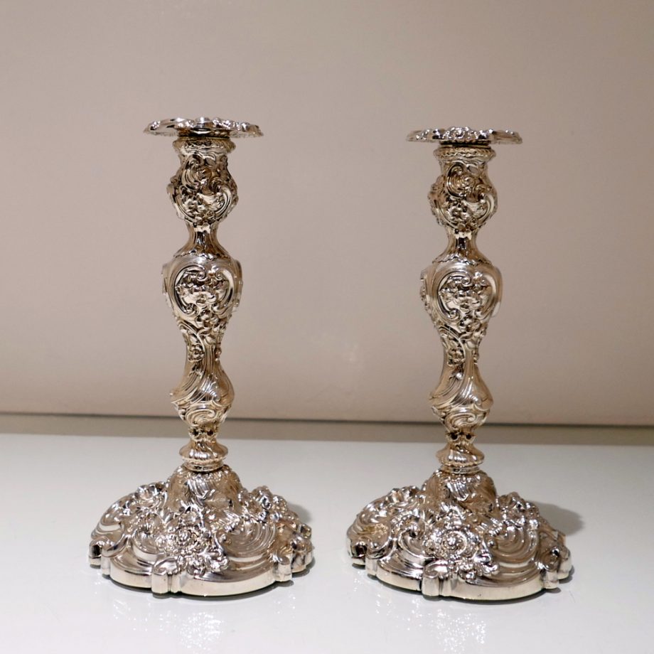 A beautiful pair of late Georgian silver candlesticks decorated with highly ornate floral embossing throughout. Â The bases are shaped circular in design and the nozzles are detachable.