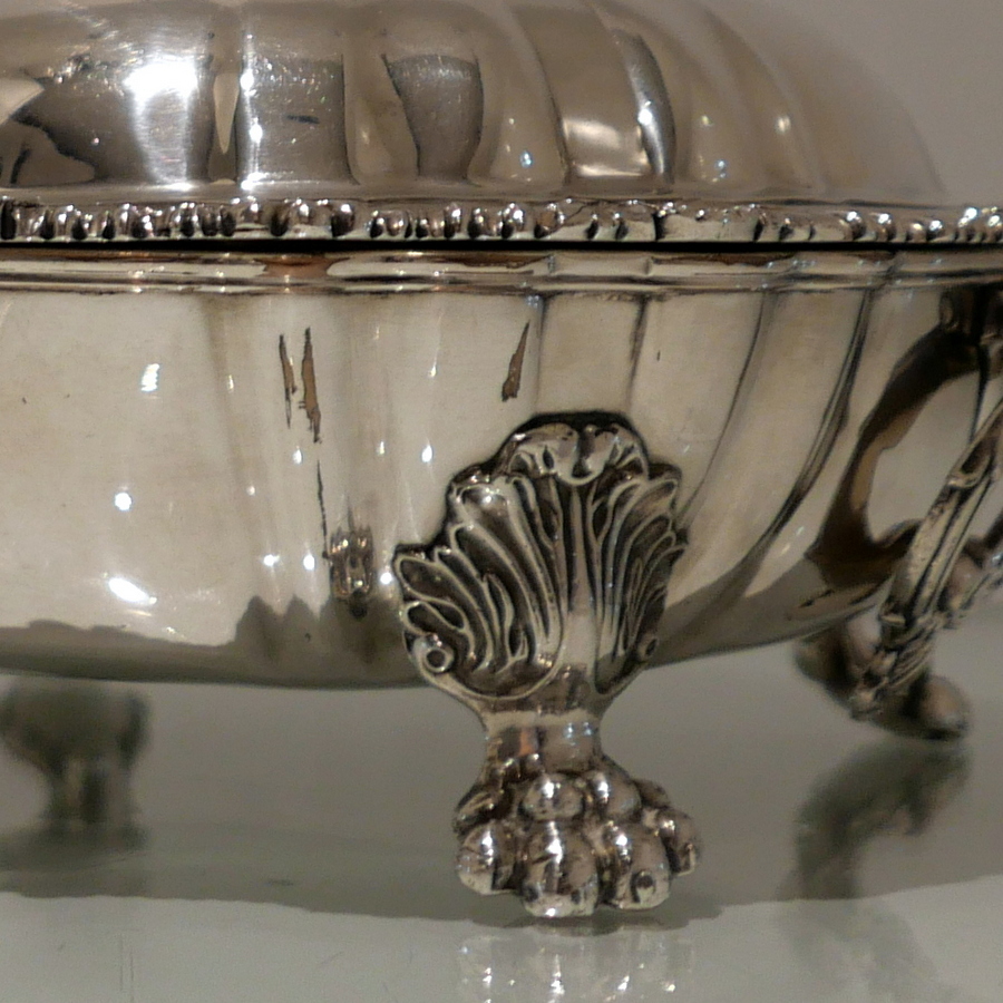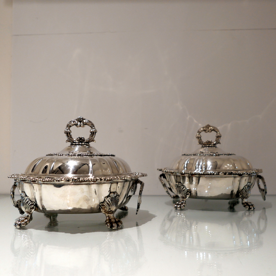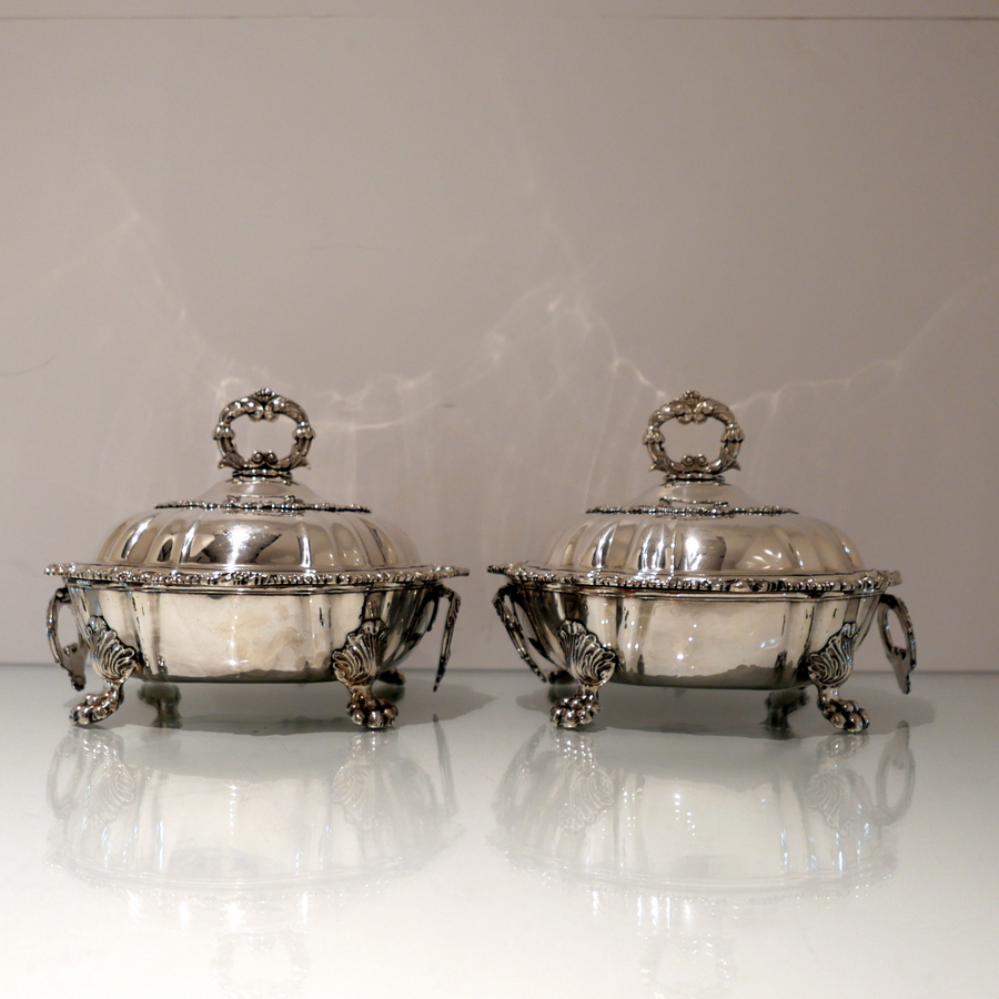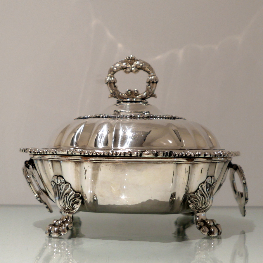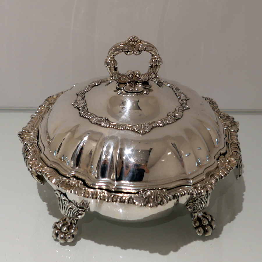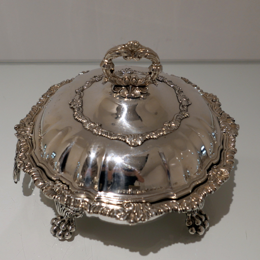 A truly fine and exceptional quality pair of late Georgian shaped circular entree dishes decorated with stylish shell and gadroon borders and sitting on Old Sheffield Plate warmers. Â The domed lid has lower ‘rib’ work designs for lowlights.
