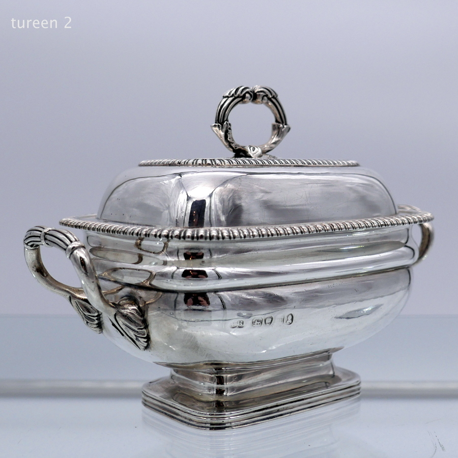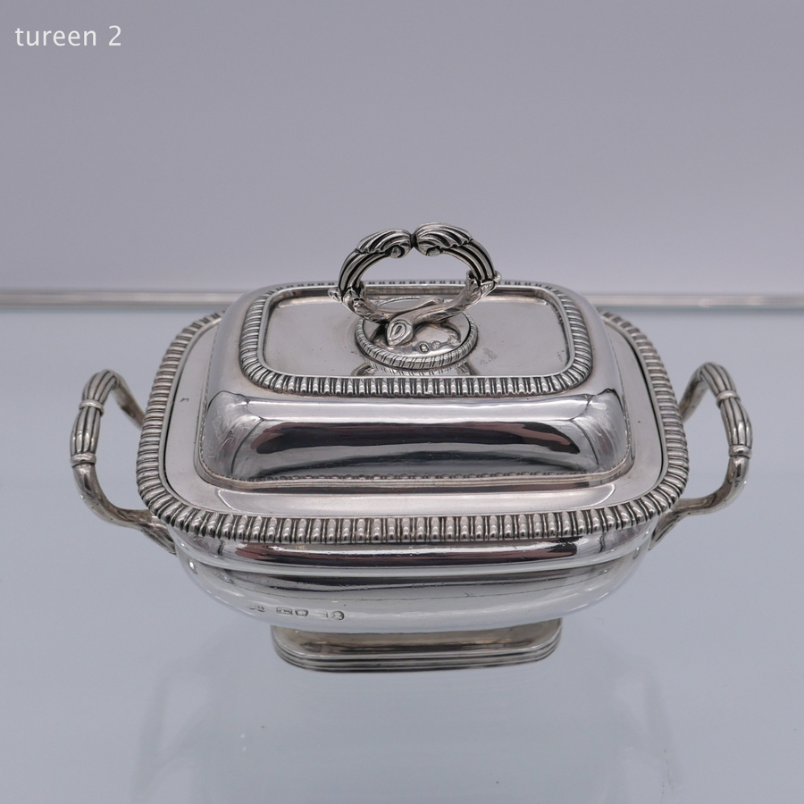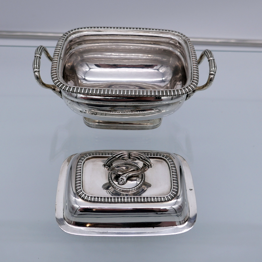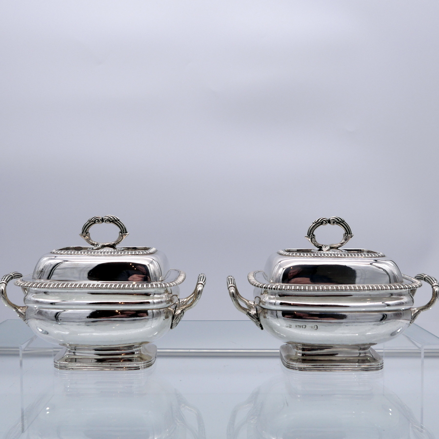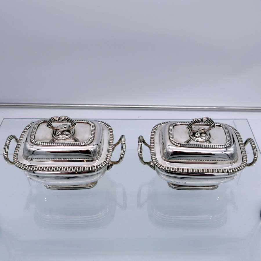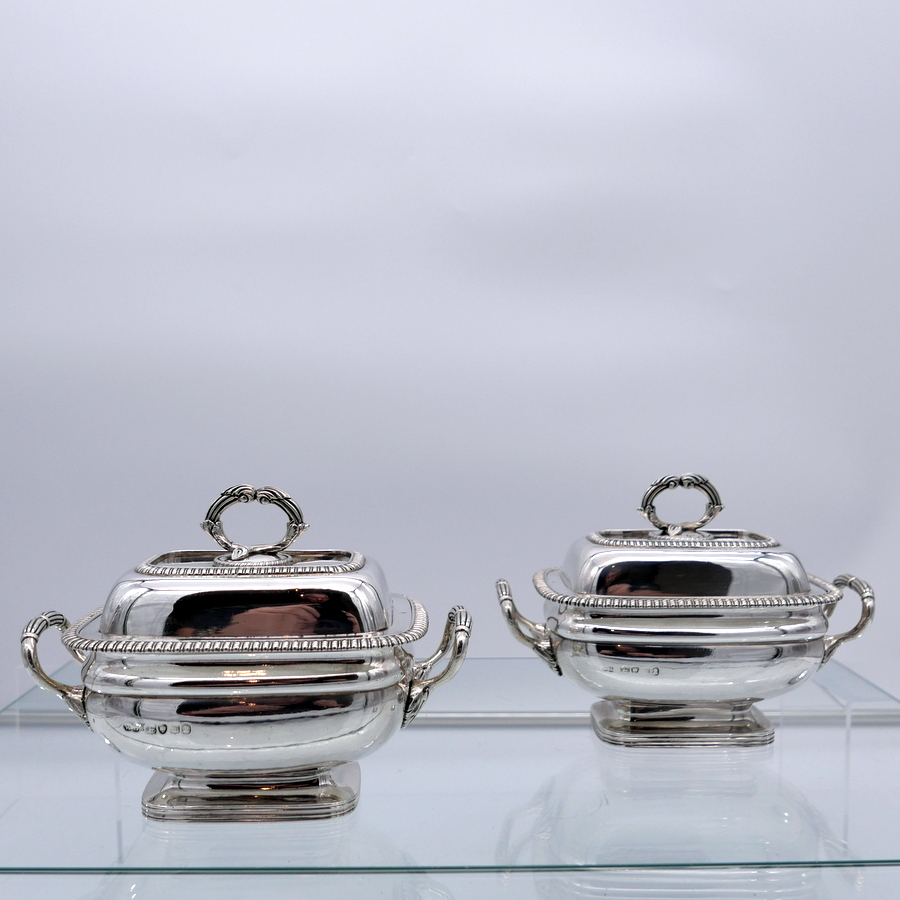 A wonderful pair of Georgian silver oblong sauce tureens decorated with elegant gadroon wires and beautiful bayonet fitted handles.