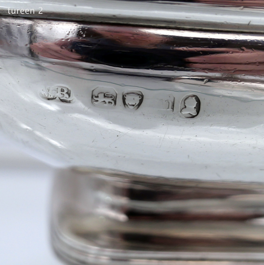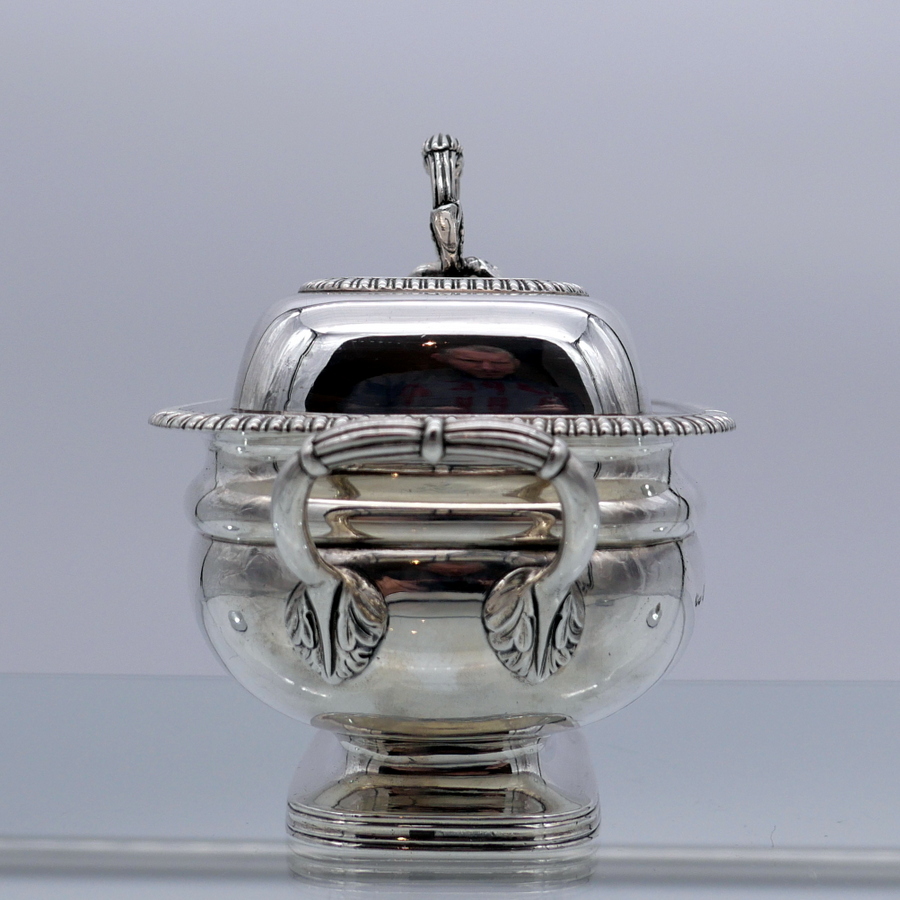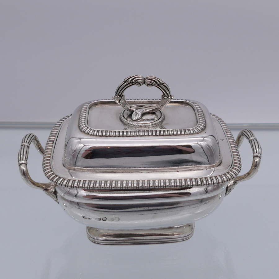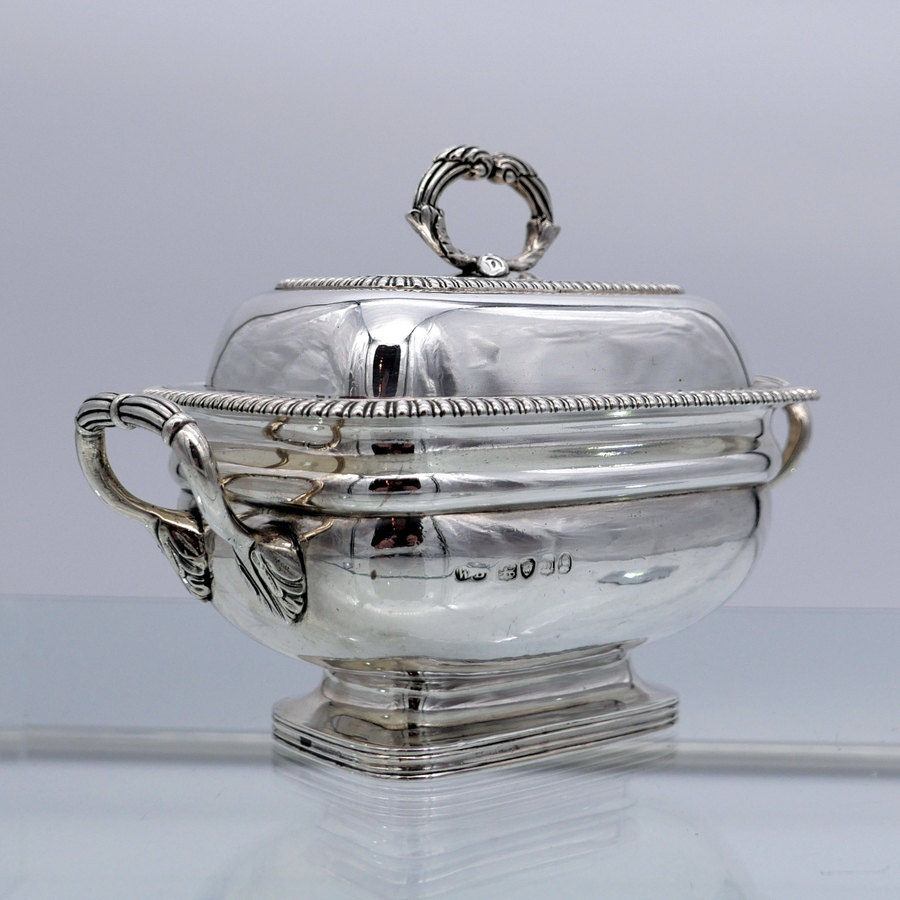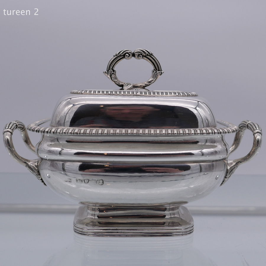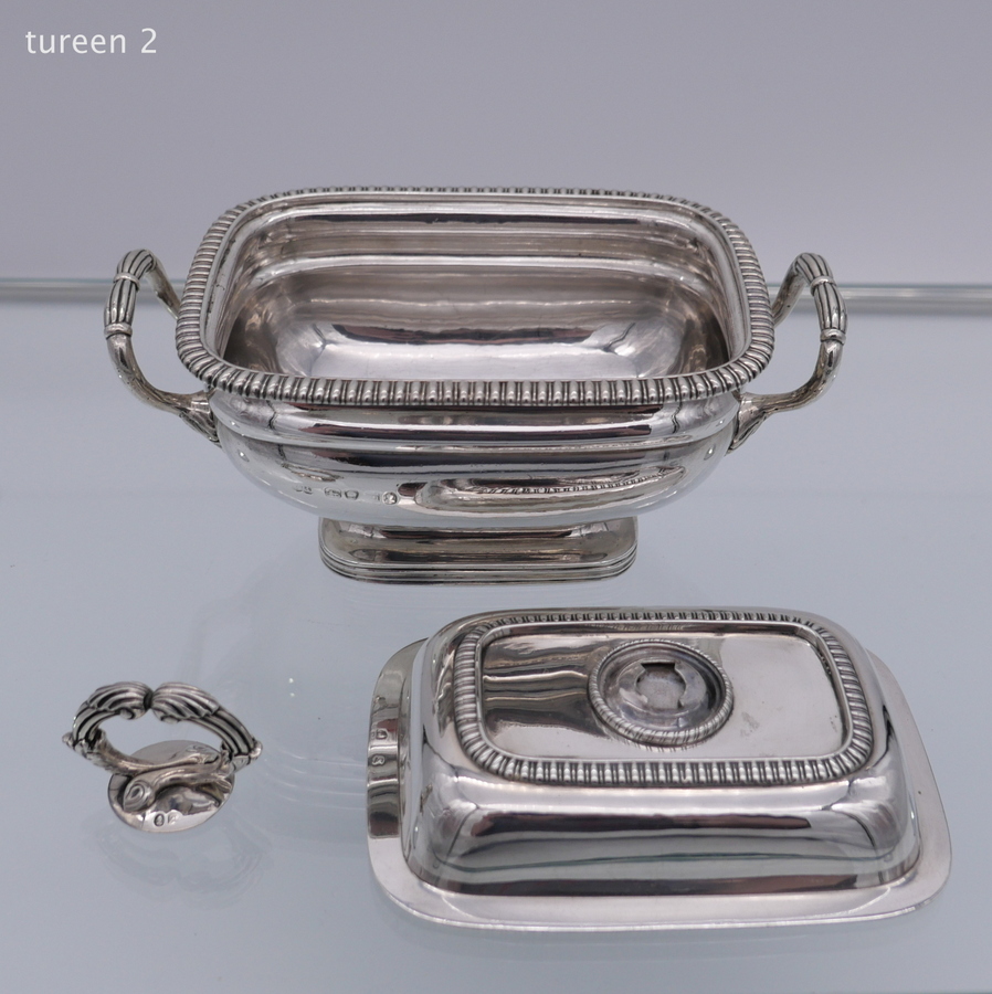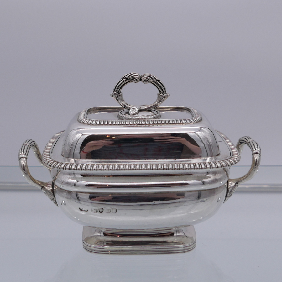 A wonderful pair of Georgian silver oblong sauce tureens decorated with elegant gadroon wires and beautiful bayonet fitted handles.