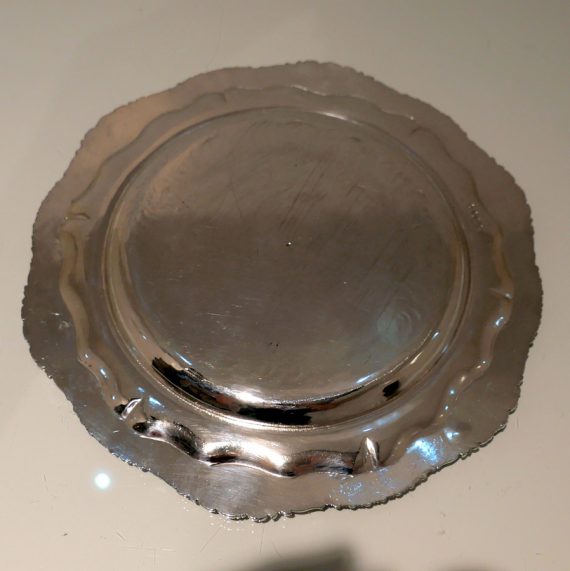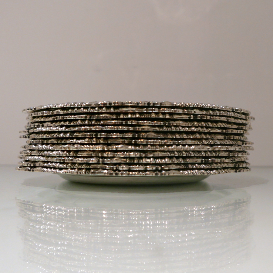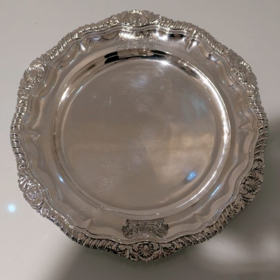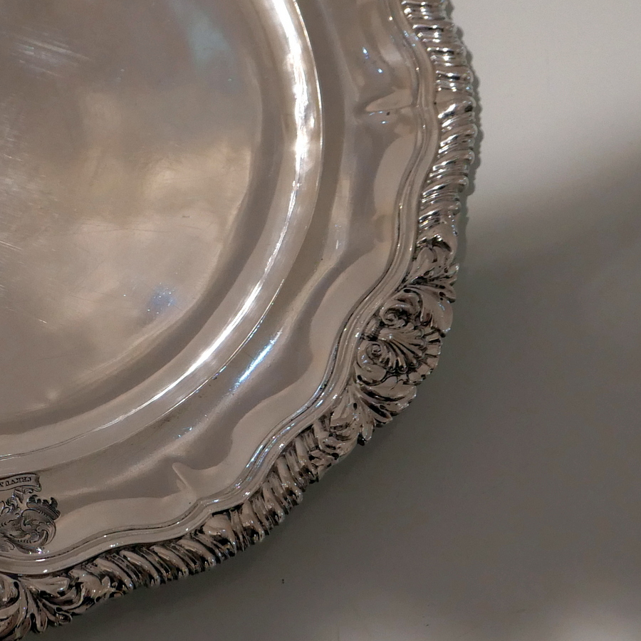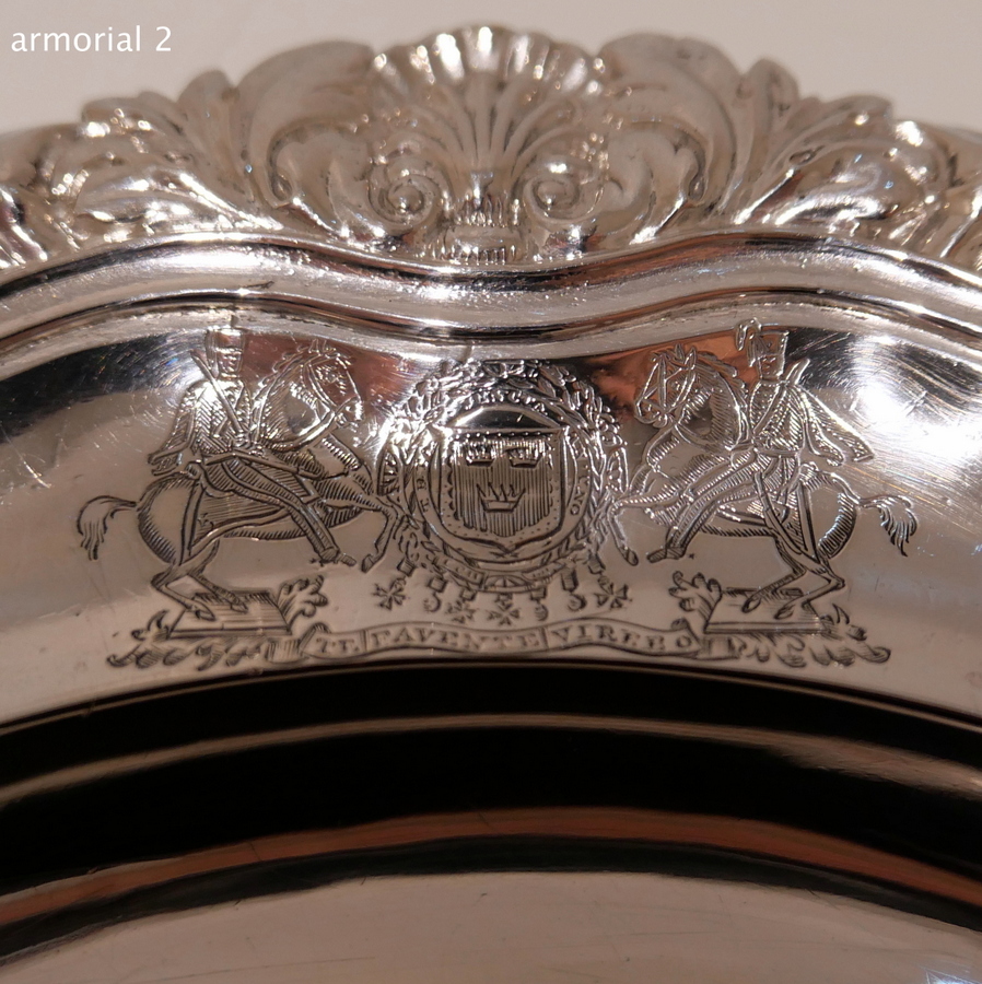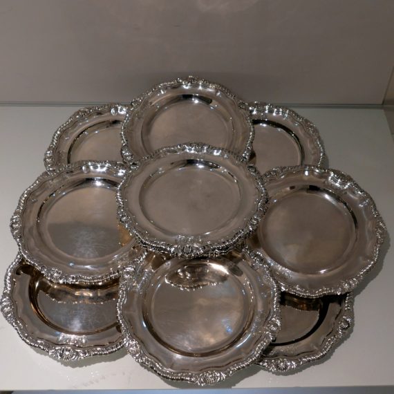 This is one of the finest sets of twelve shaped circular Georgian silver dinner plates available decorated with a supremely crisp shell and gadroon border and sumptuously hand engraved contemporary armorials etched at a ‘north’ ‘south’ positioning for probably two prominent families entwining?