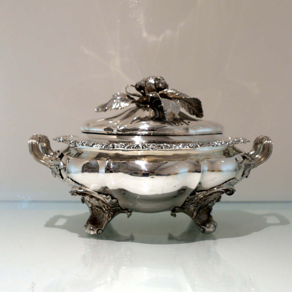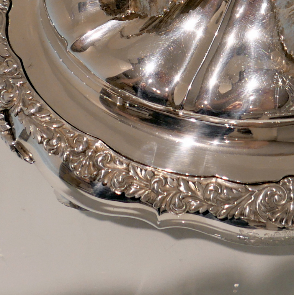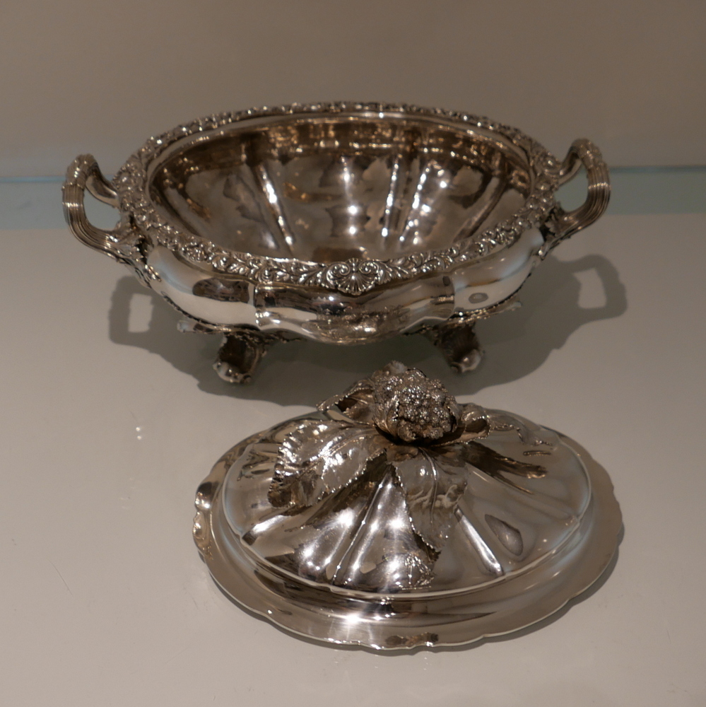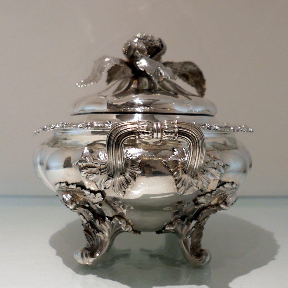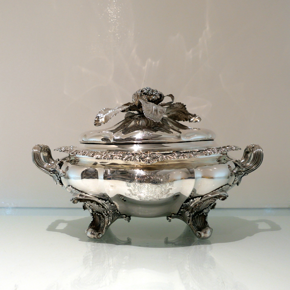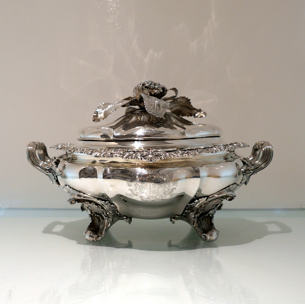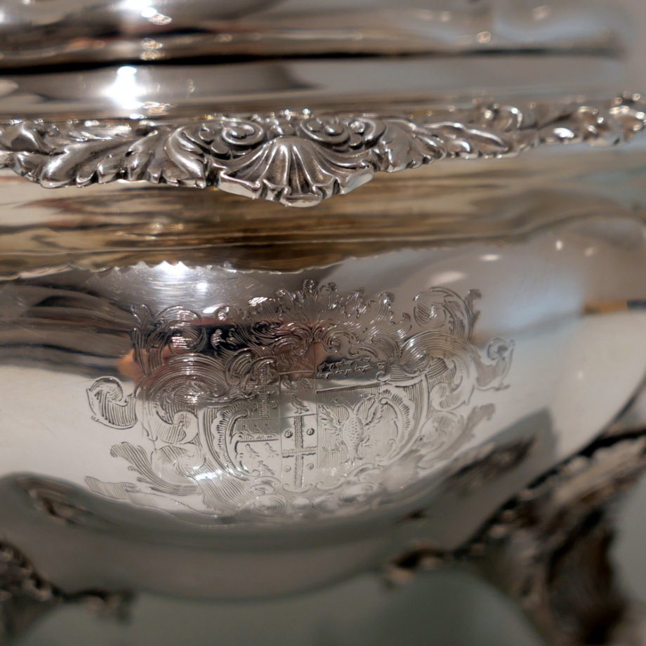 A truly exceptional quality shaped oval silver soup tureen decorated with floral and shell borders. Â The tureen sits on four impressive foliate feet and the detachable lid has a stunningly magnificent handle. Â The centre front of the body has a stylish contemporary armorial and the lid has a contemporary crest for importance.