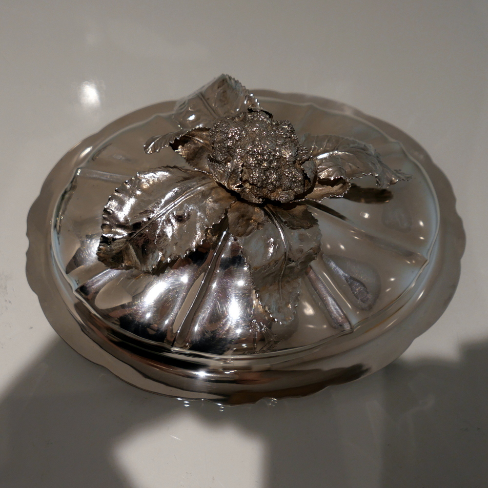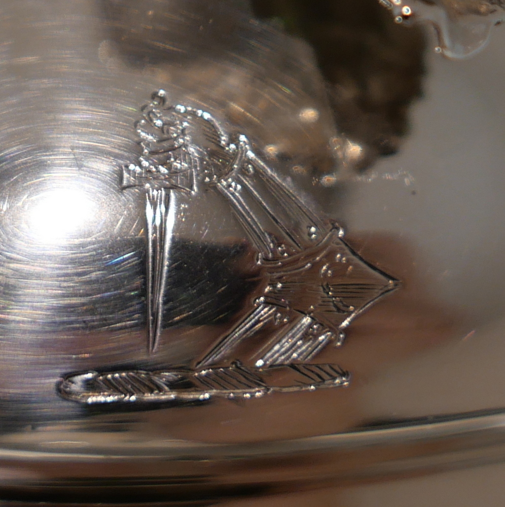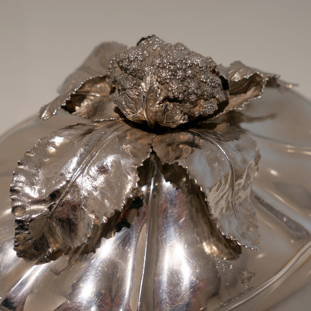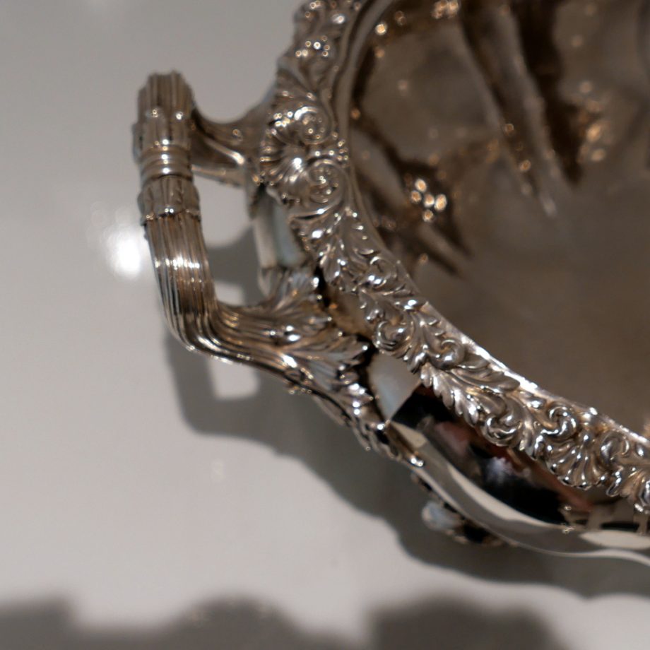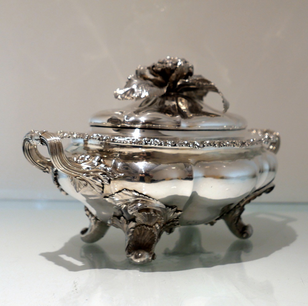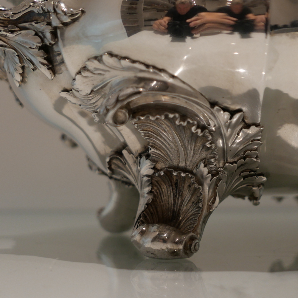 A truly exceptional quality shaped oval silver soup tureen decorated with floral and shell borders. Â The tureen sits on four impressive foliate feet and the detachable lid has a stunningly magnificent handle. Â The centre front of the body has a stylish contemporary armorial and the lid has a contemporary crest for importance.