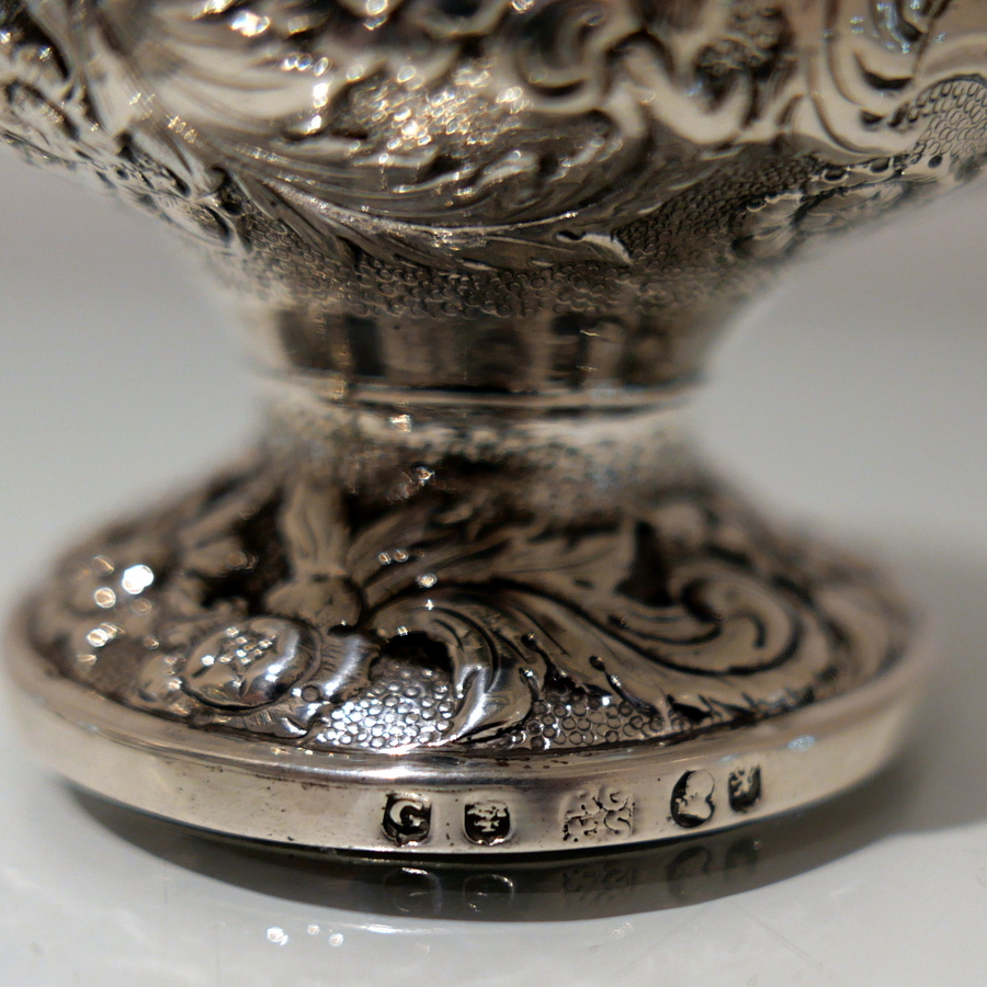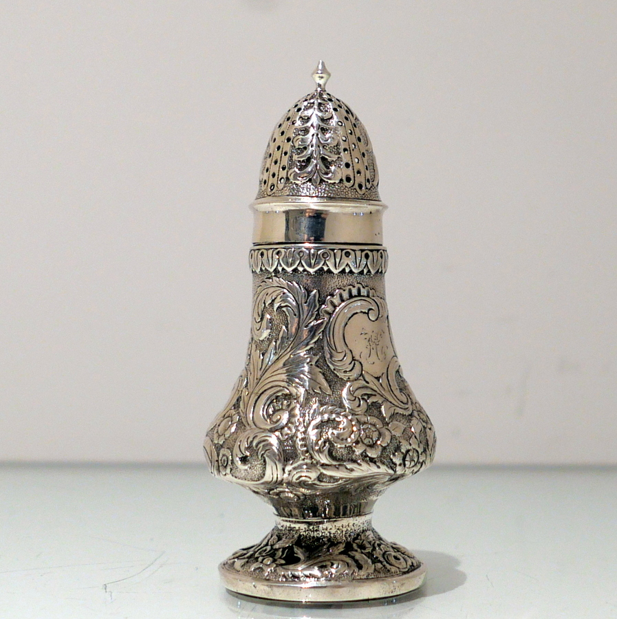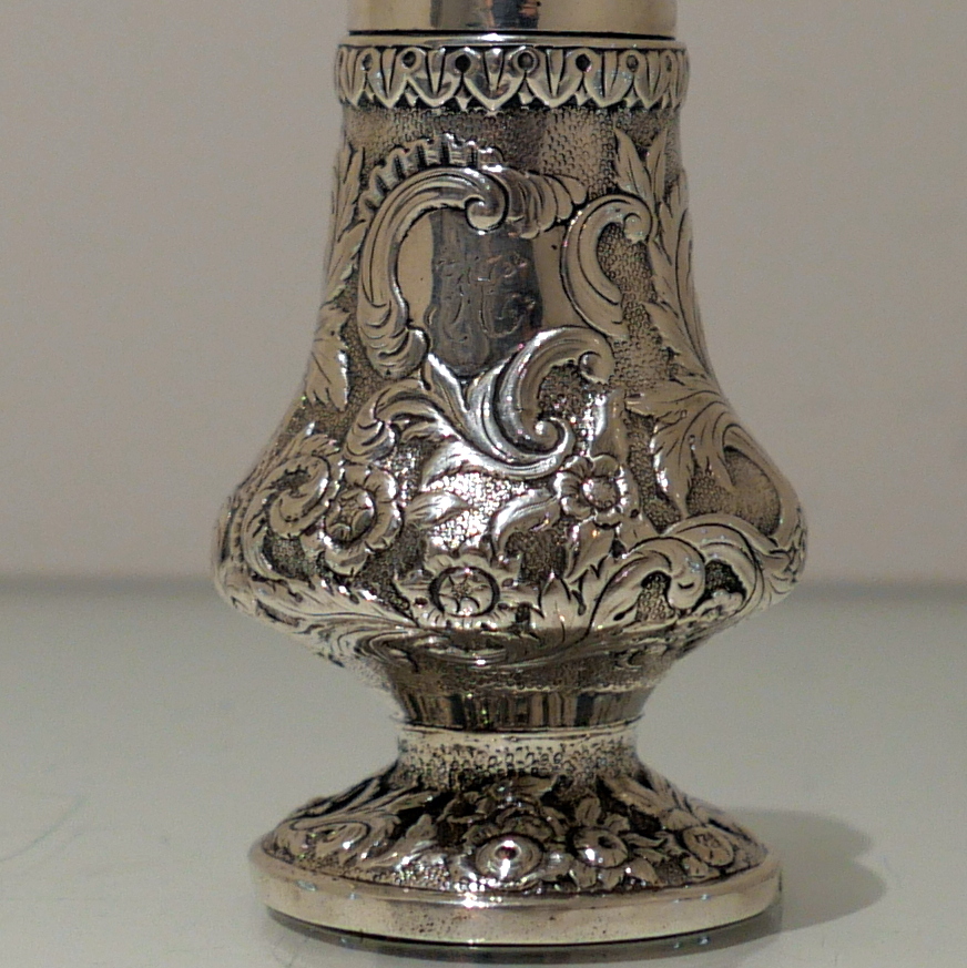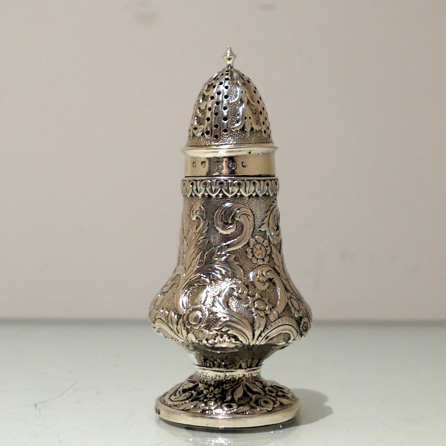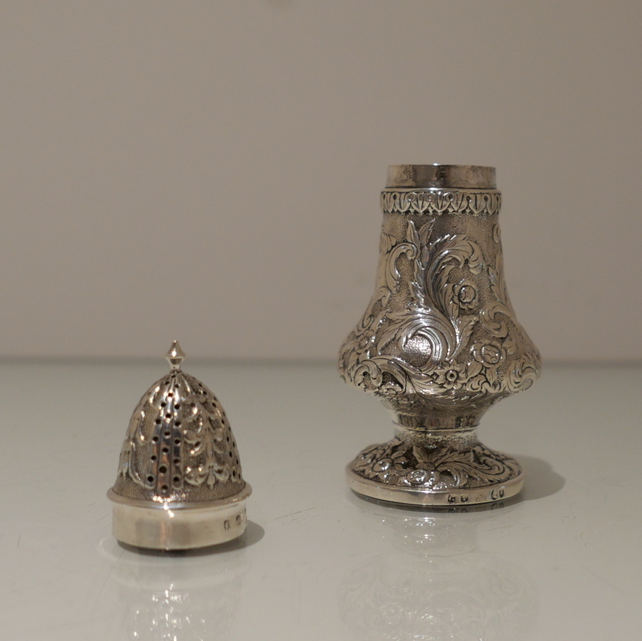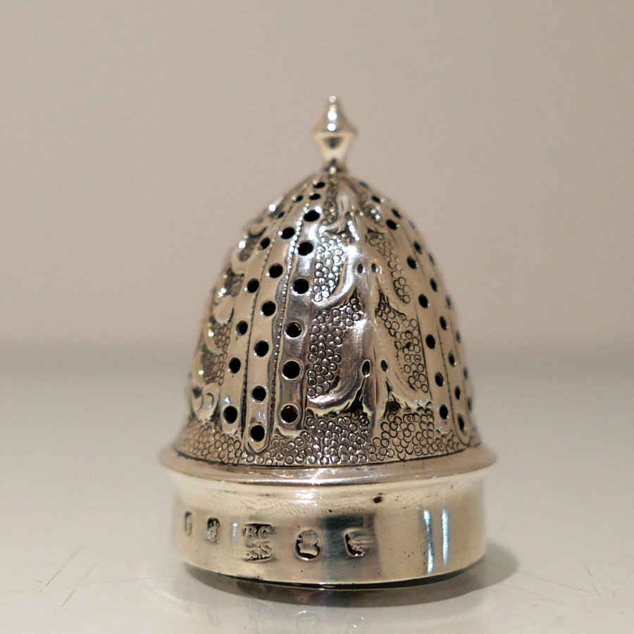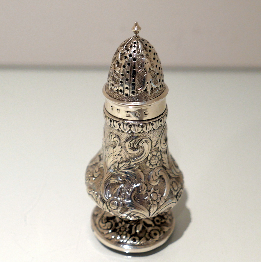 A very rare and highly collectable late Georgian sugar caster designed with a beautiful tapering body which then flows into a gorgeous bulbous bowl. Â The original floral embellishments are set on a matt background for a decorative visual contrast. Â The centre front has an elegant cartouche in which sits hand engraved contemporary initials.