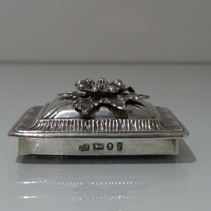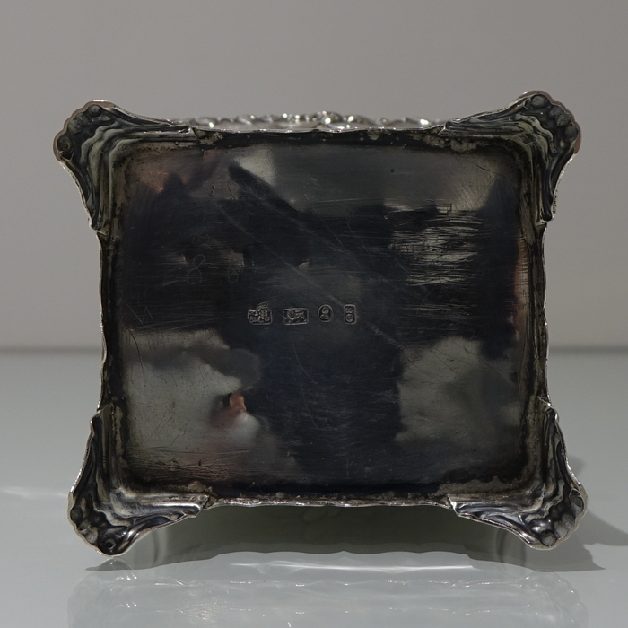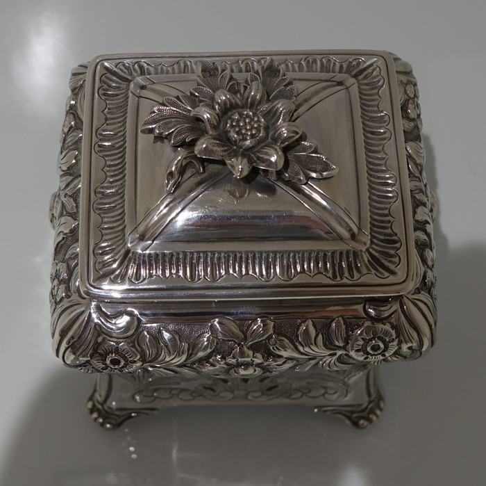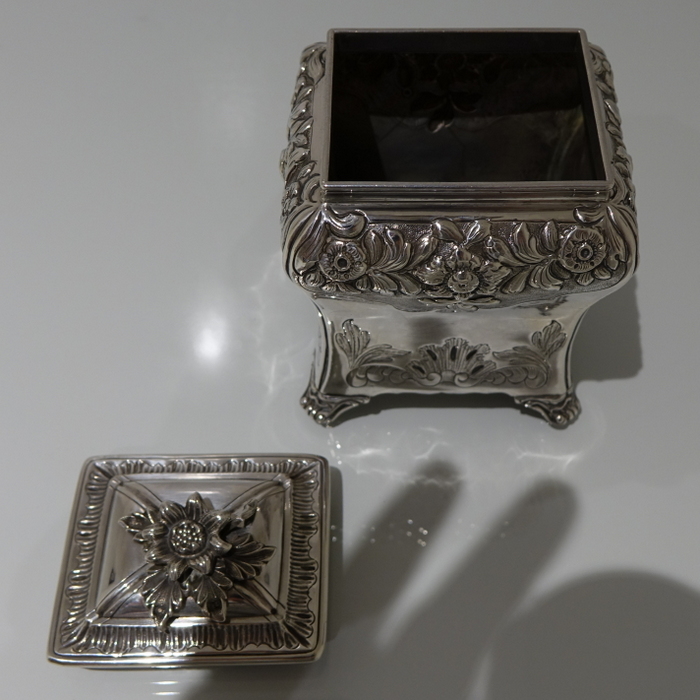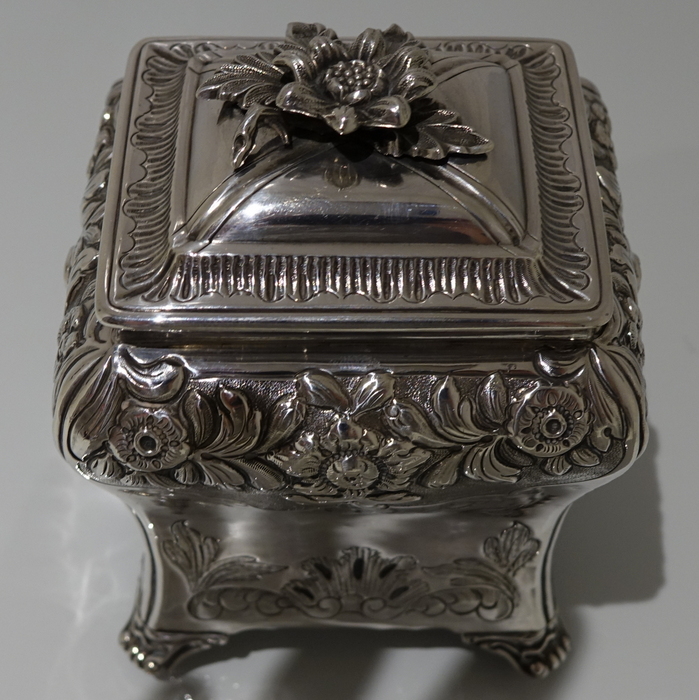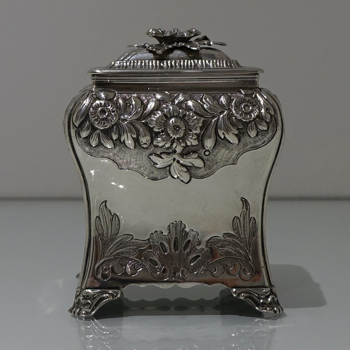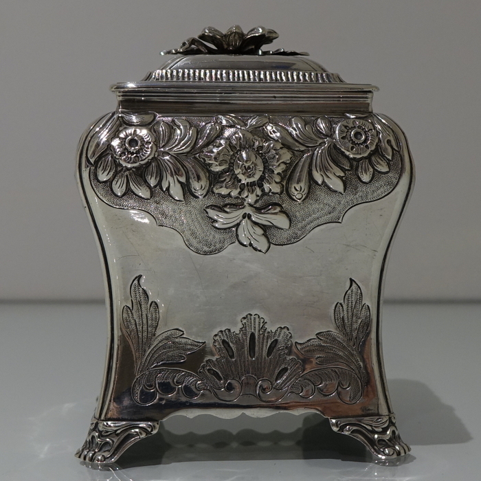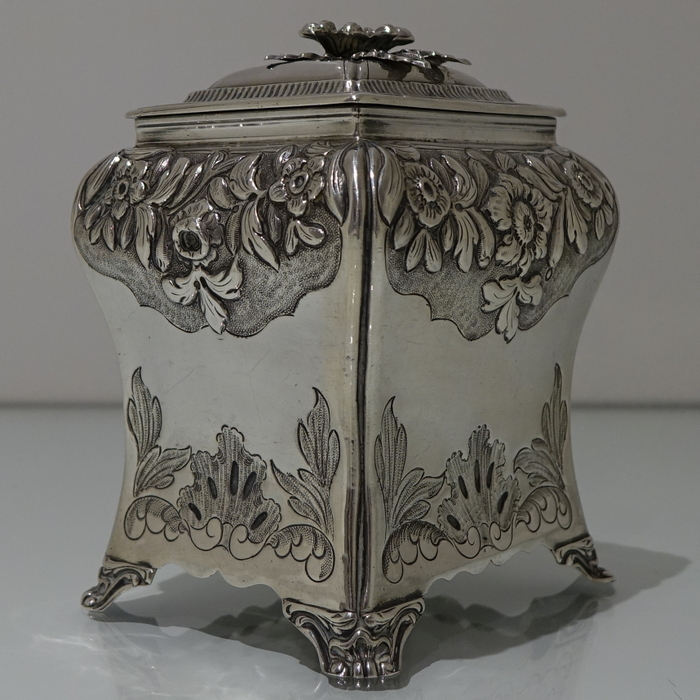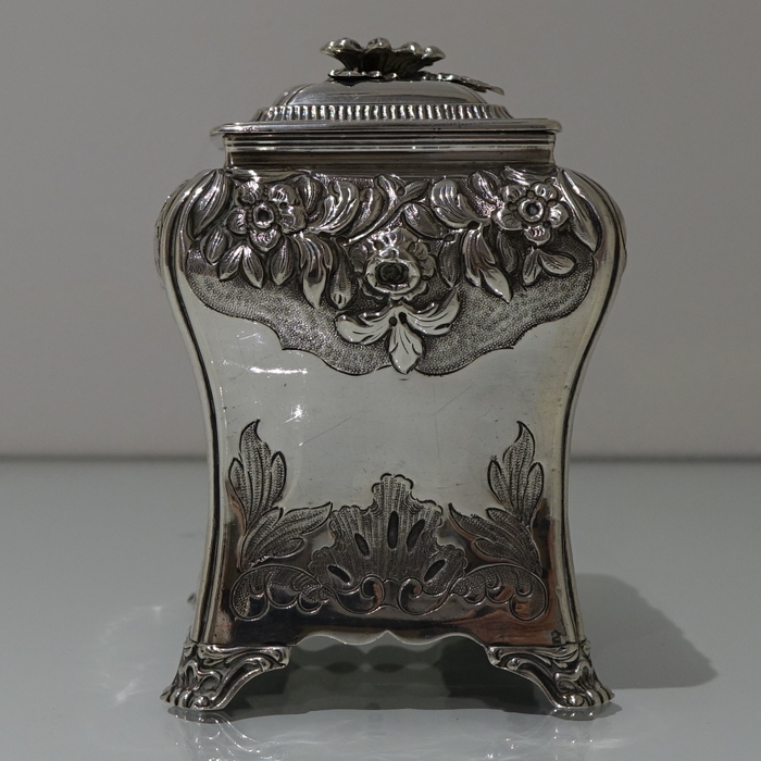 A stunning Georgian tea caddy which is elegantly hand chased on the upper section of the body with foliate decoration highlighted on a matt background. The lower section of the body has beautiful floral engraving for lowlights. The caddy sits on four ornate feet and the lid is detachable.