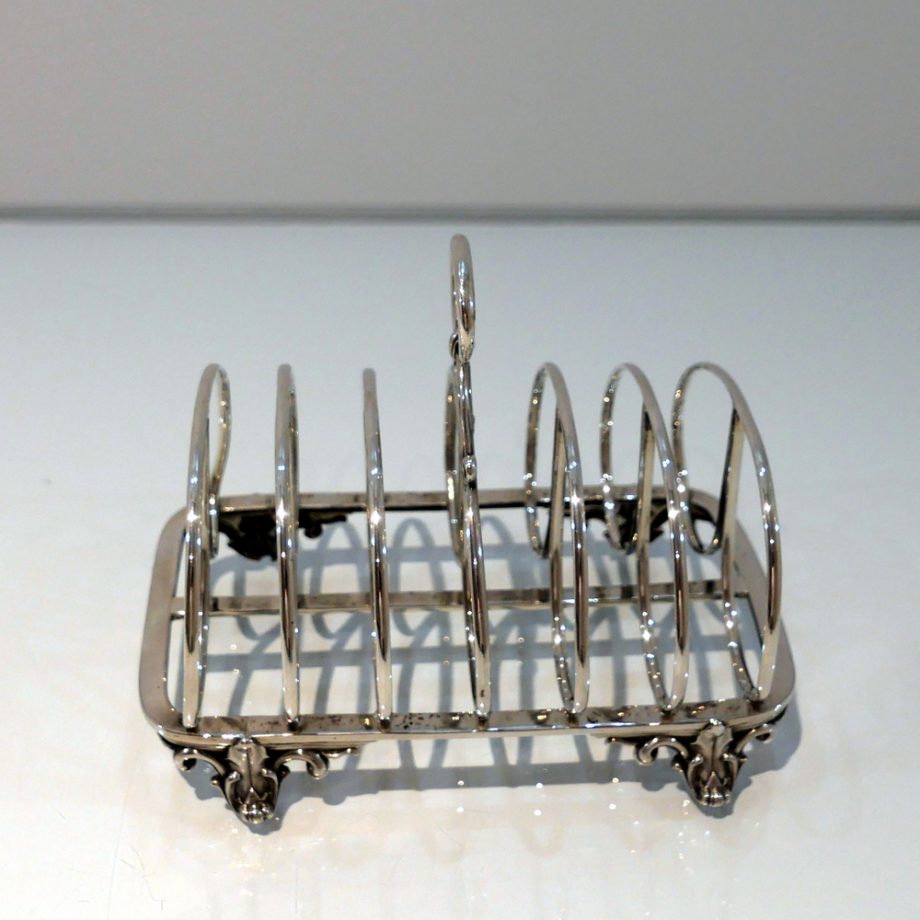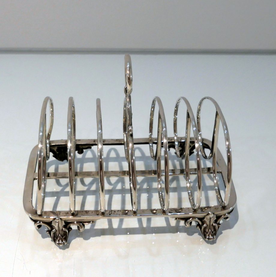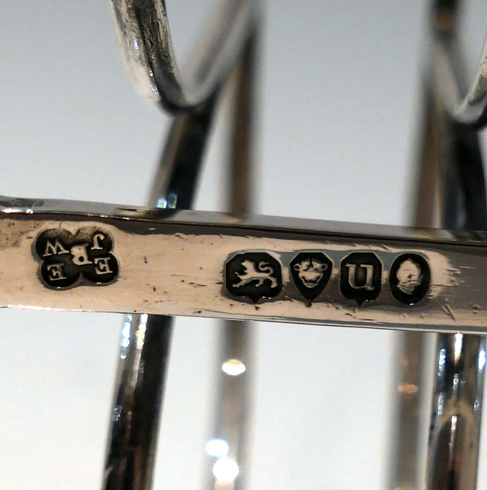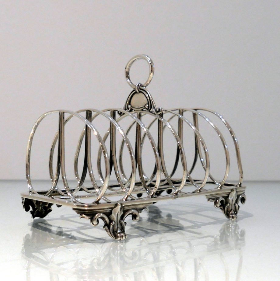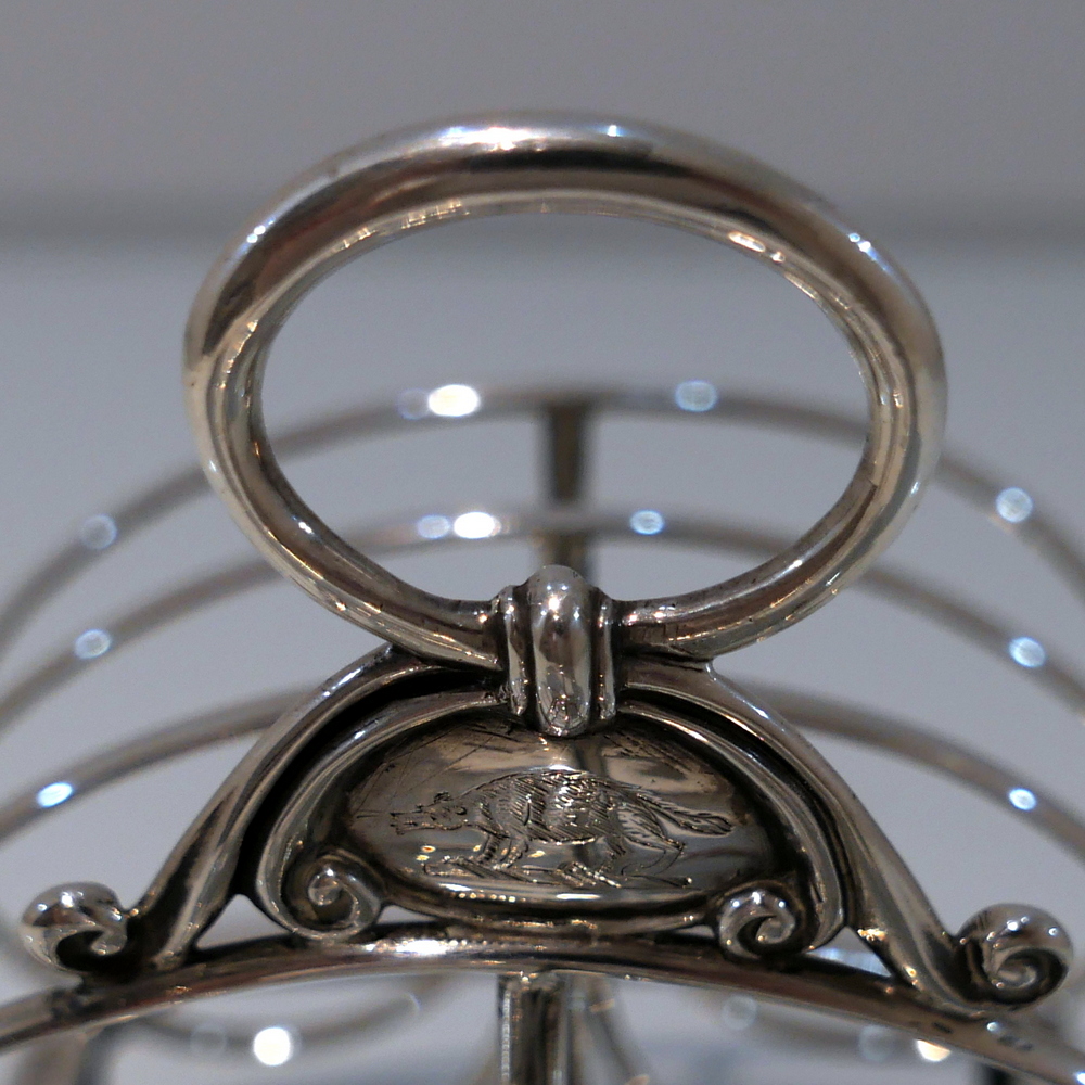 A delightful early 19th century silver rectangular seven bar toast rack elegantly designed with shaped wire place setting dividers. Â The central ring handle has a contemporary hand engraved motif underneath and the toast rack sits on four stylish cast feet.