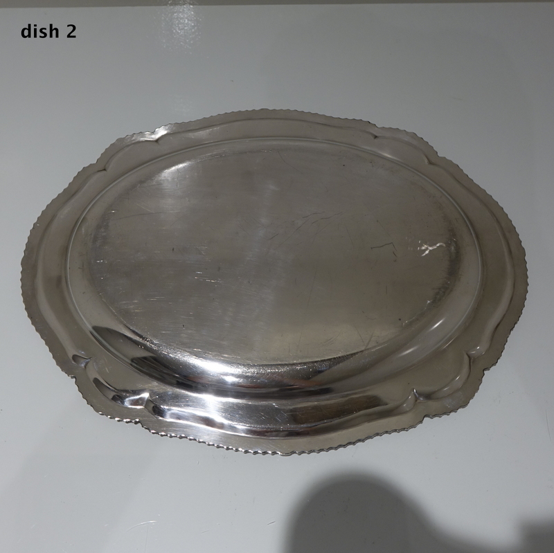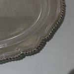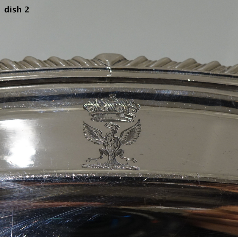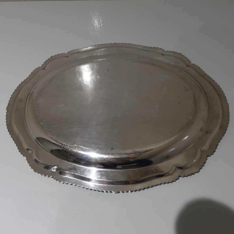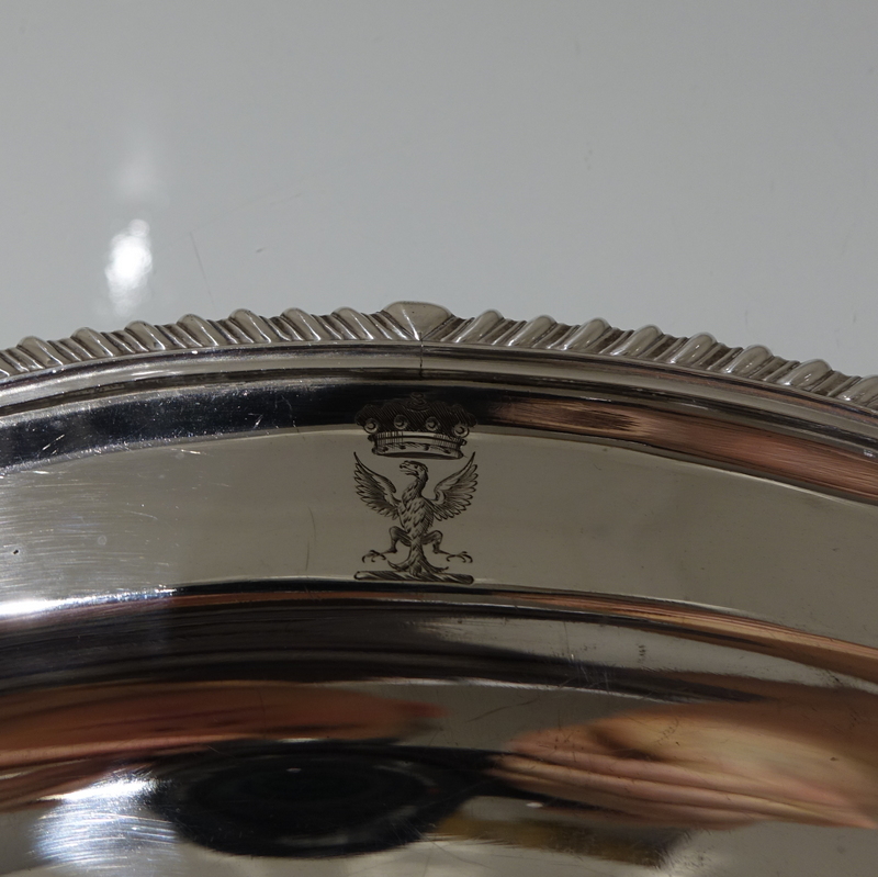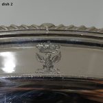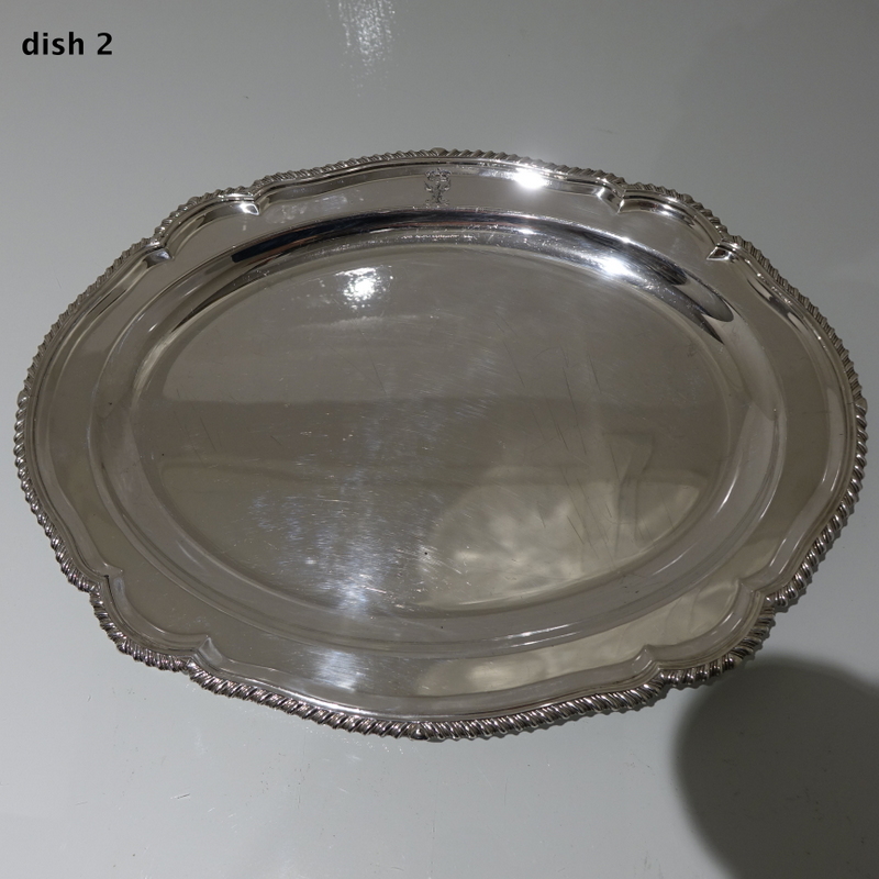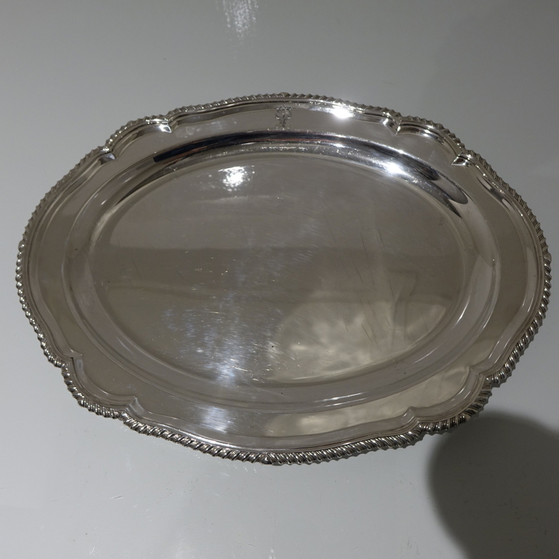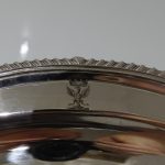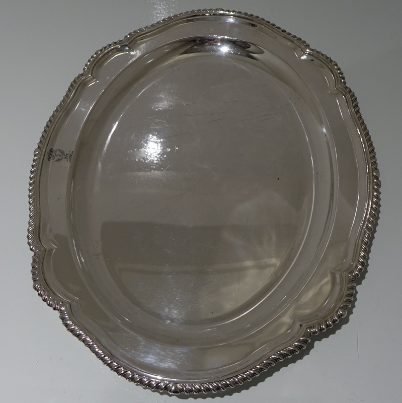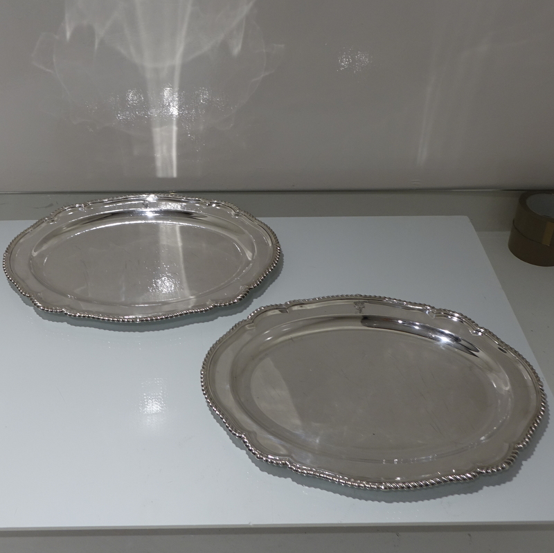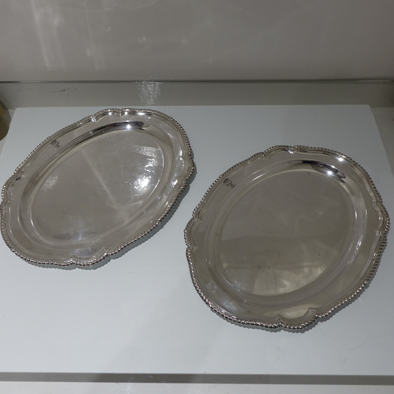 A large pair of 19th century old Sheffield plate meat dishes shaped oval in design with applied gadroon borders for highlights. Â Both dishes have elegant contemporary crests for importance.