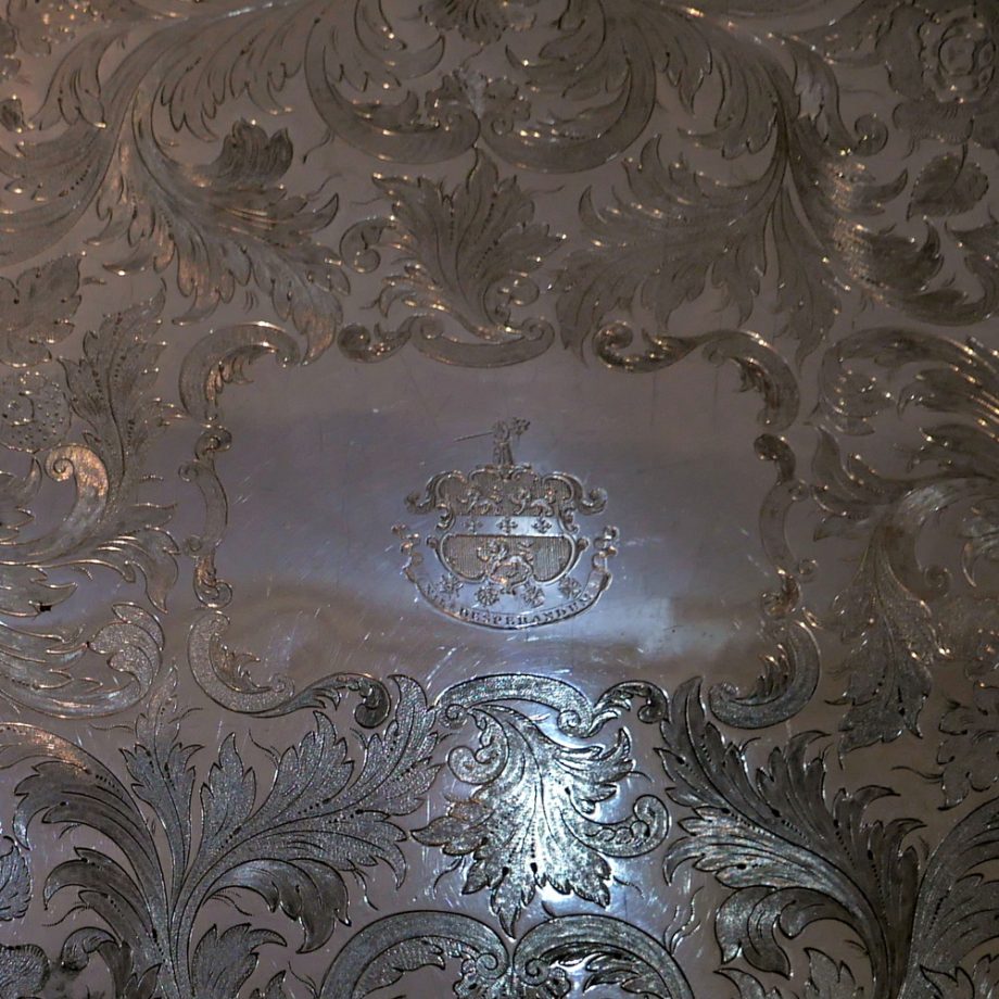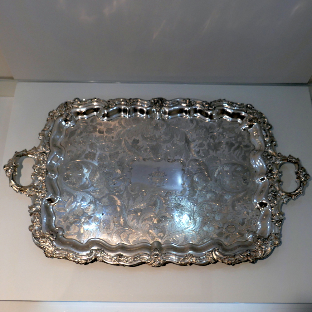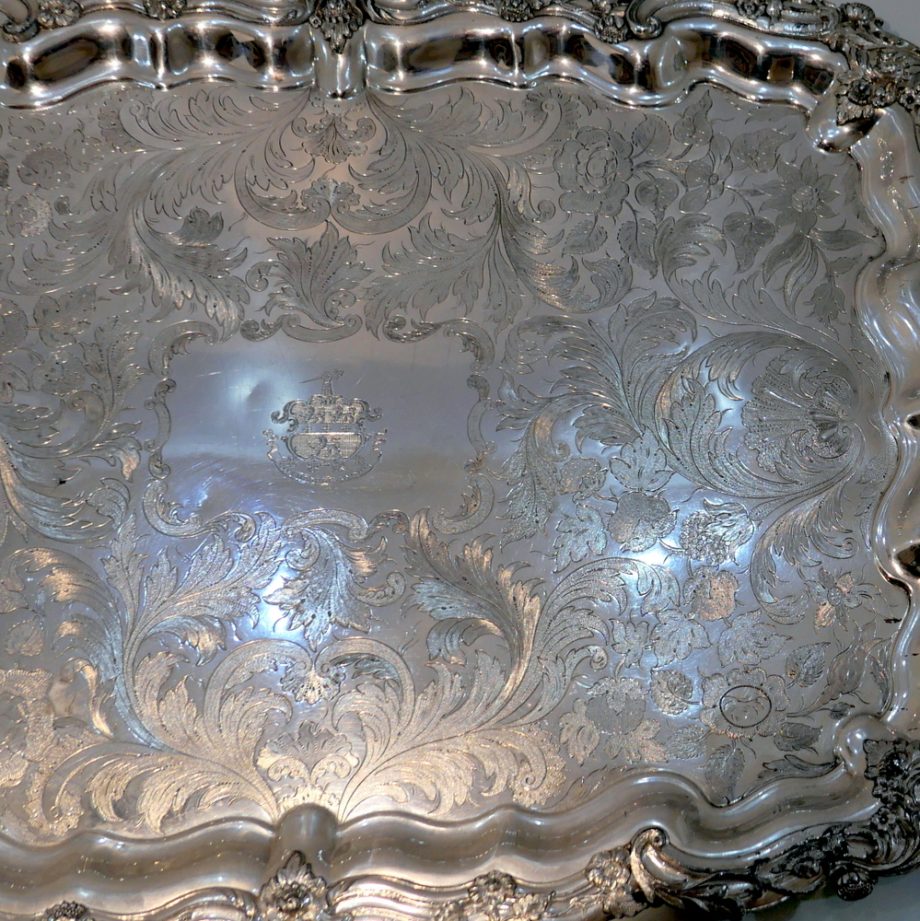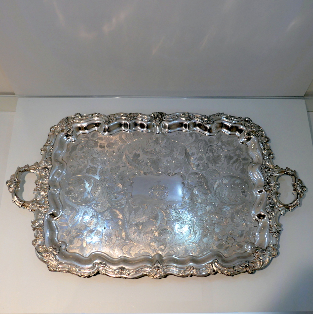 A large and extremely fine early 19th century Old Sheffield shaped oblong tea tray decorated with elegant floral engraving and a central silver “shield” which has a elegant contemporary armorial for importance. Â The heavily ornate outer border were very popular in that period of time.