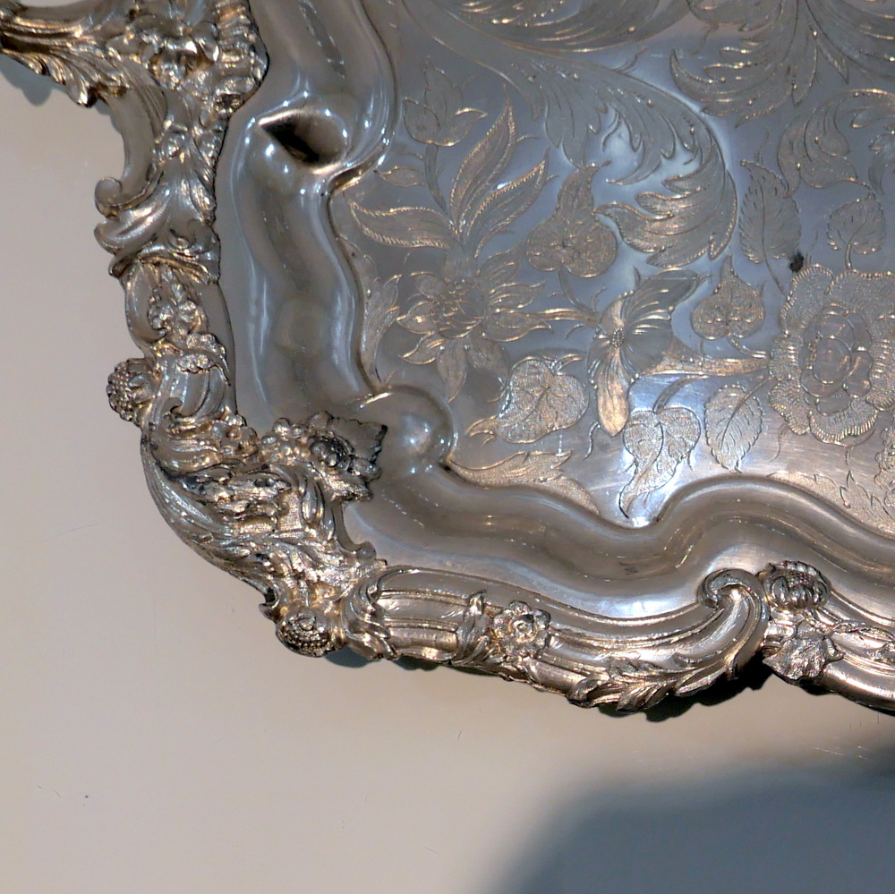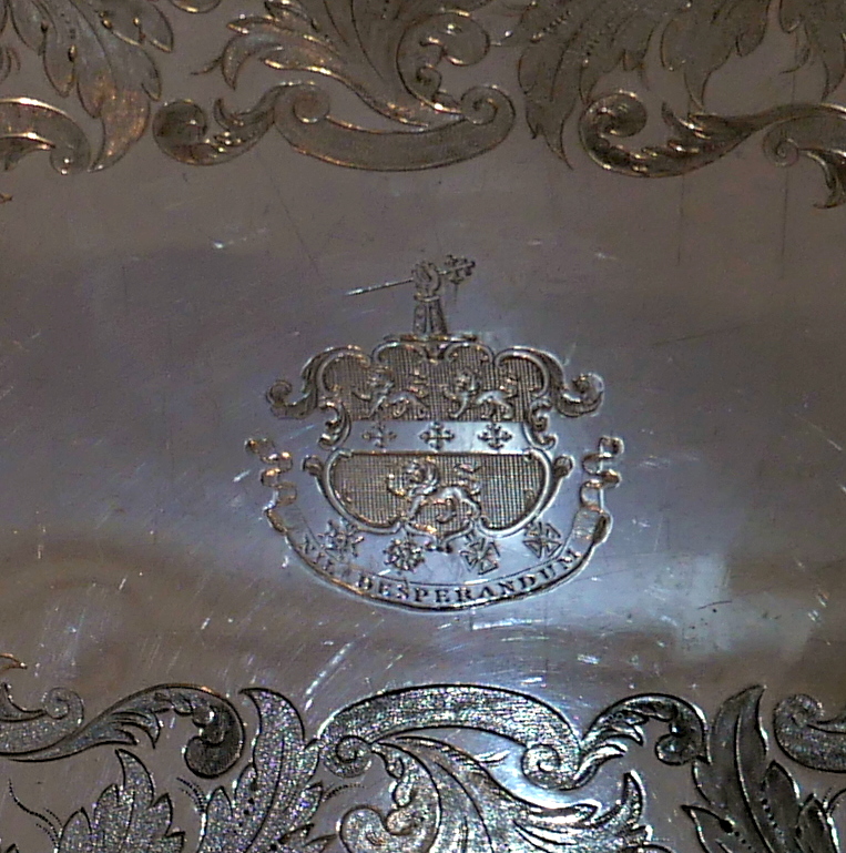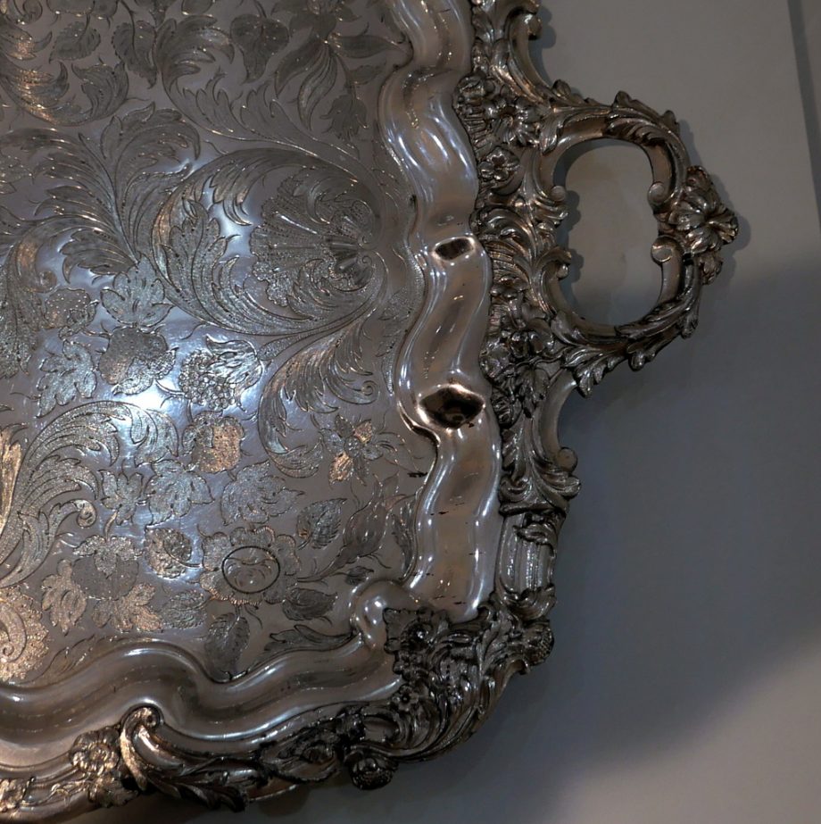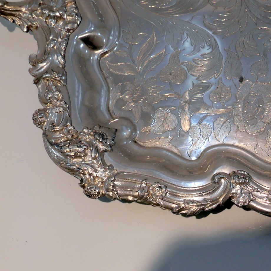 A large and extremely fine early 19th century Old Sheffield shaped oblong tea tray decorated with elegant floral engraving and a central silver “shield” which has a elegant contemporary armorial for importance. Â The heavily ornate outer border were very popular in that period of time.