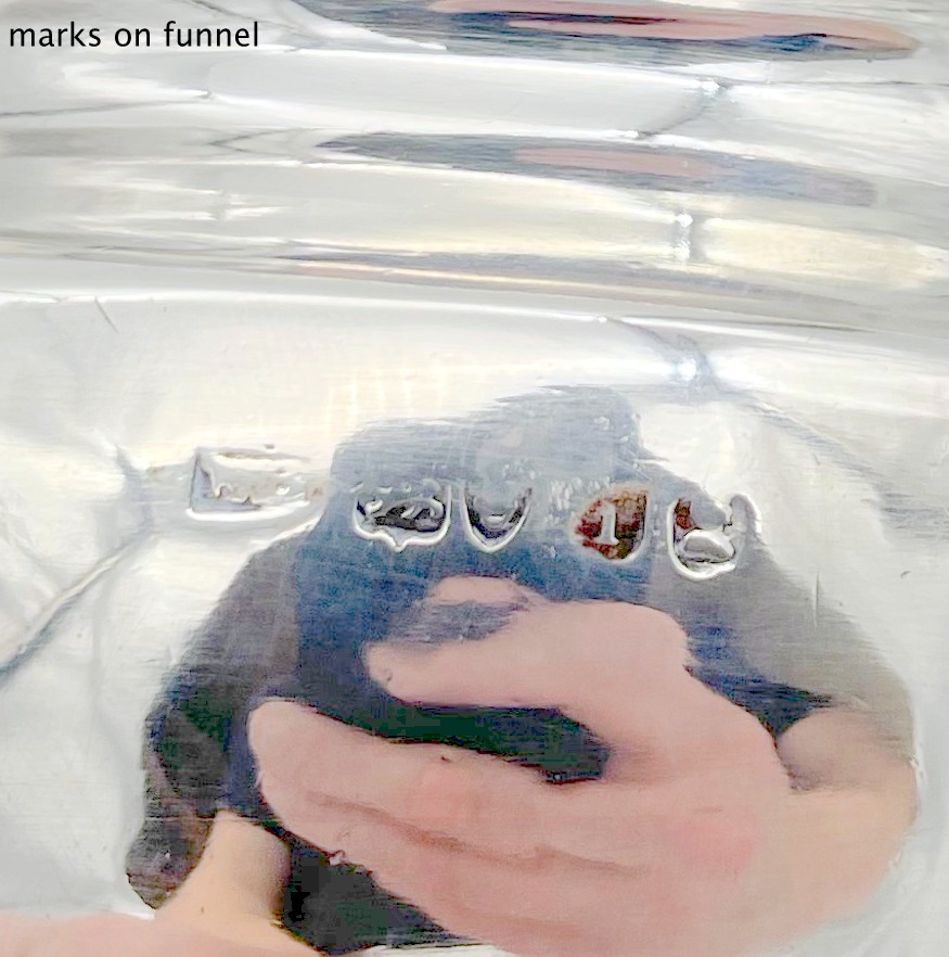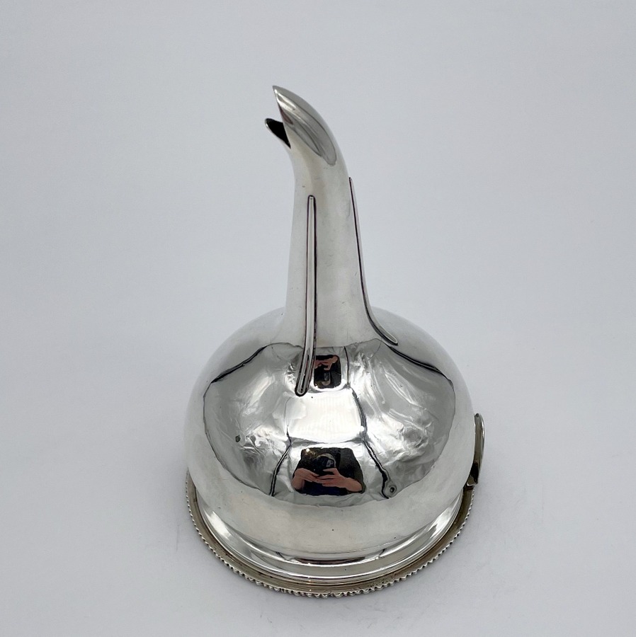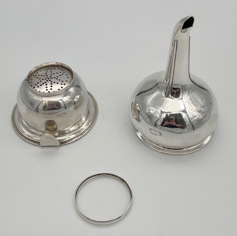 A wonderful Georgian silver bulbous bowled wine funnel decorated with a splendid gadroon border strainer which has intricate pierced straining holes. The funnel has elegant rib work for highlights.