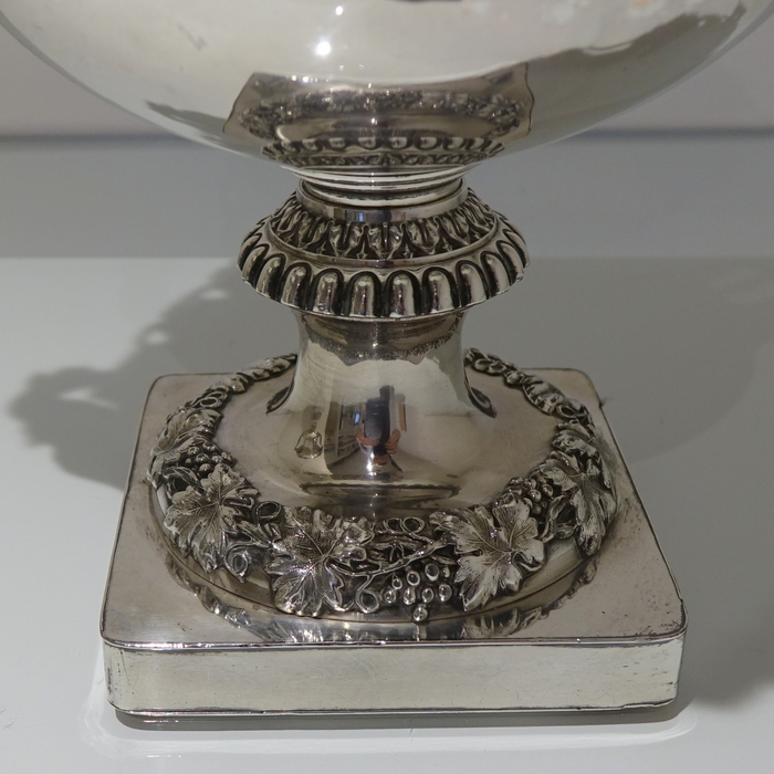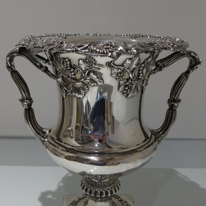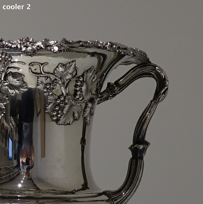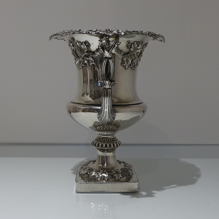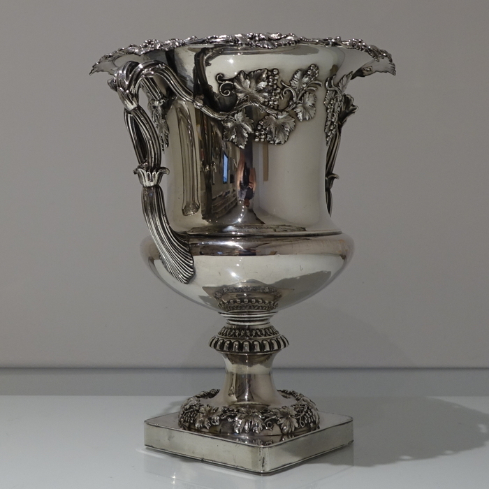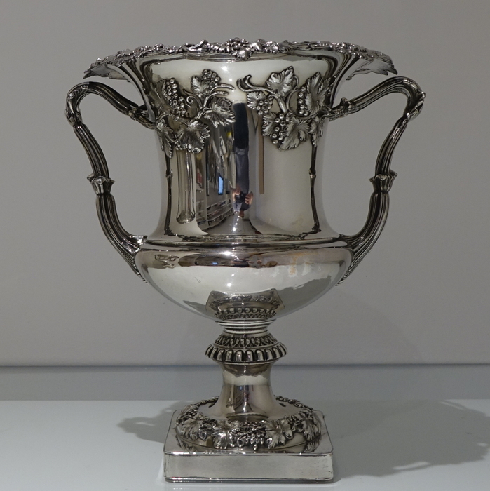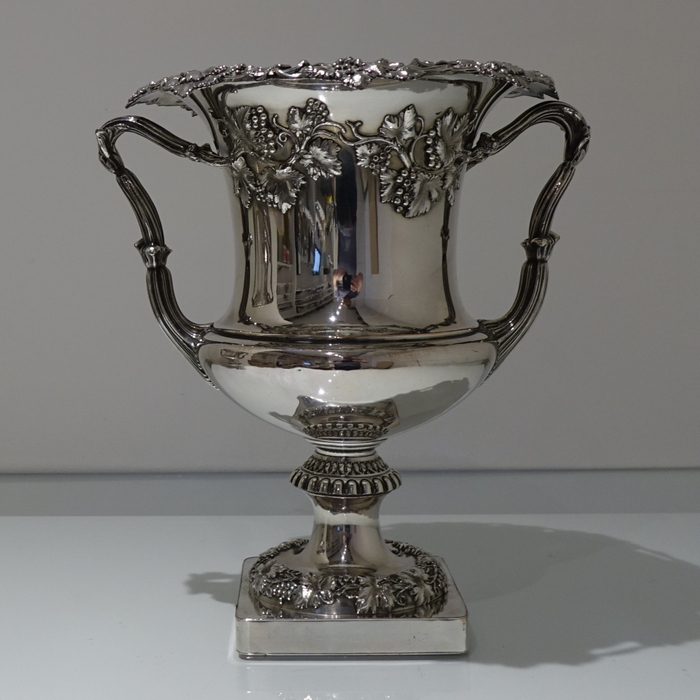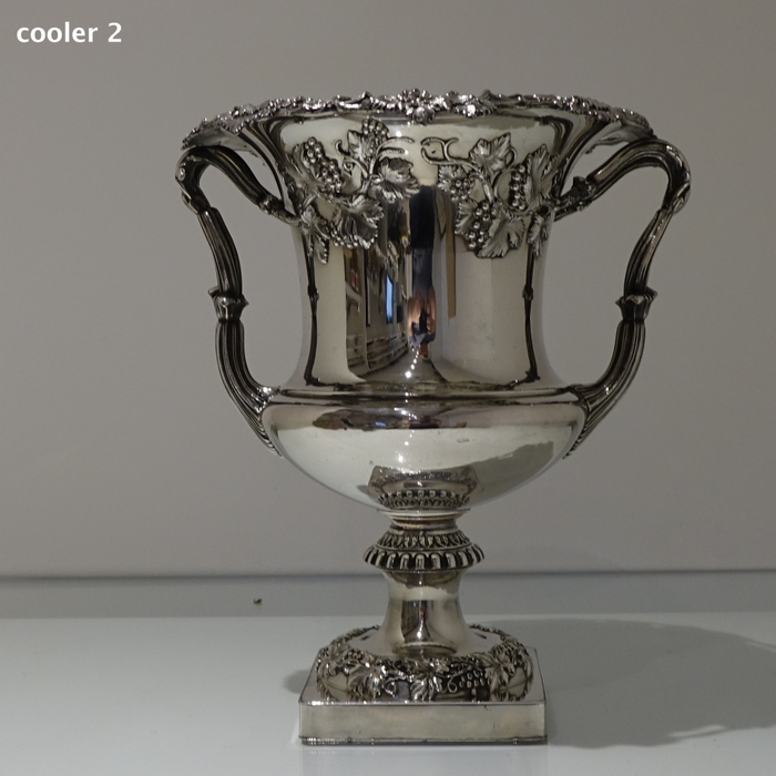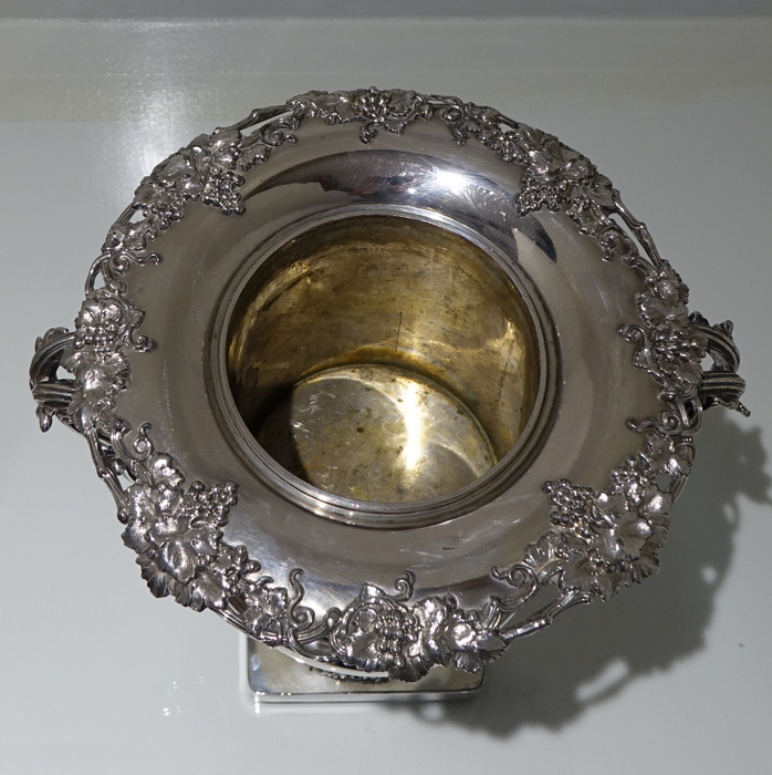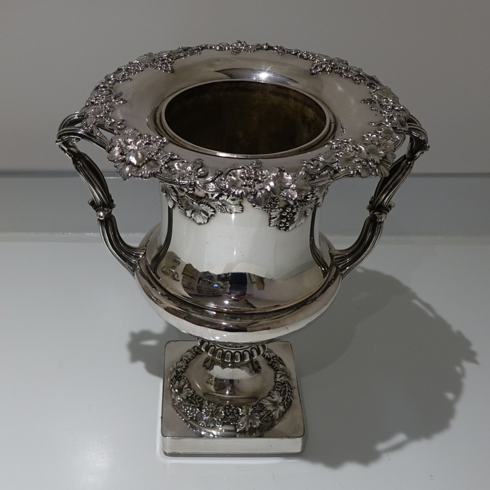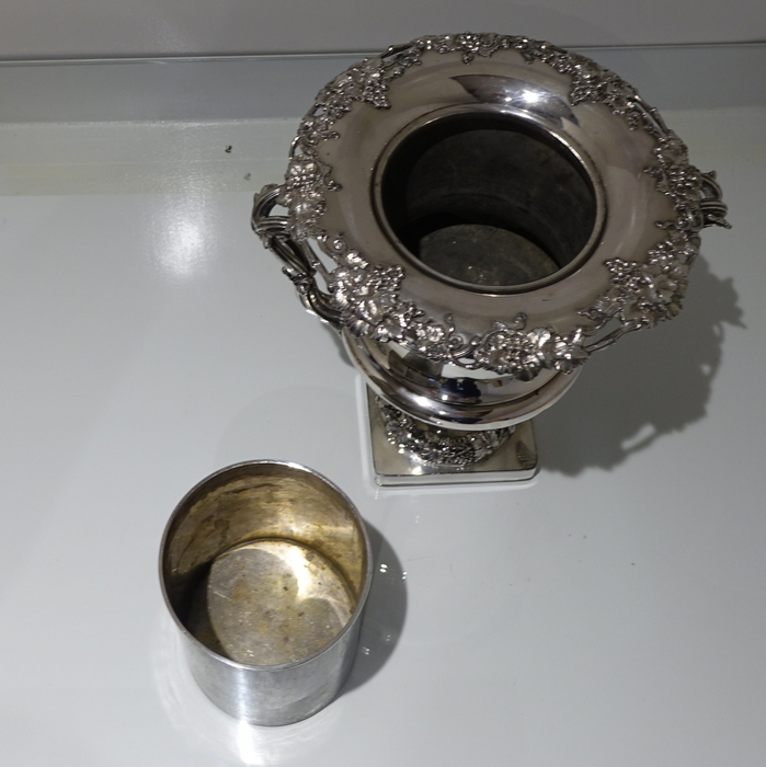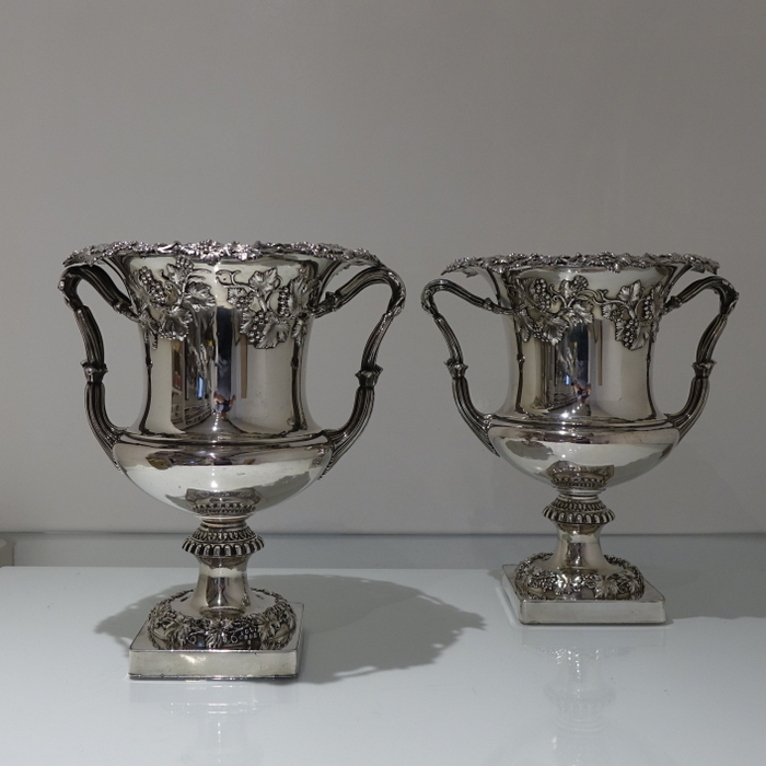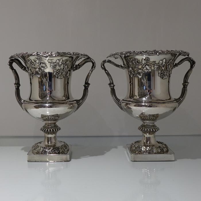 An elegant pair of 18th century old Sheffield wine coolers with ornate floral decoration to the upper section of the body and stylish handles. Â The foot is square with a single band of additional decoration for lowlights. Â The inner buckets are removable.