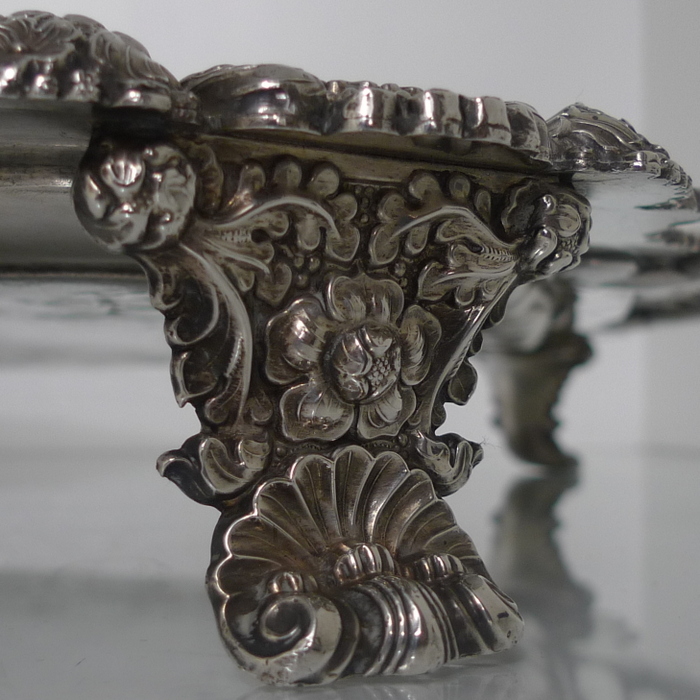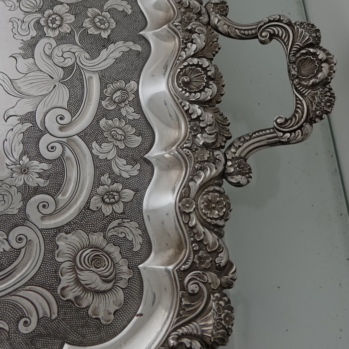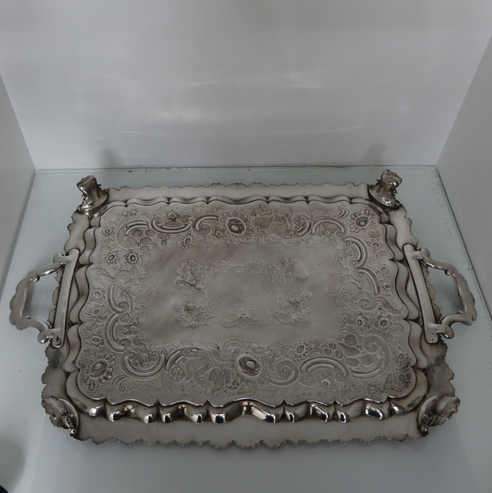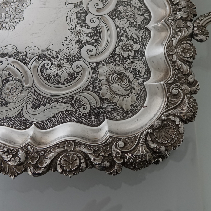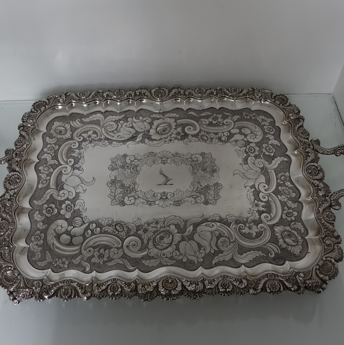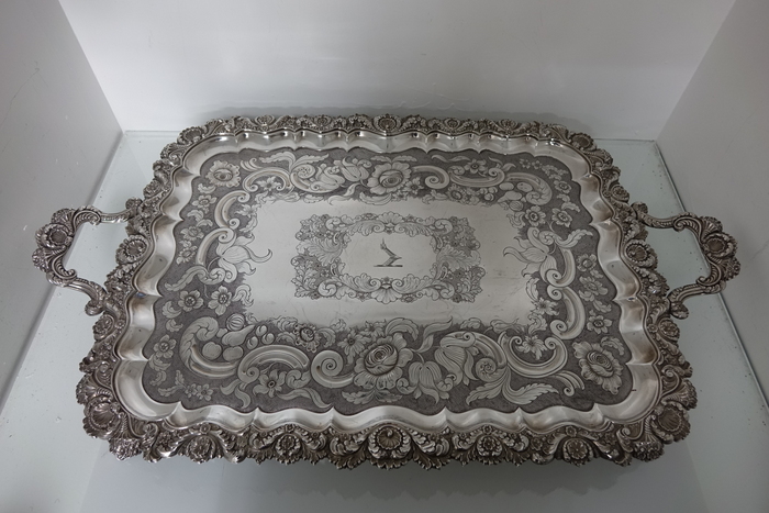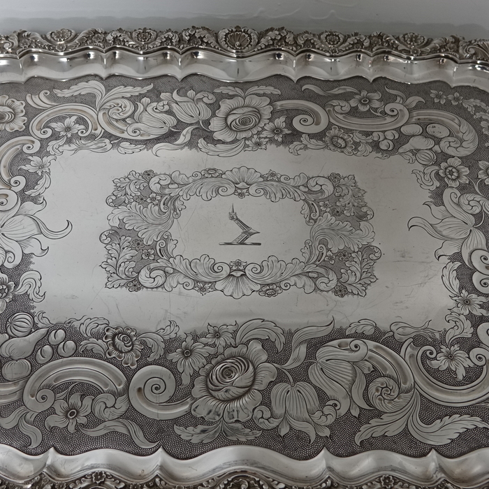 A very large and beautifully crafted Old Sheffield tray on four ornate feet.  The workmanship of the tray is stunning throughout with a very crisp floral and shell border for decorative highlights.  The base of the tray has  additional floral and shell engraving set on a stylish matt background.  The centre of the tray has a elegant cartouche in which sits a beautiful crest for importance.