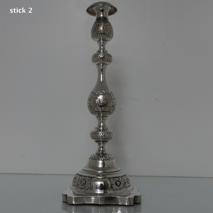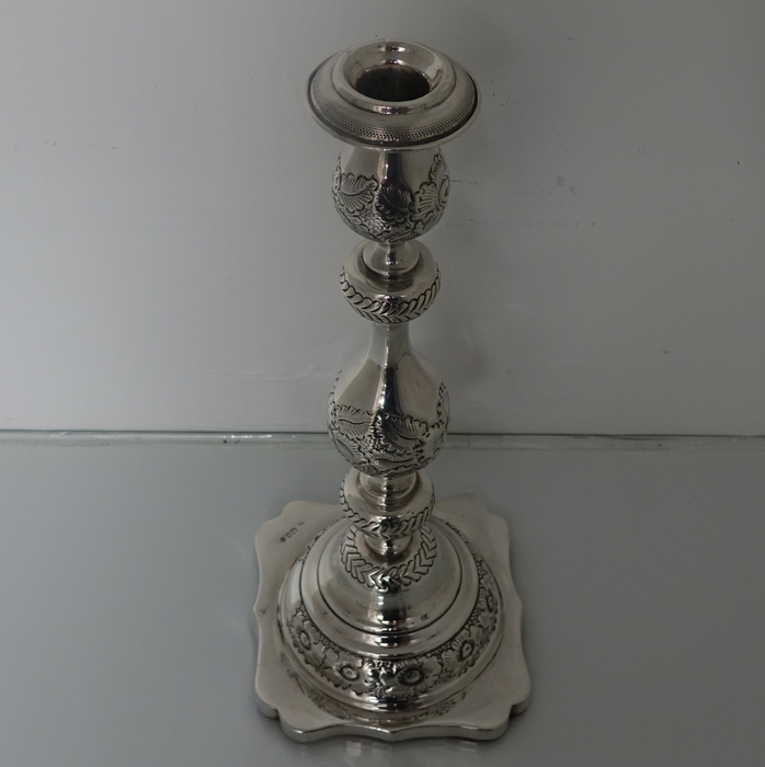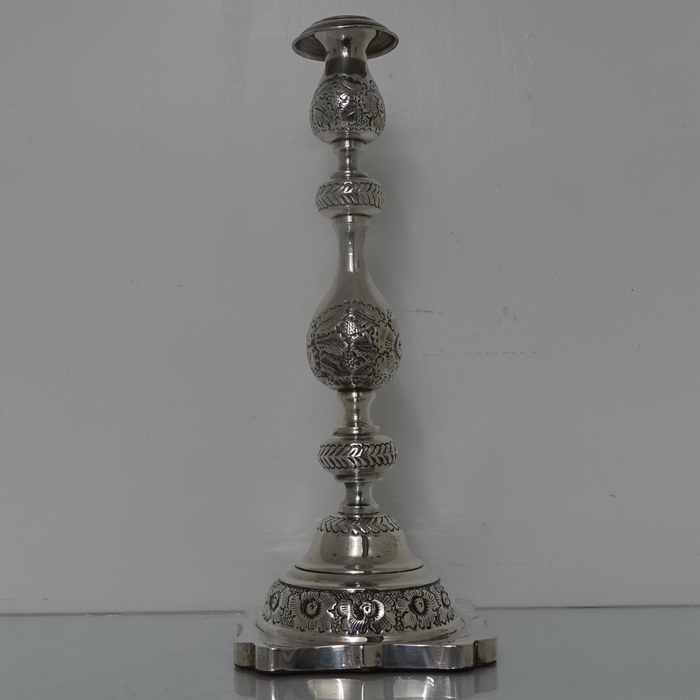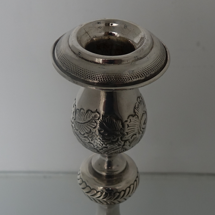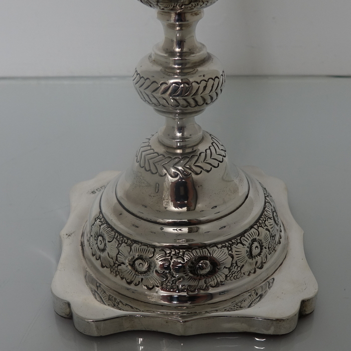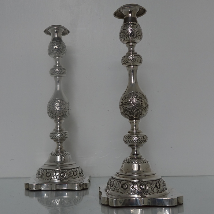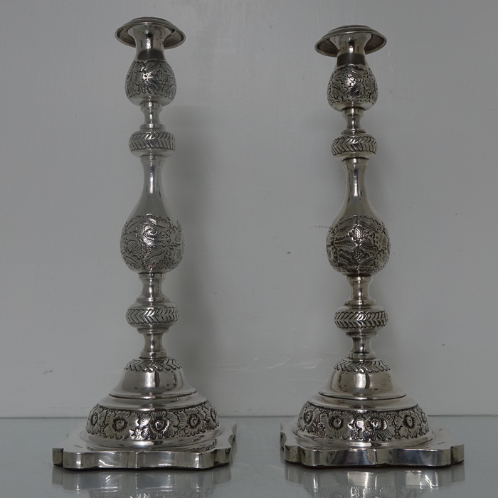 A very elegant pair of large silver sabbath candlesticks with beautiful floral embossing for decoration. The sticks have shaped square bases which have been filled. Â The nozzles are detachable and have stylish engraving for highlights.