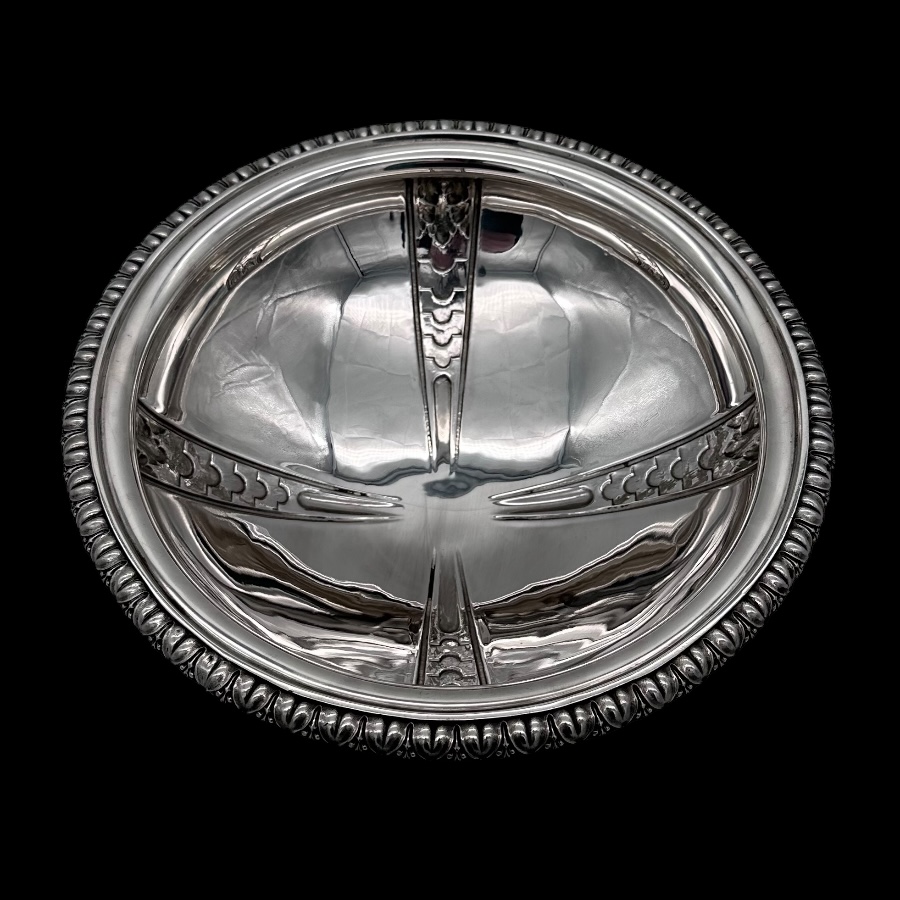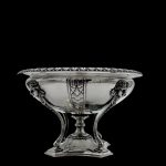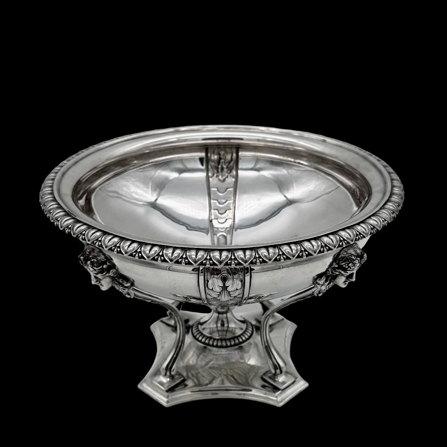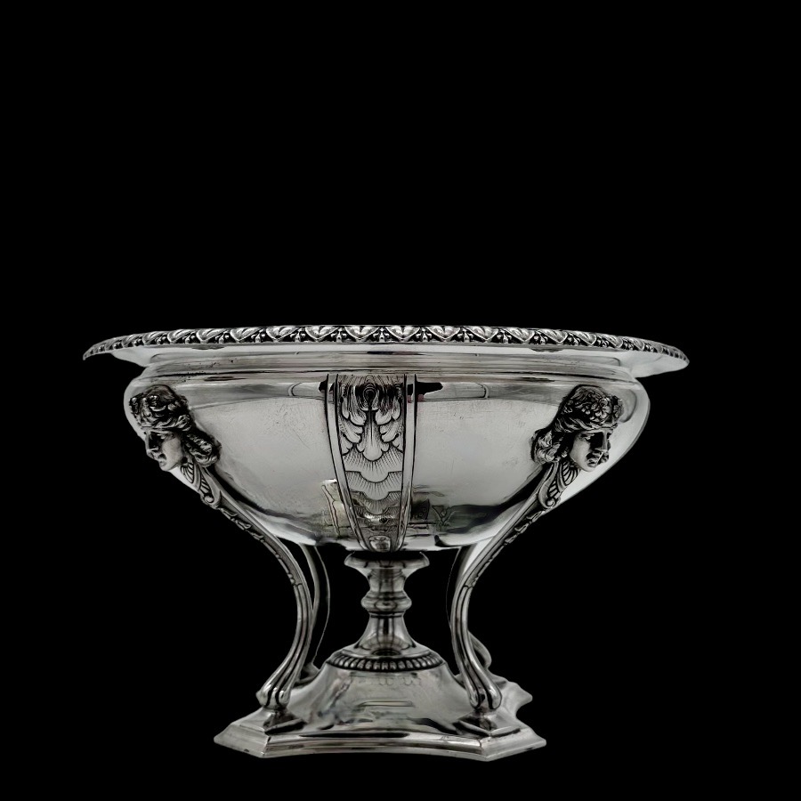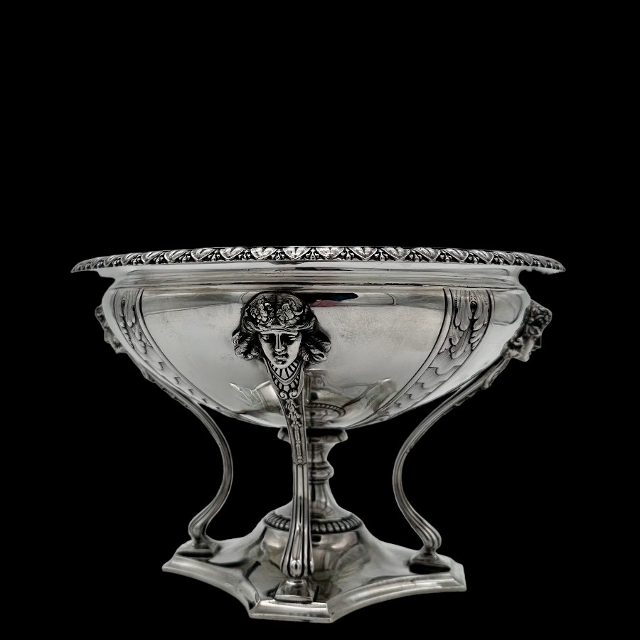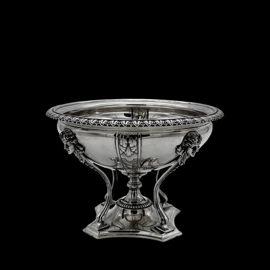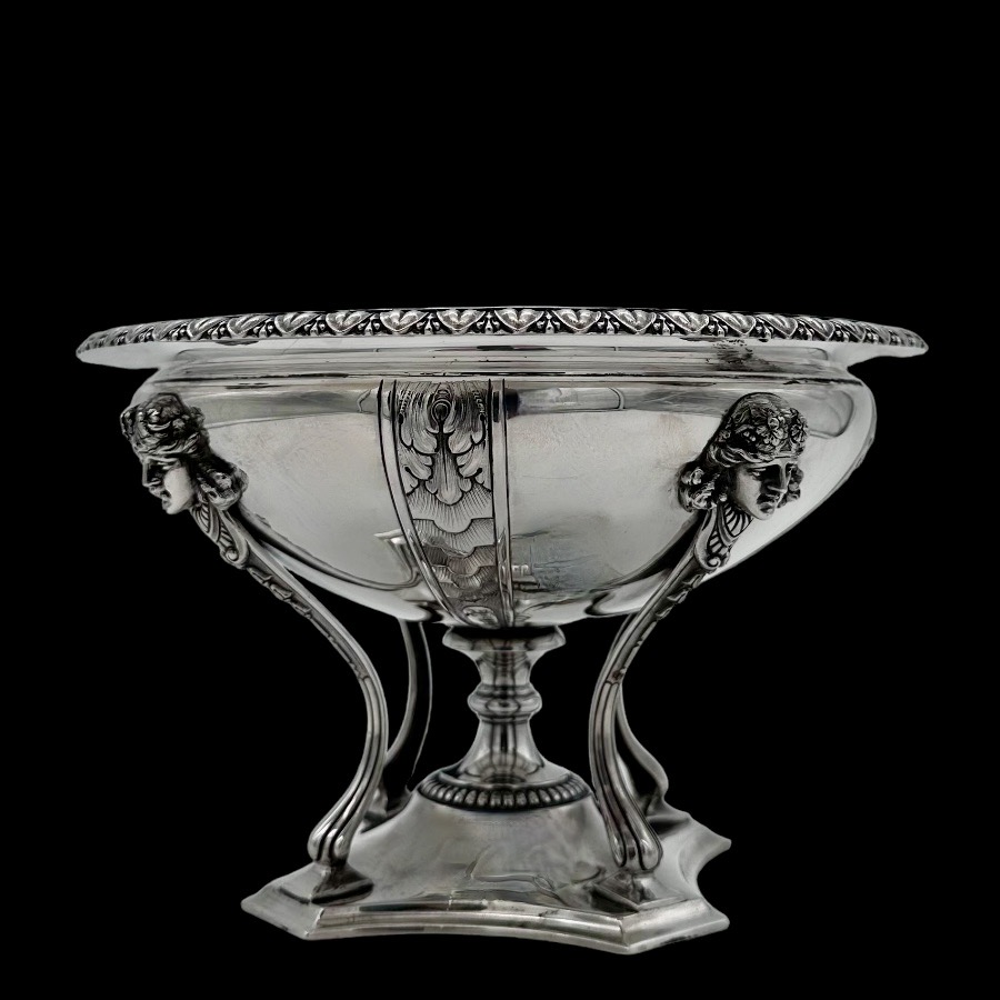 Rare and incredibly fine mid-sized silver bowl decorated with stylish embellished panels and an upper tulip style border. There are four elegant struts surmounted with stylish figural busts.