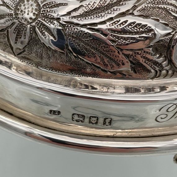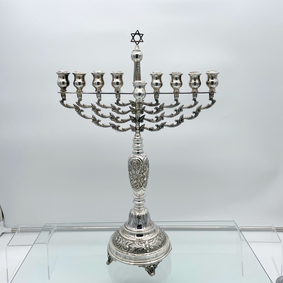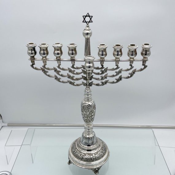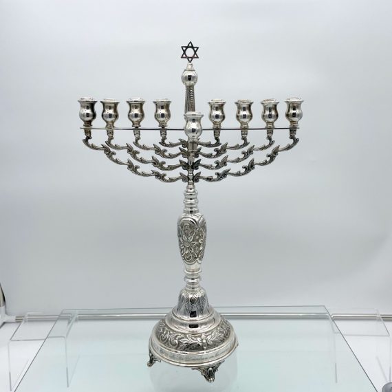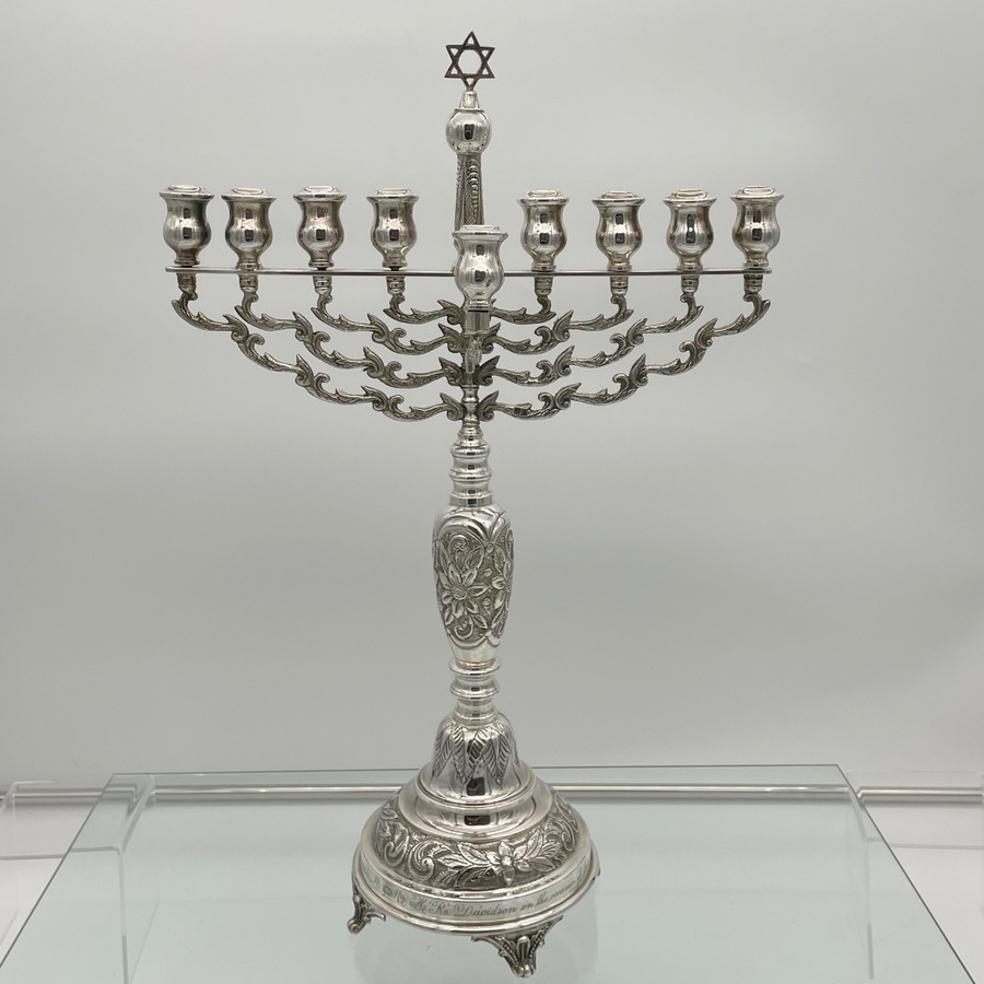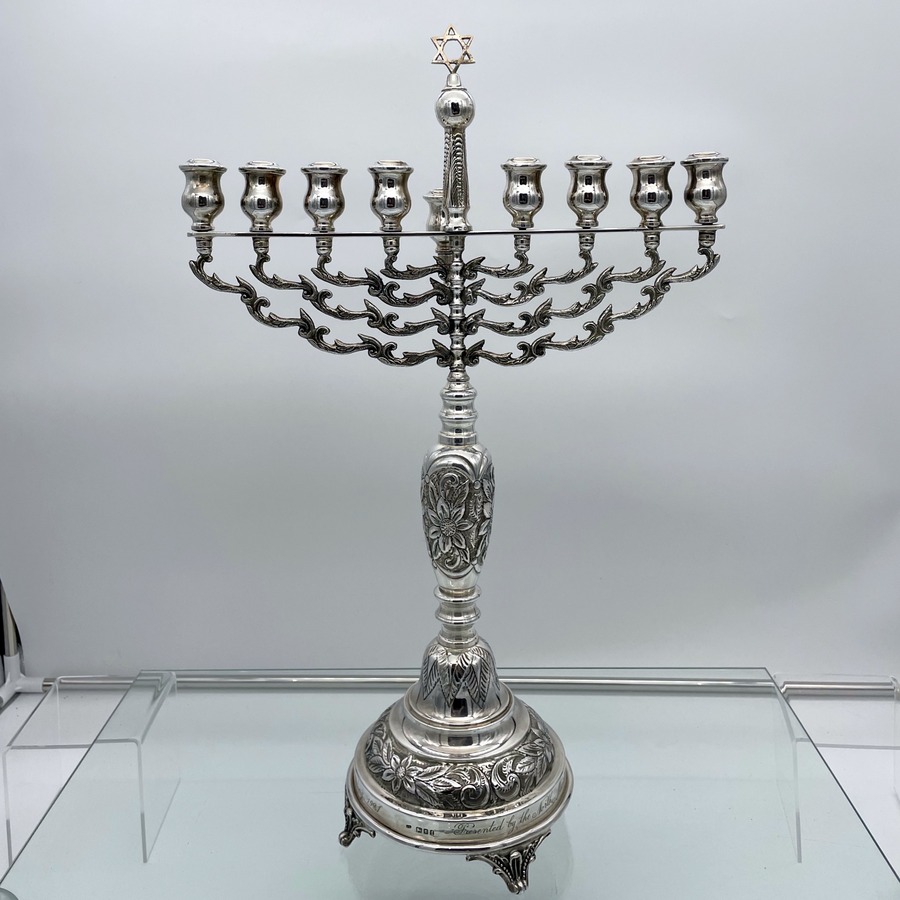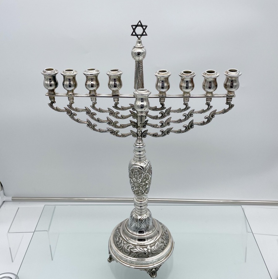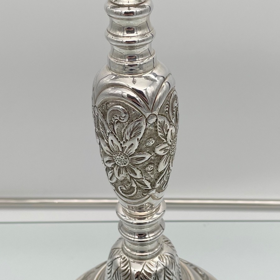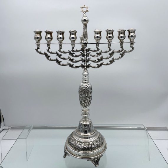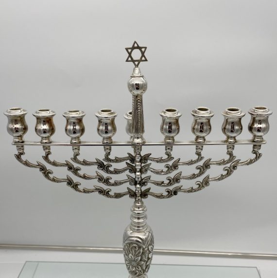 A large and highly desirable antique sterling silver menorah decorated with elegant floral embossing which is then set on a matt background for visual contrast. Â The branches have been fixed with a stylish rectangular bracket which also doubles as a drip pan.