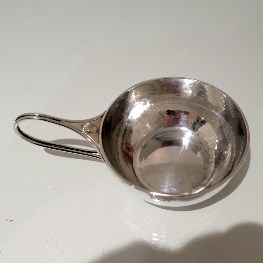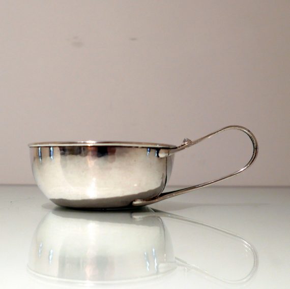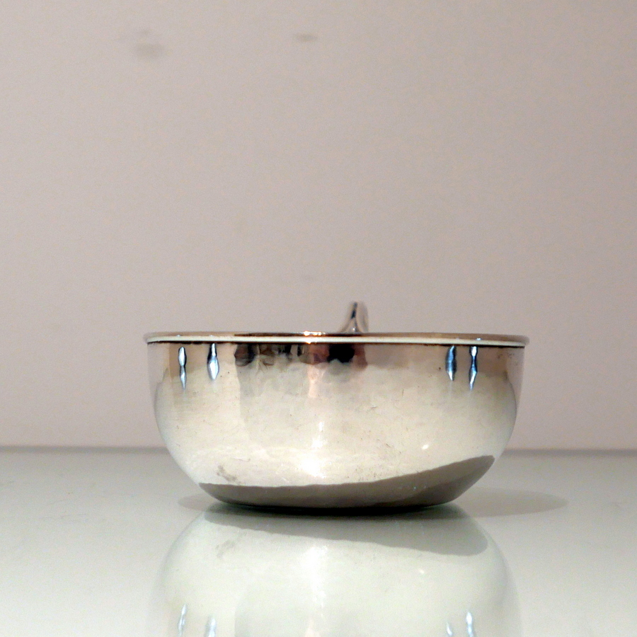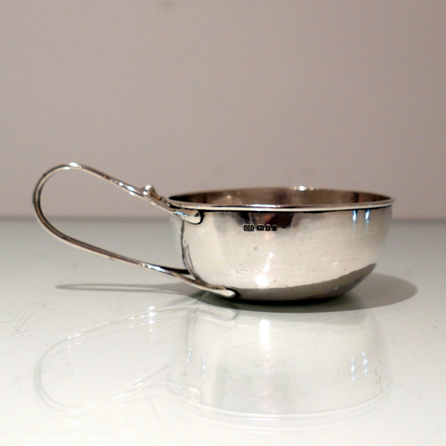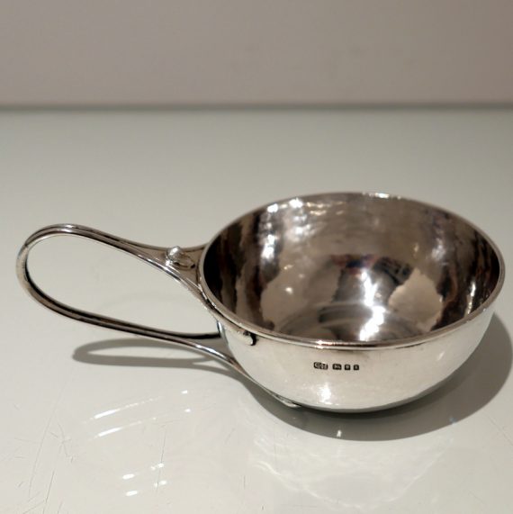 An incredibly rare and highly sort after arts and crafts sterling silver bowl/quaich designed with a beautifully hammered finished bowl and a stylish wire work handle that has been mounted with a stunning decorative inset stone for highlights.