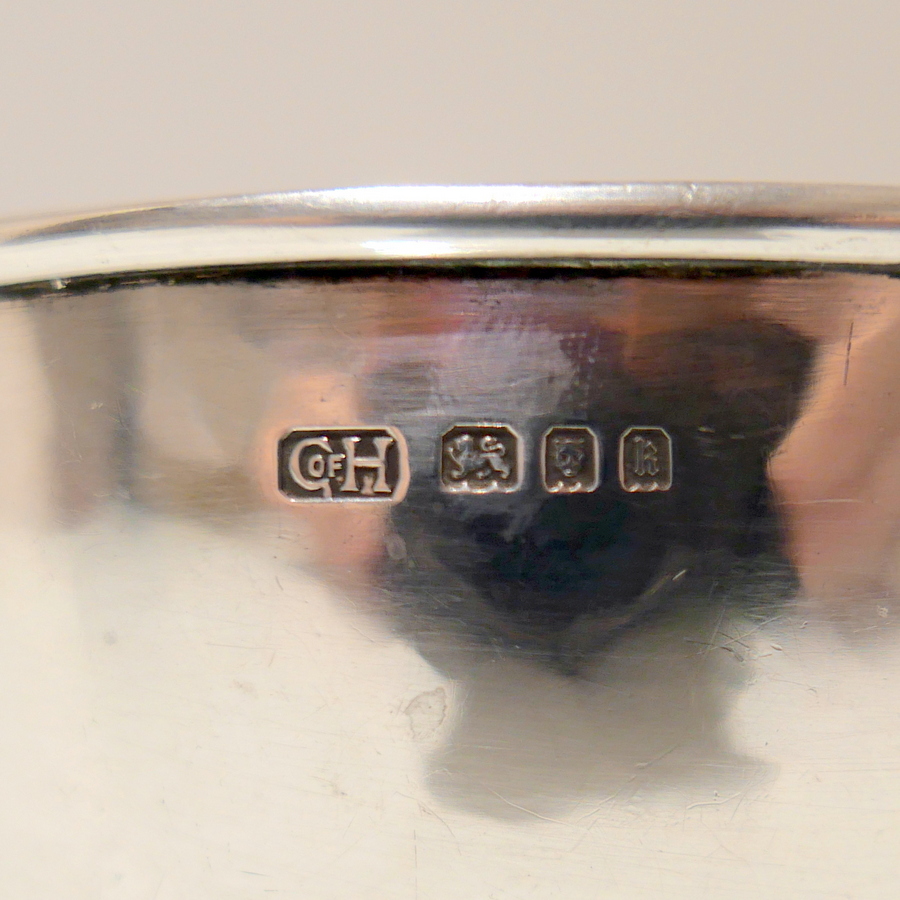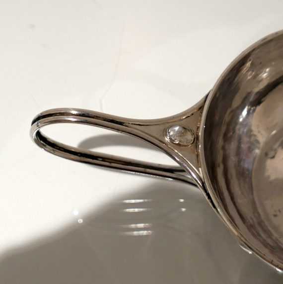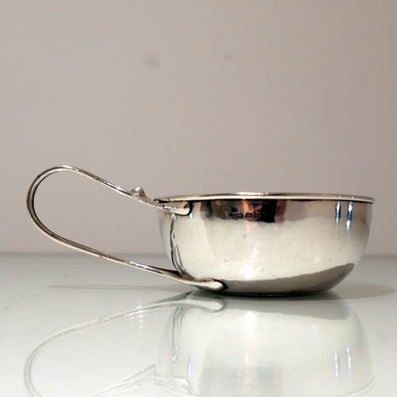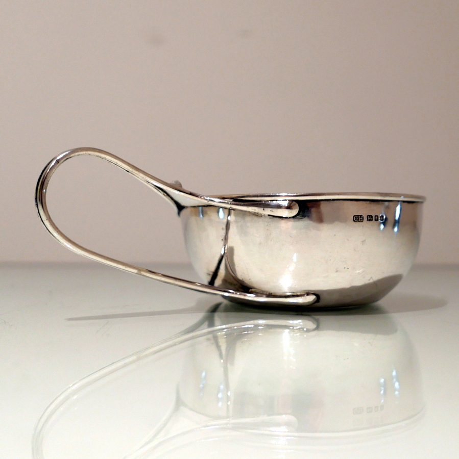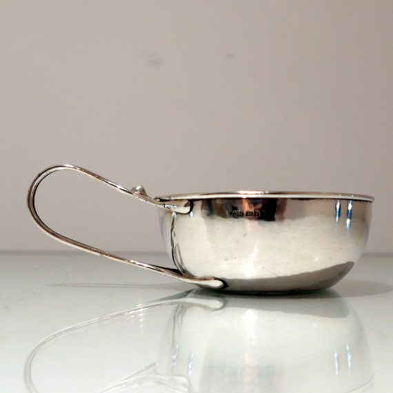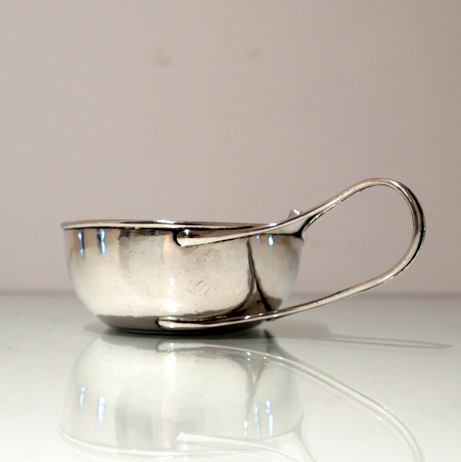 An incredibly rare and highly sort after arts and crafts sterling silver bowl/quaich designed with a beautifully hammered finished bowl and a stylish wire work handle that has been mounted with a stunning decorative inset stone for highlights.